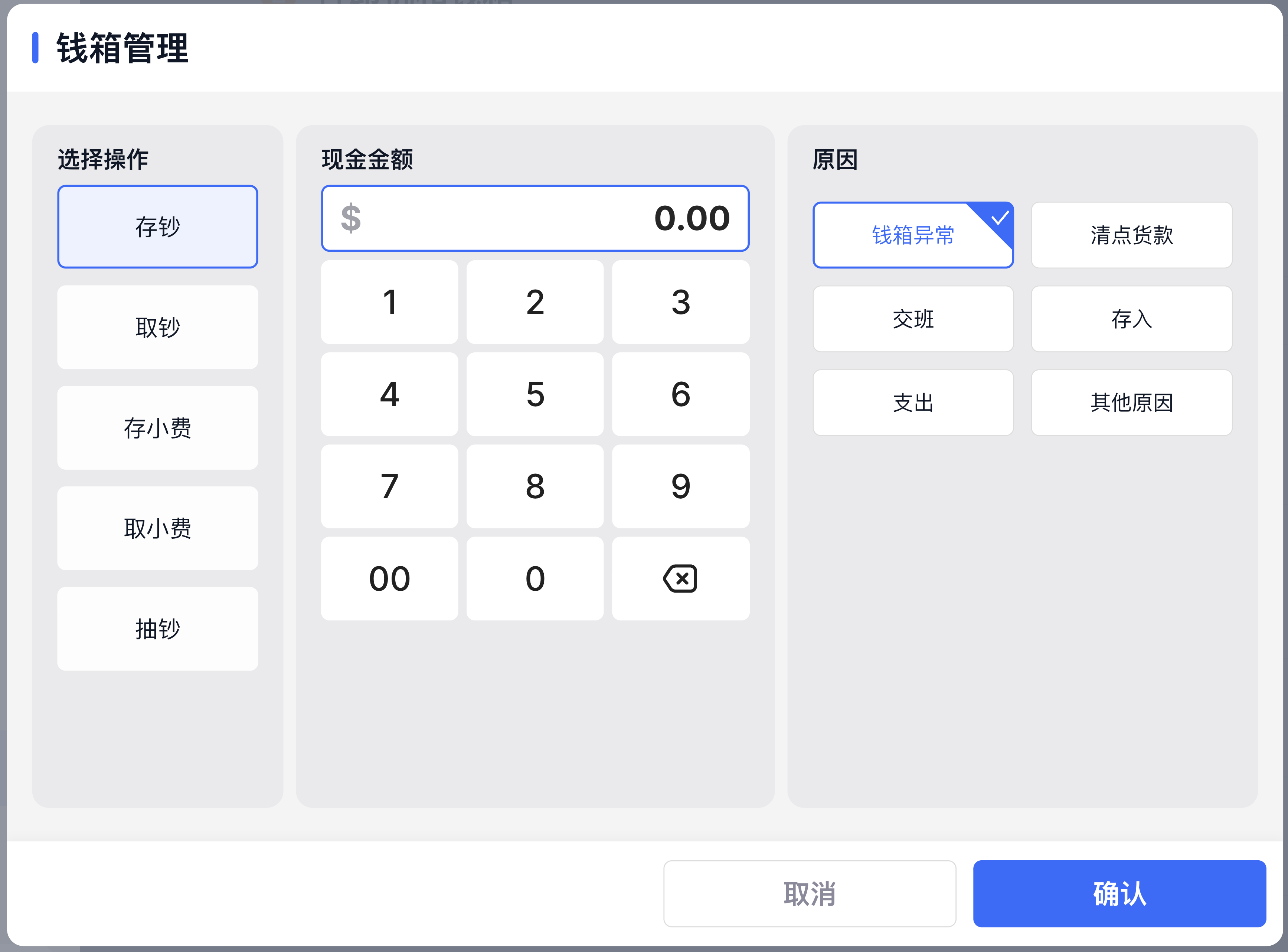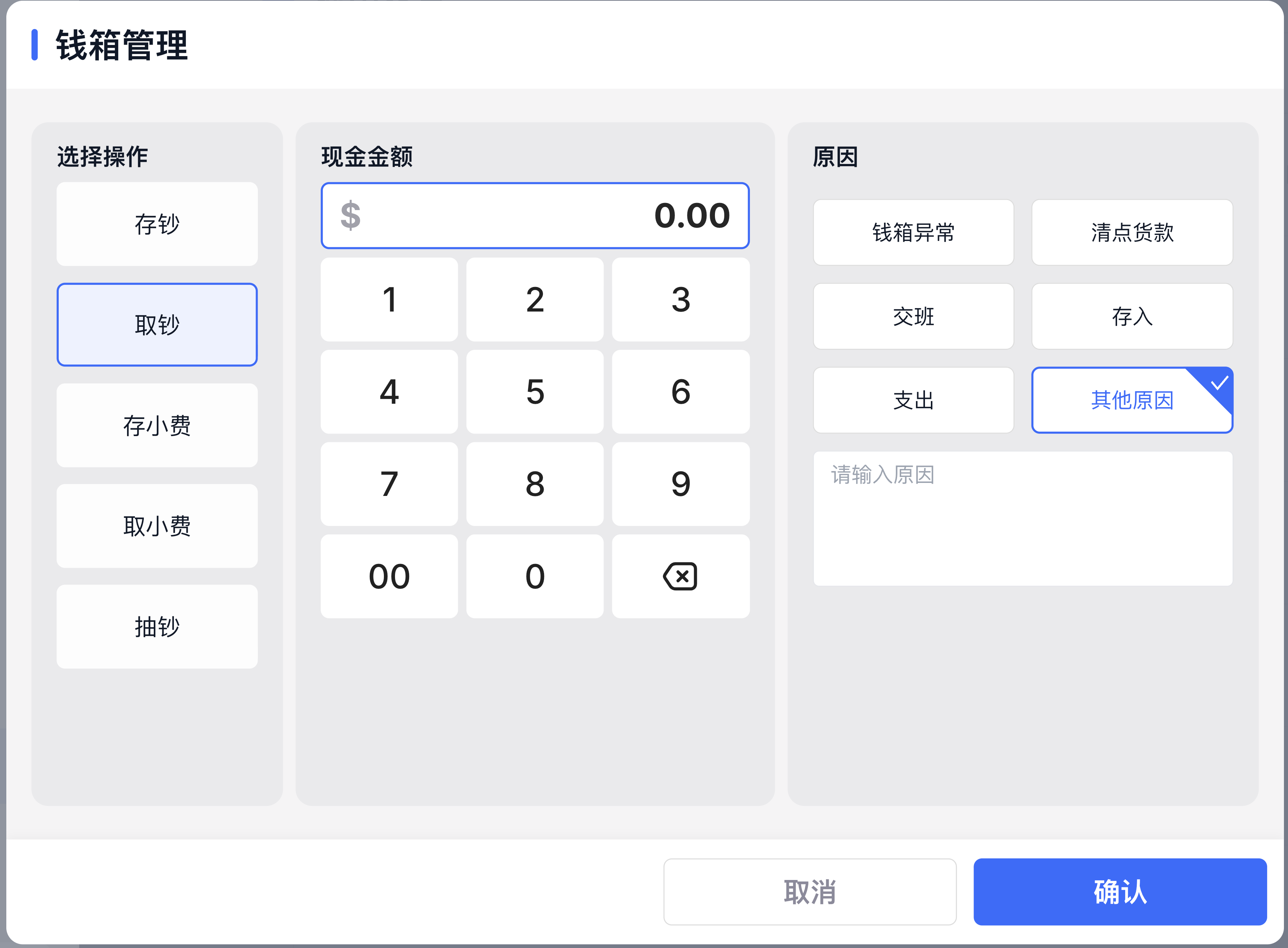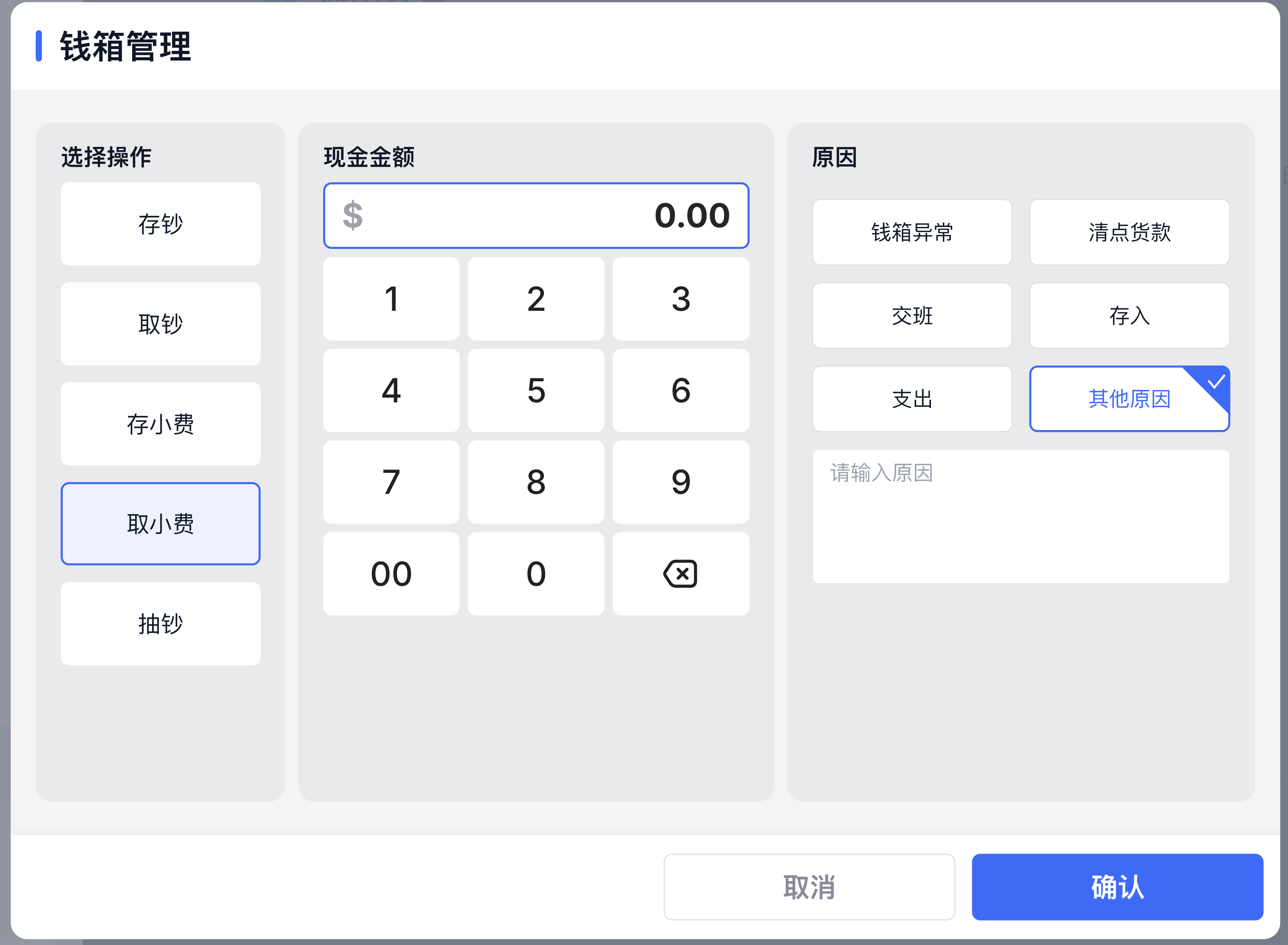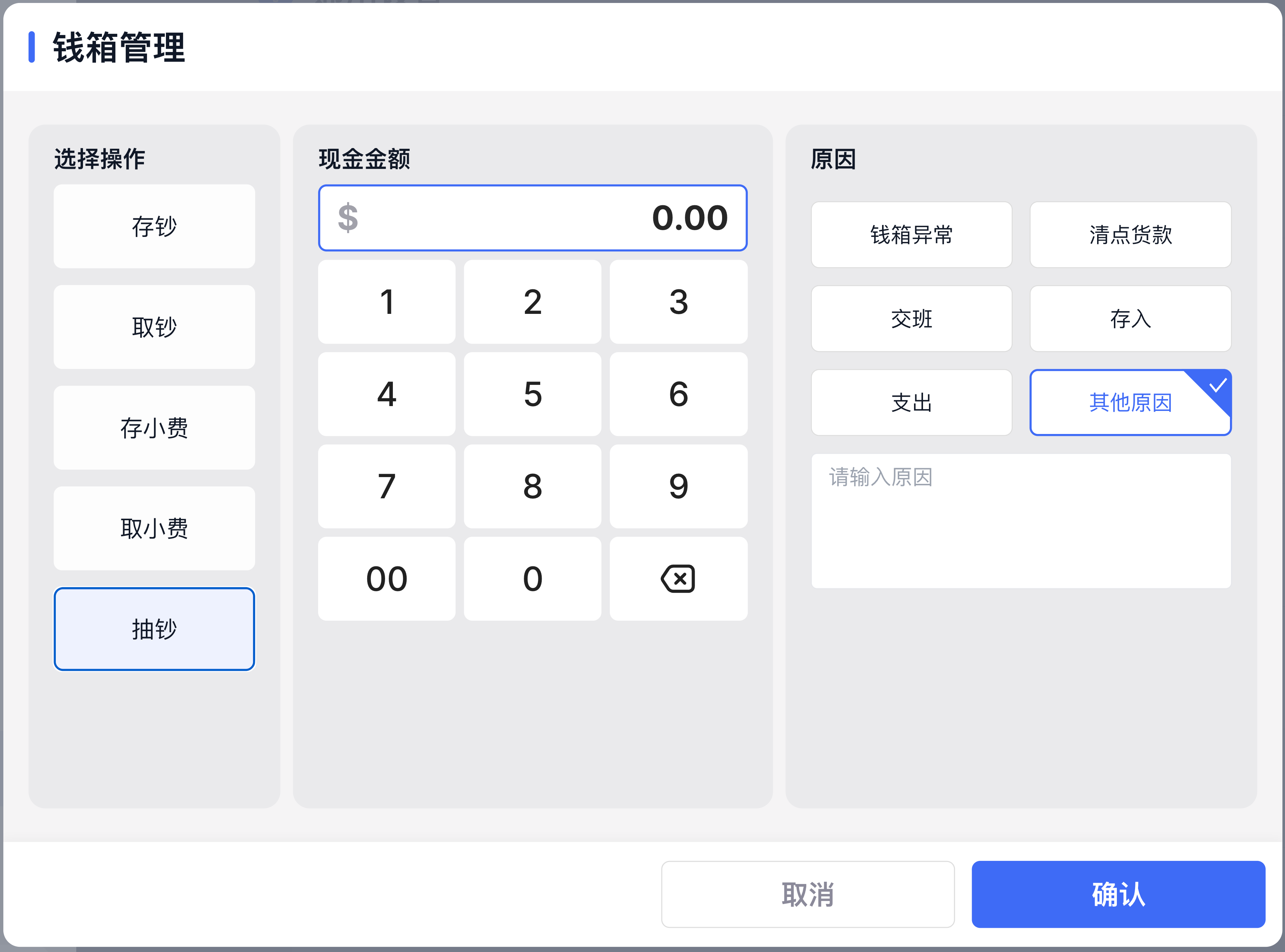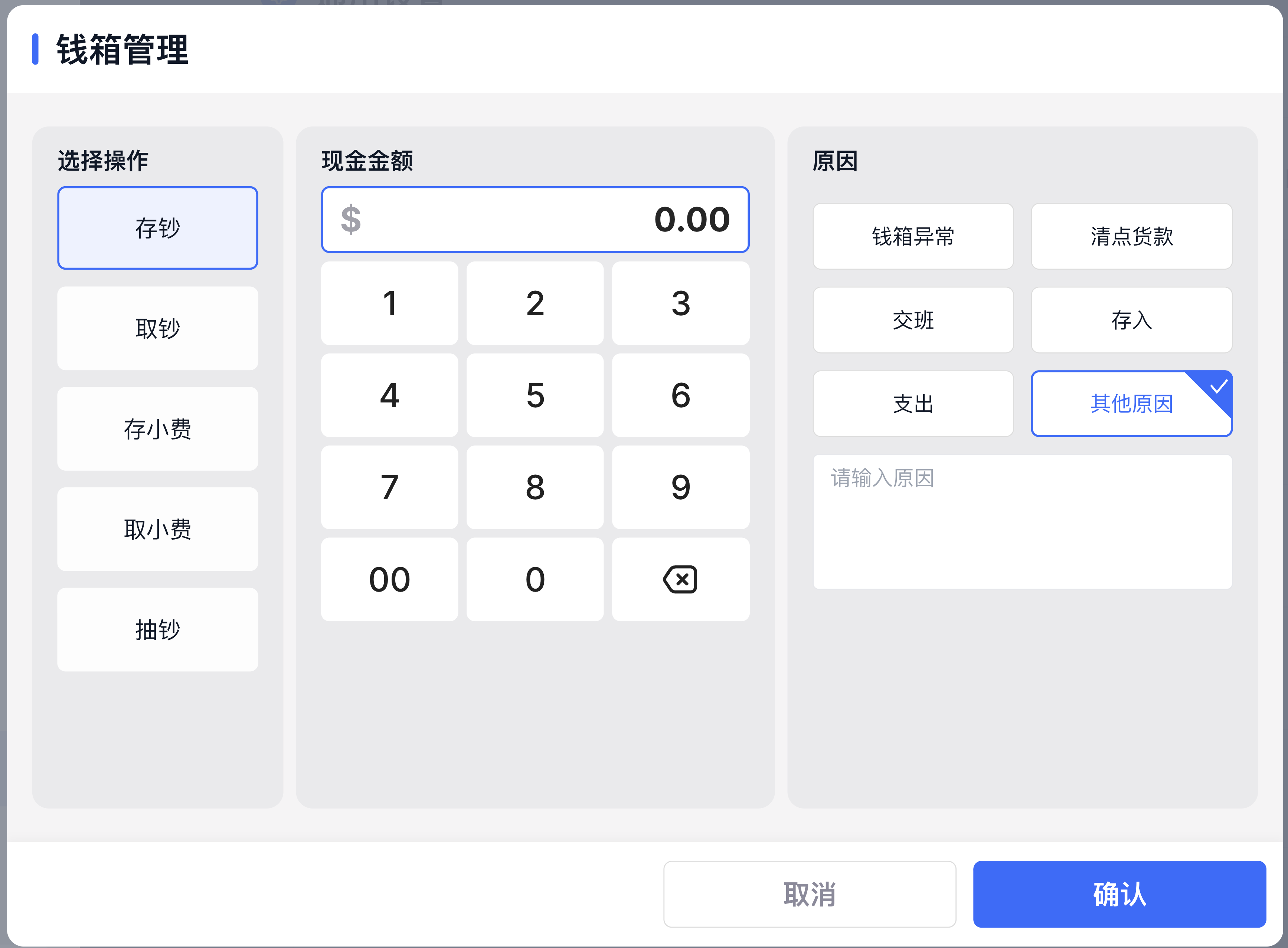 录入实际金额:盘点钱箱内现金,输入实际金额(支持 0.00 金额盘点);