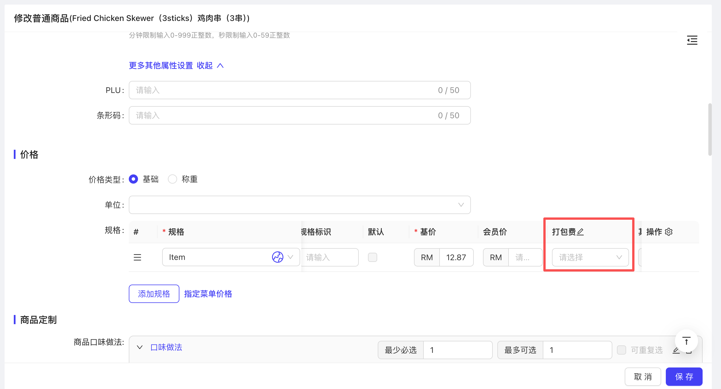 打包费:部分商品打包带走可能需要收取打包盒的费用,需要在商品管理里面的附加费中添加