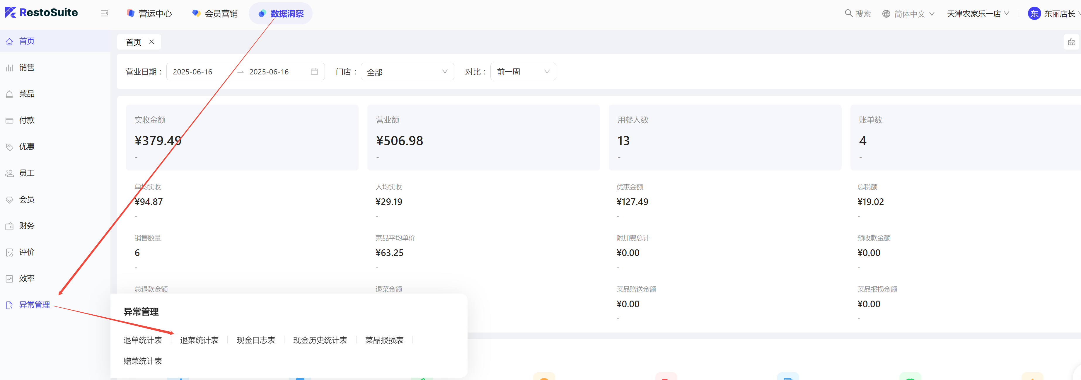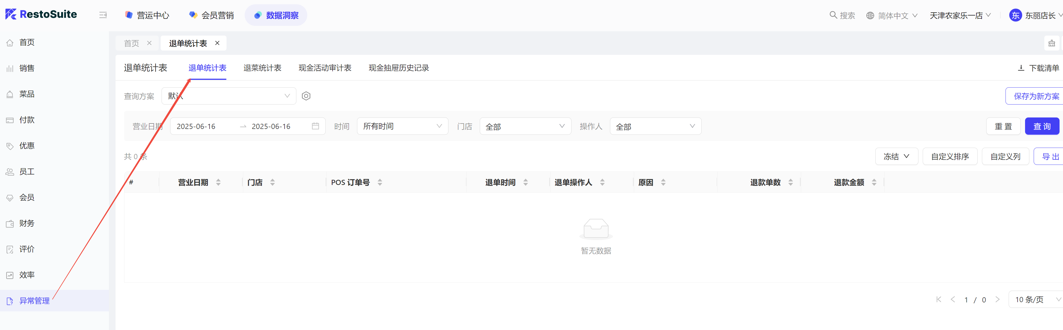 登录到BO后台,在对应的视角下,选择数据洞察,异常管理,退菜统计表查看