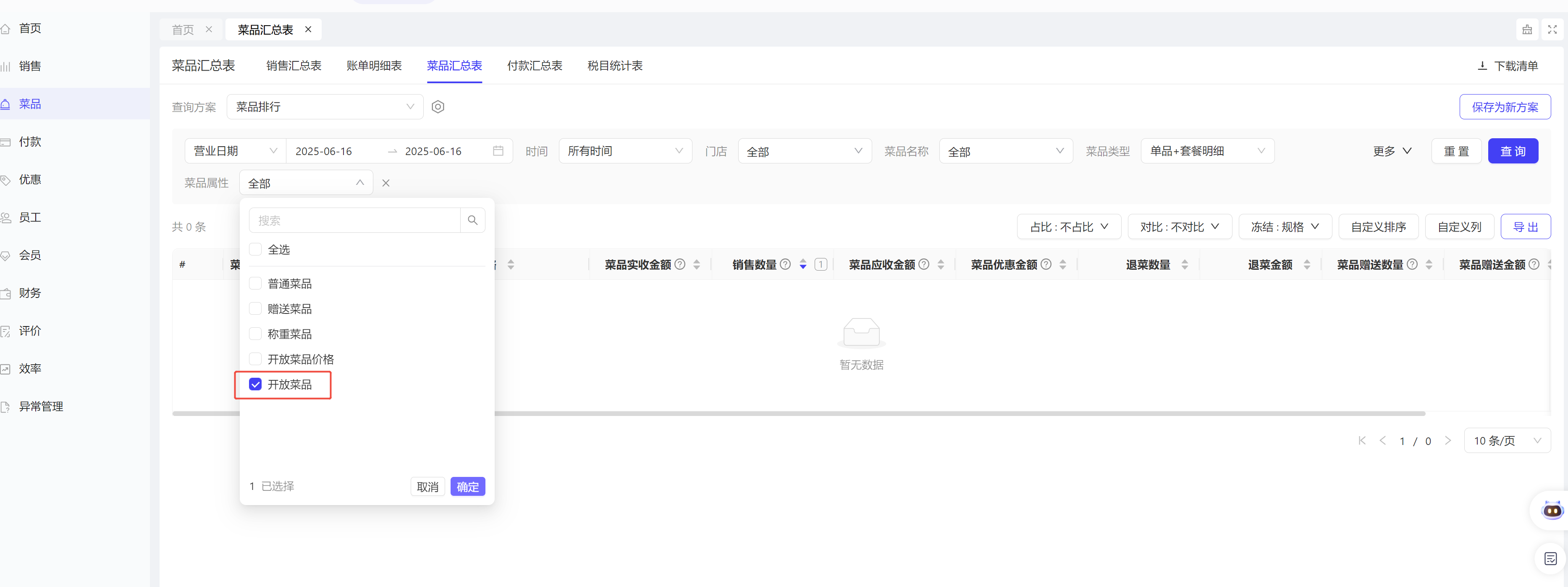 登录到BO系统中,数据洞察,菜品,菜品汇总表,菜品属性选择开放式菜品