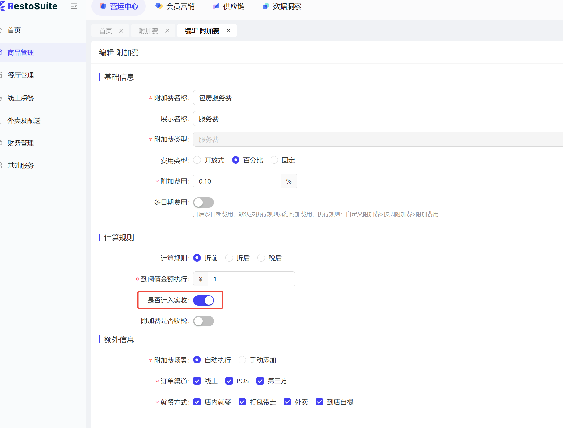 需要检查门店设置的附加费是否计入到实收,如果计入到实收,则会统计到商家实收中,如果不计入到实收,则会统计到优惠中