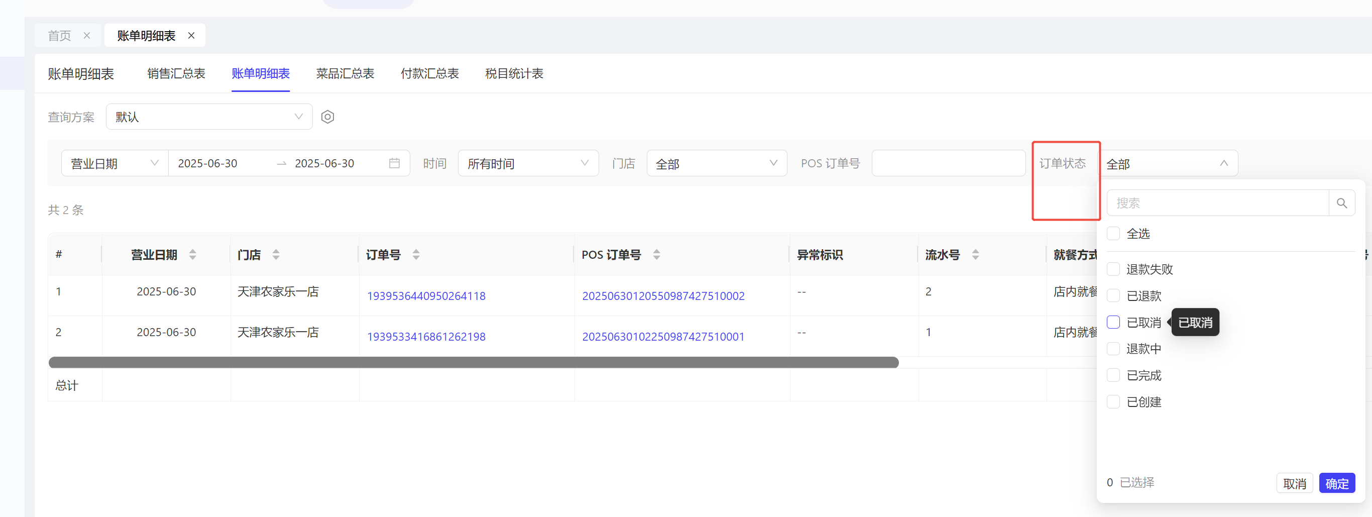 支持,报表查询目前会上传所有状态的订单,可以按照订单状态进行筛选查询