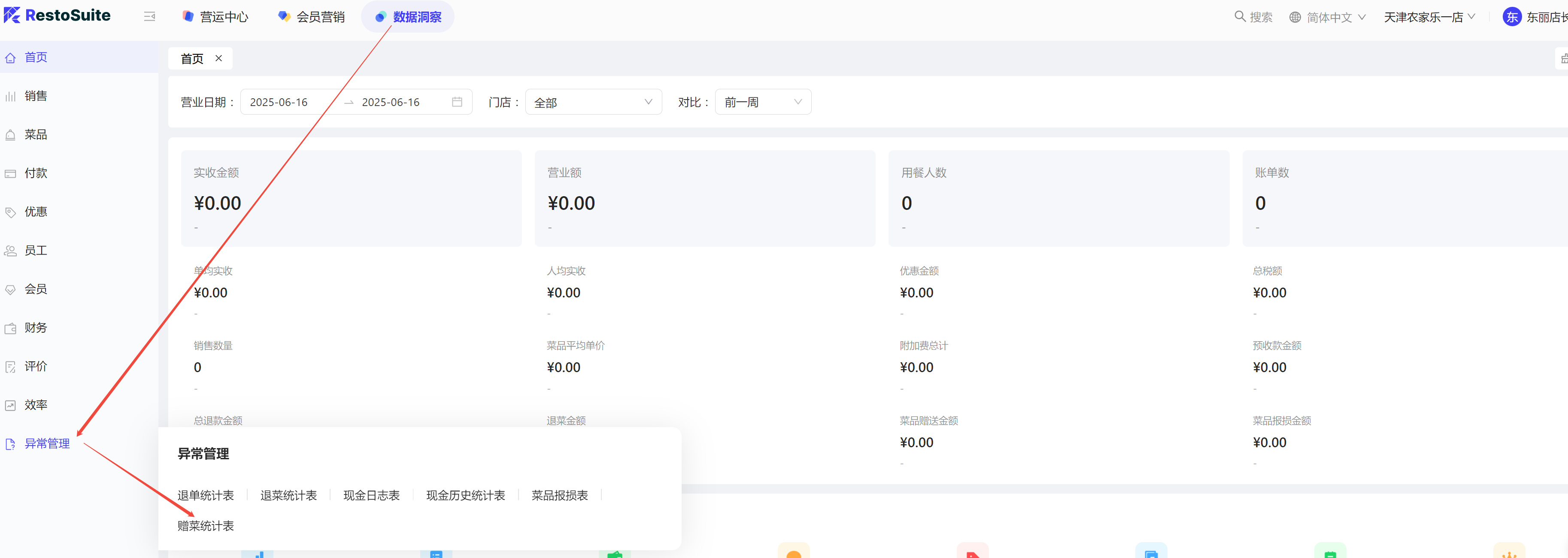 登录到BO后台,在对应的视角下,选择数据洞察,异常管理,赠菜统计表查看