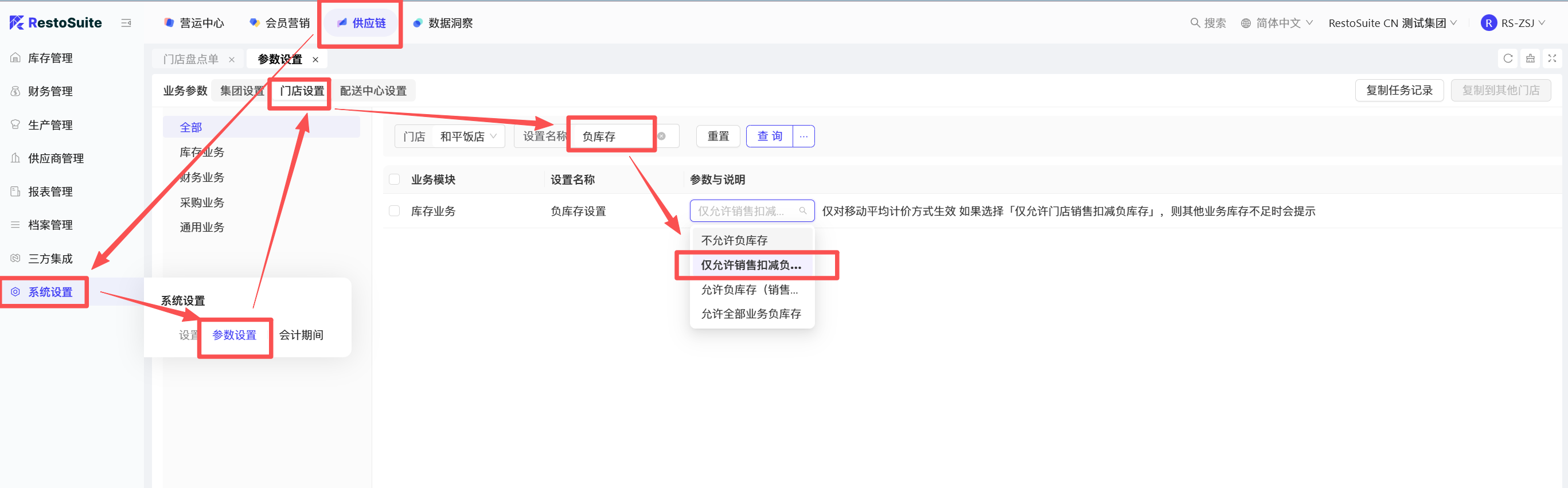 开启允许负库存参数: 集团视角-供应链-系统设置-参数设置-门店设置-搜索:负库存