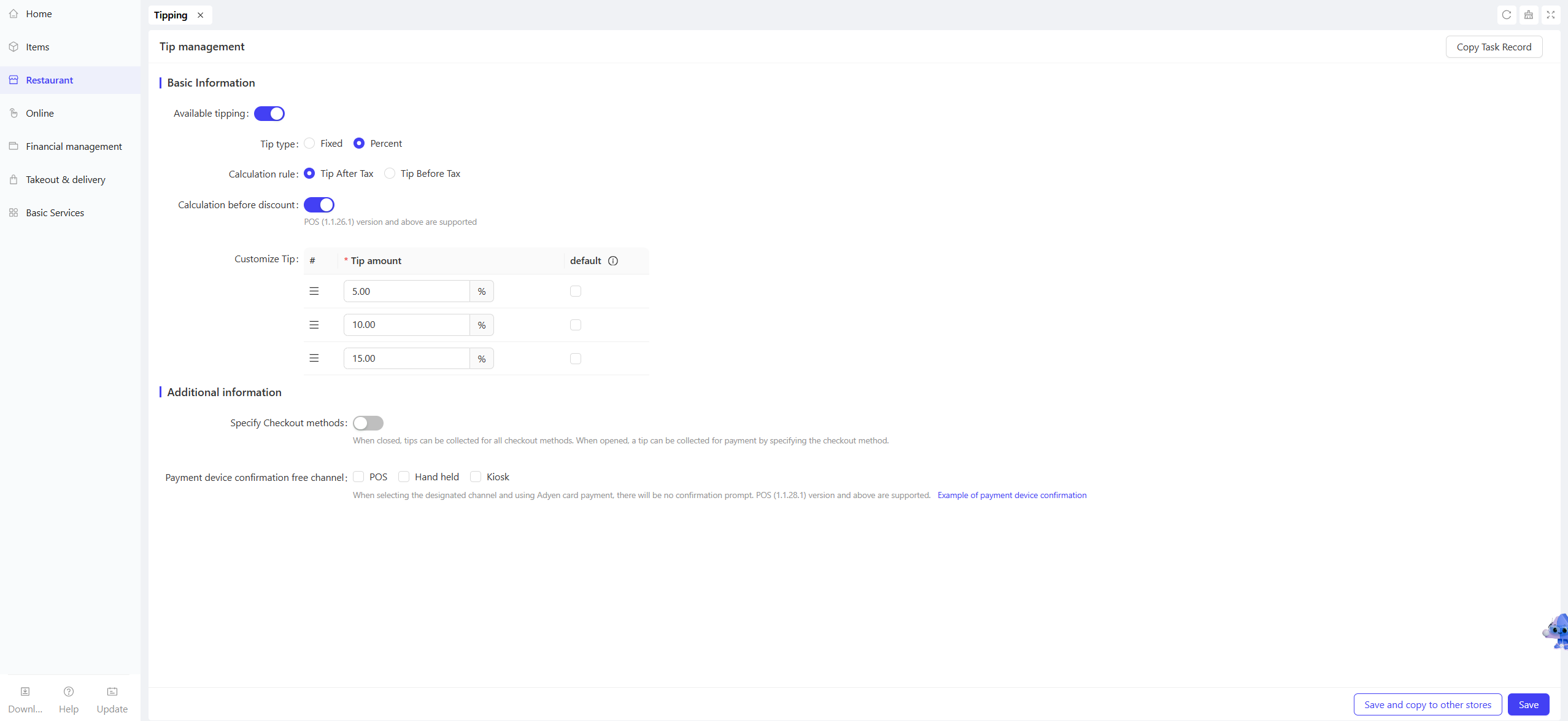 - Toggle Control: Check ‘Display tipping screen’ to enable the tipping function.