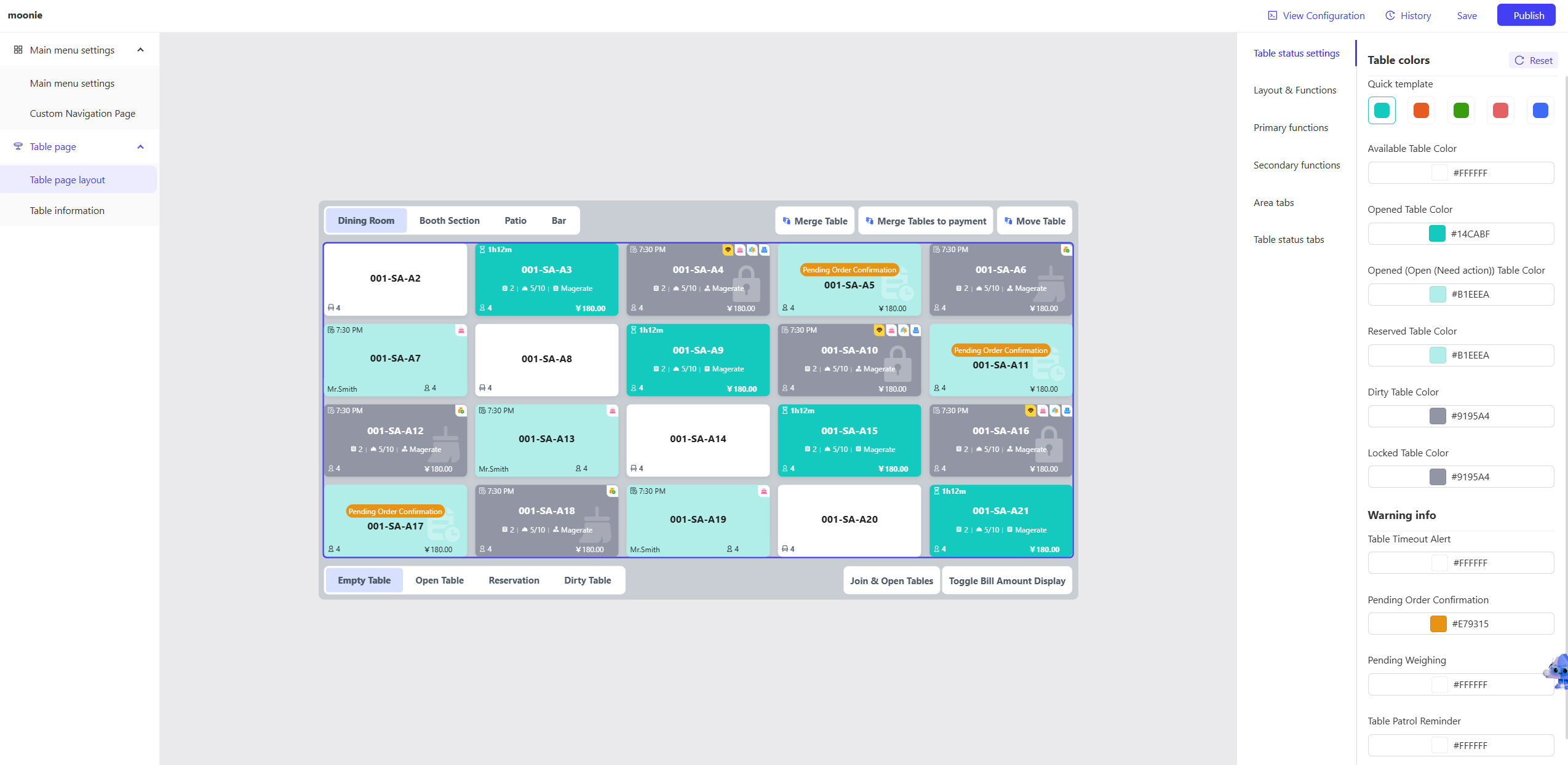 - Configure colors by status (e.g., Empty Table: Green, Occupied: Blue, Dirty: Orange, Reserved: Purple).