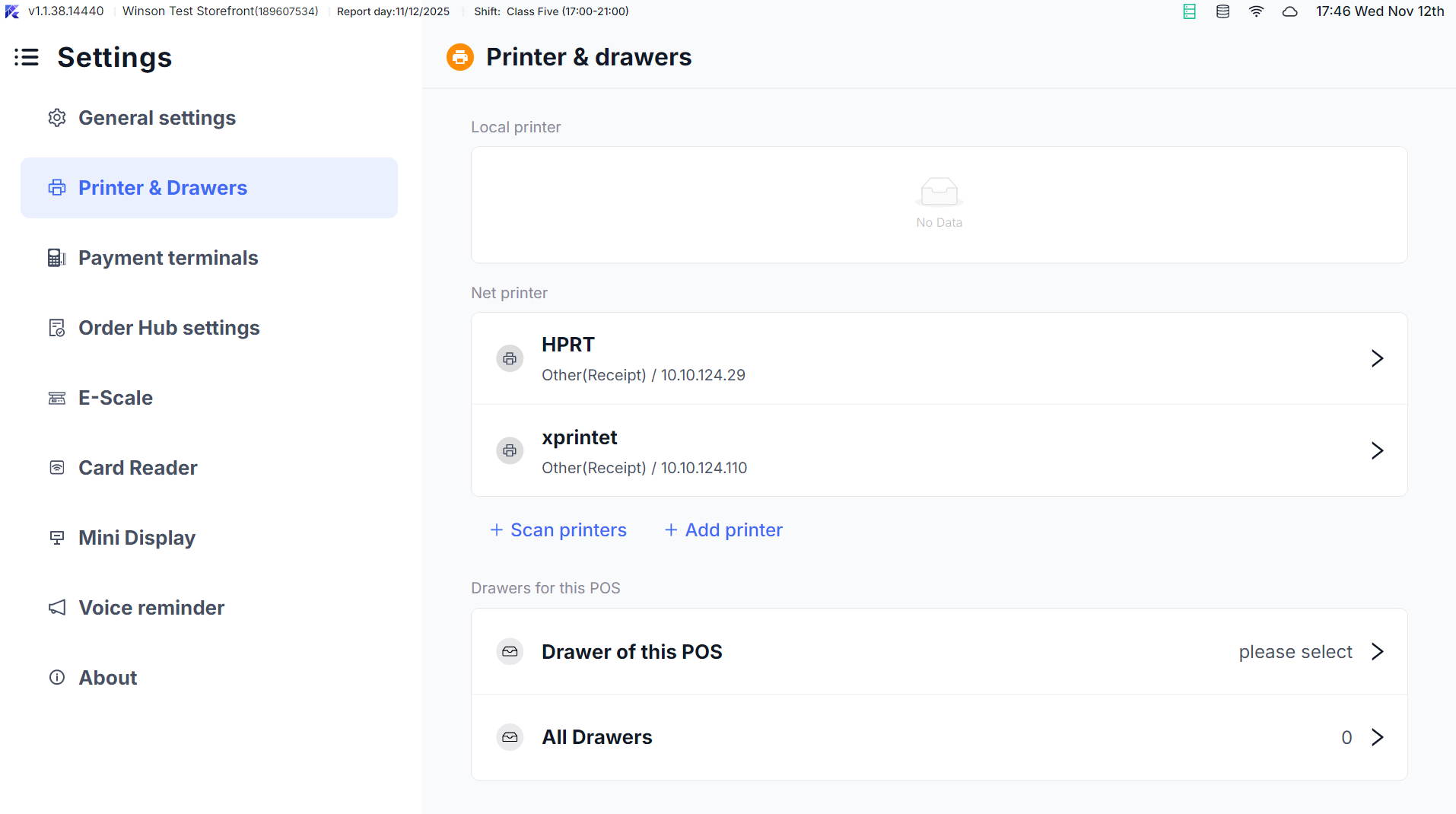 - Network Connection: Go to【Settings → Print Management → Printers → Add】, enter the printer IP (e.g., 192.168.1.121), select the model (e.g., “EPSON TM-88V”).