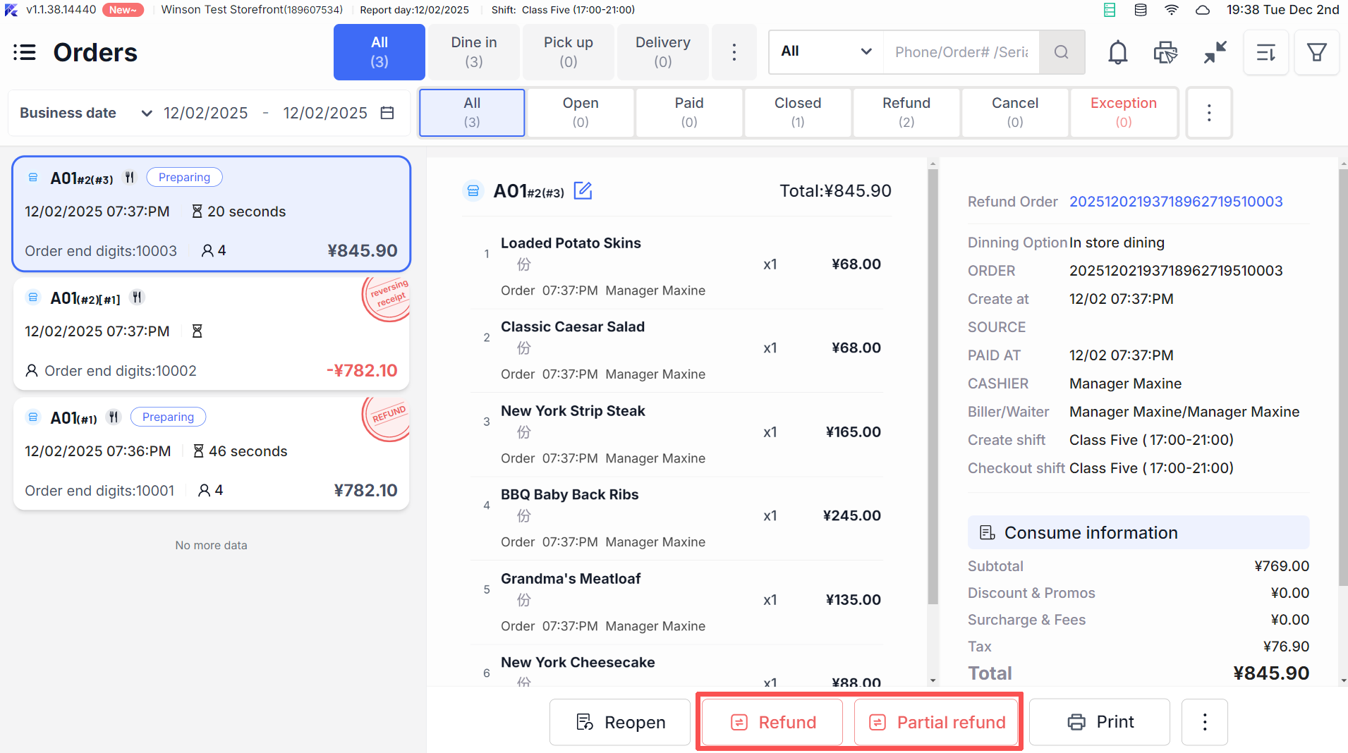 - If an order uses multiple payment methods (e.g., “WeChat + Cash”), refunds are proportionally returned based on original payments