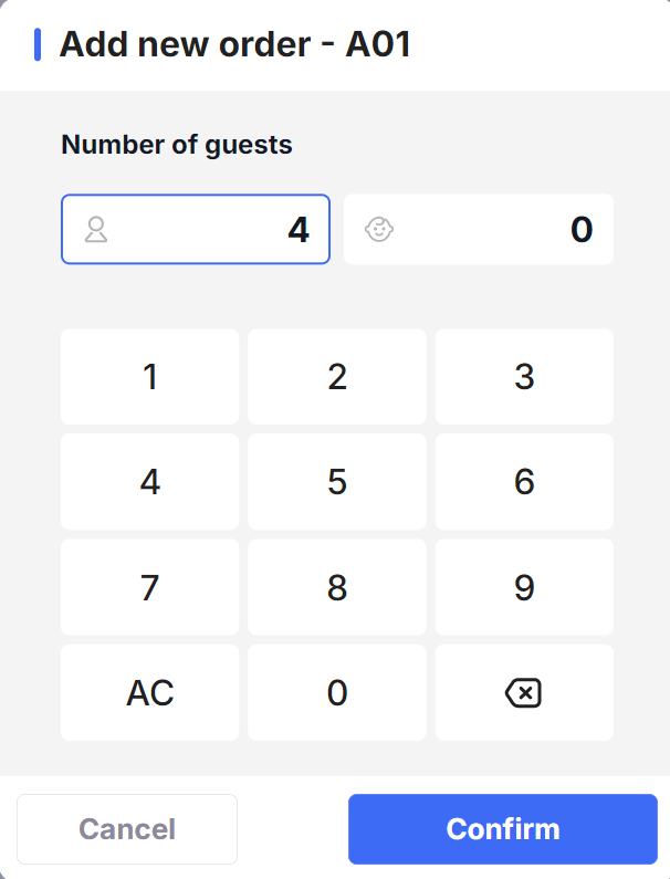 - Click【Table】→ select the target table number (e.g., “A01 - Hall”) → enter the number of diners → click【Confirm to Open】