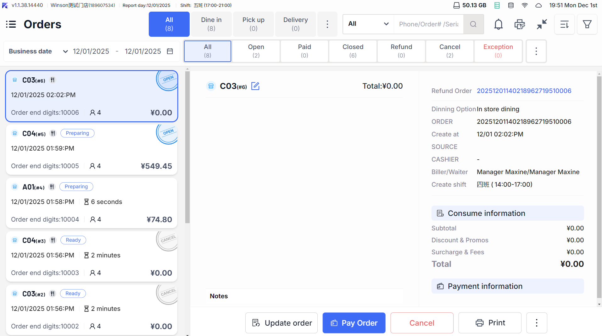 This guide covers complete order lifecycle management in the POS system, including order search, status management, refund processing, and exception handling - everything you need for efficient order control.