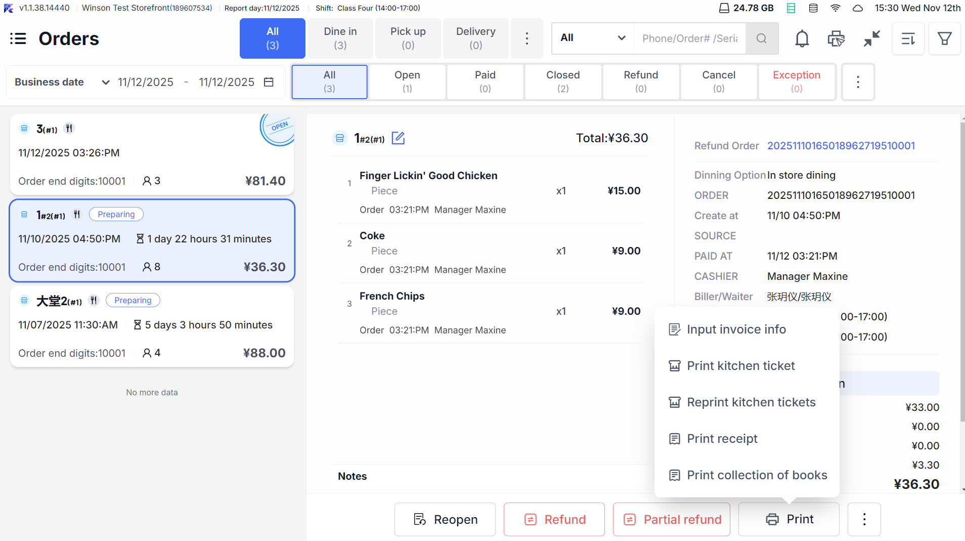 - Enter【Orders】: Locate the target order, click【Print】and choose the receipt to reprint (e.g., “Payment Receipt,” “Kitchen Order Ticket”).