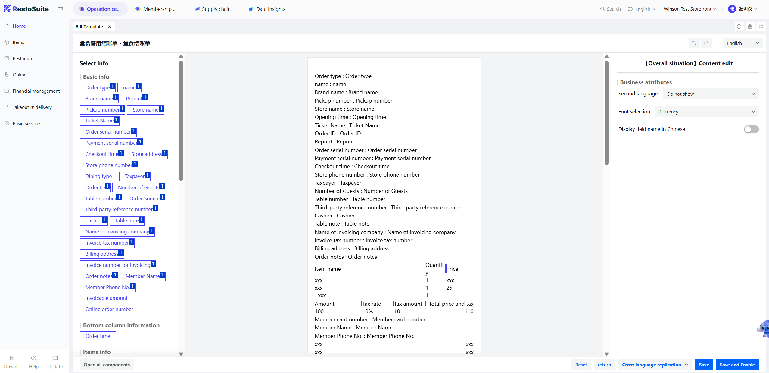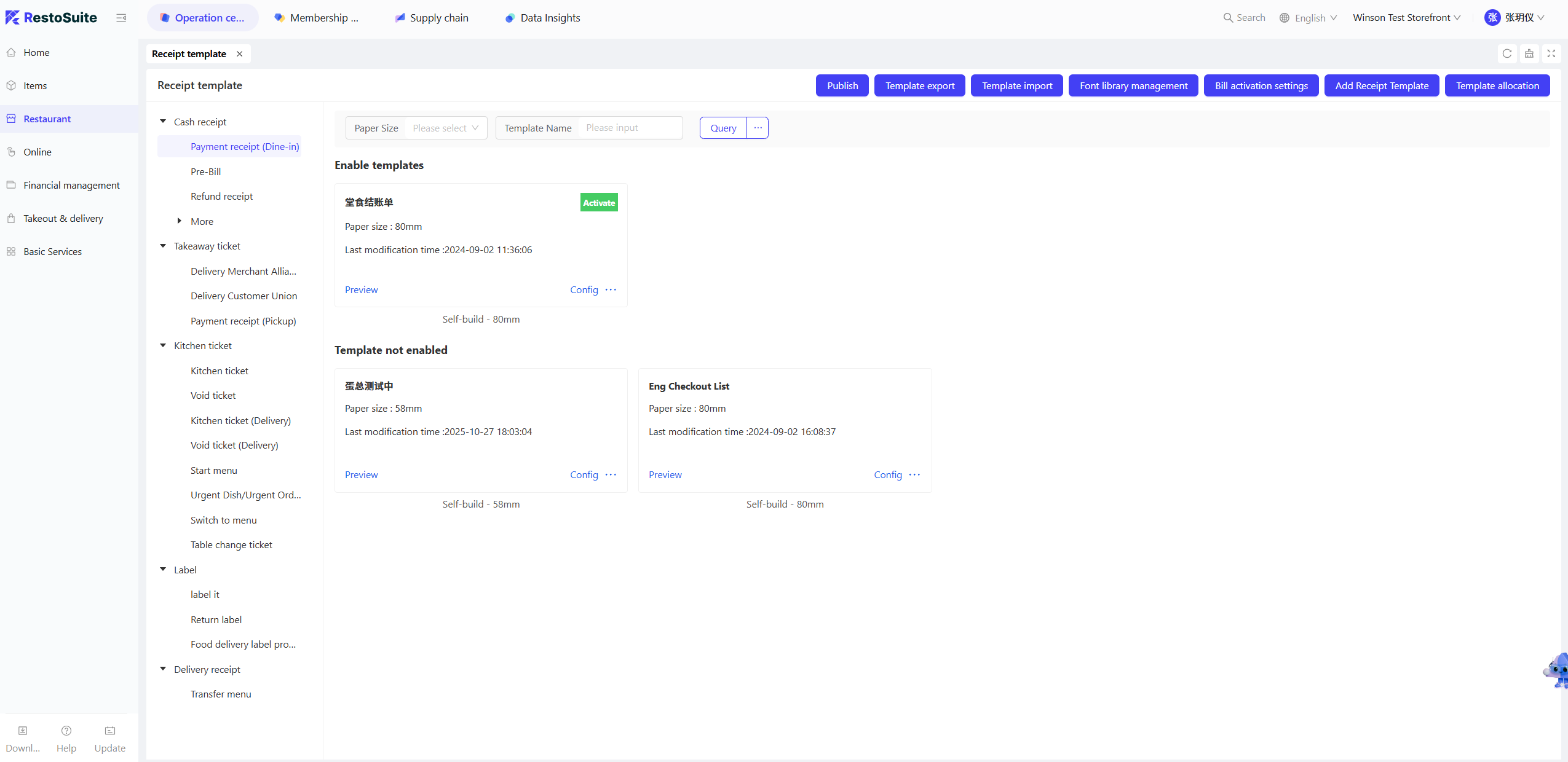 - Template Setting: Enable the necessary template in【Restaurant Management → Receipt Template → Front Desk Receipt → Payment receipt (Dine-in)】