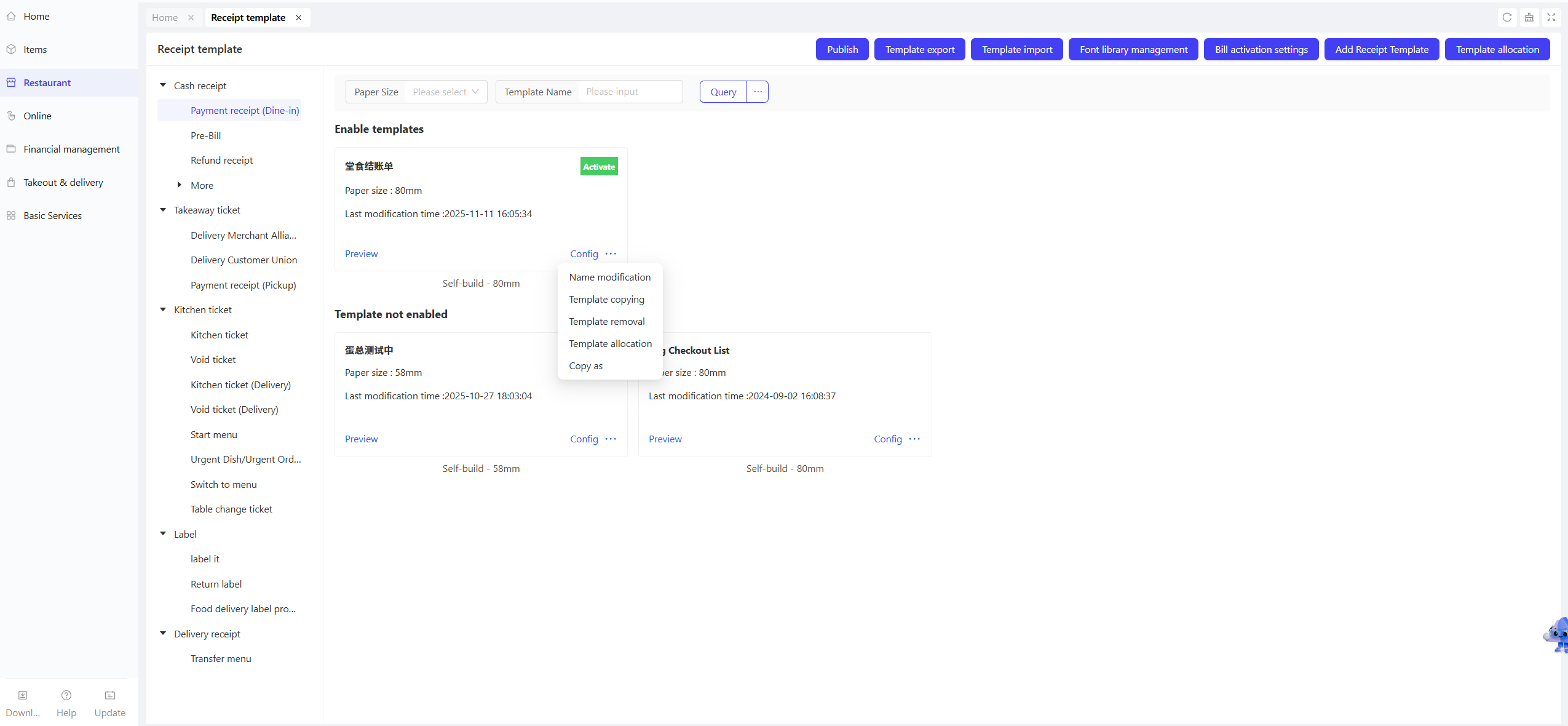 - Template Setting: Enable the necessary template in【Restaurant Management → Receipt Template → Lobby Receipt → Payment receipt (Dine-in)】