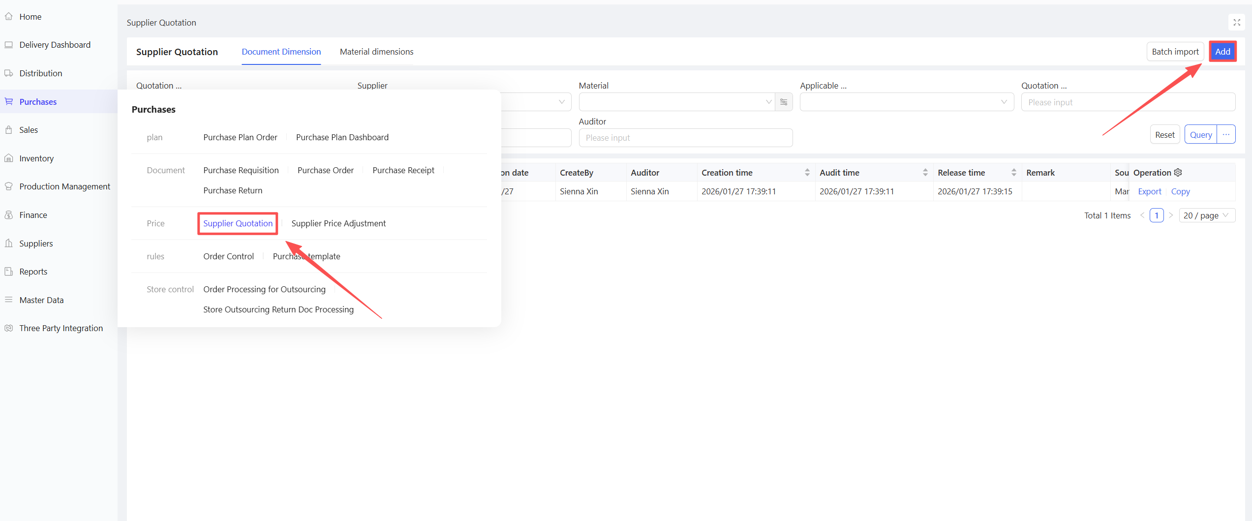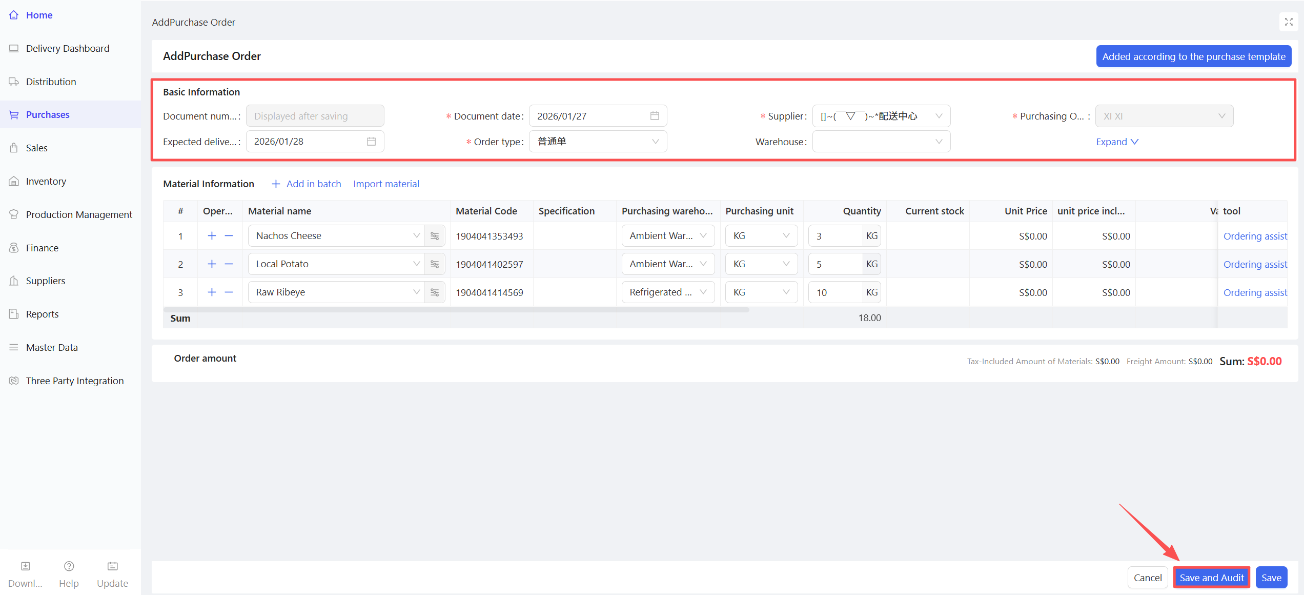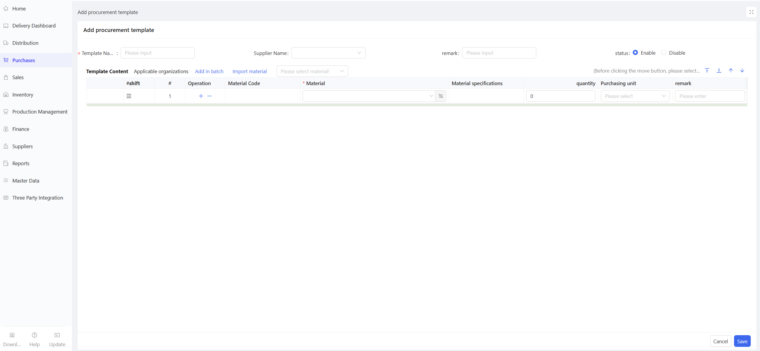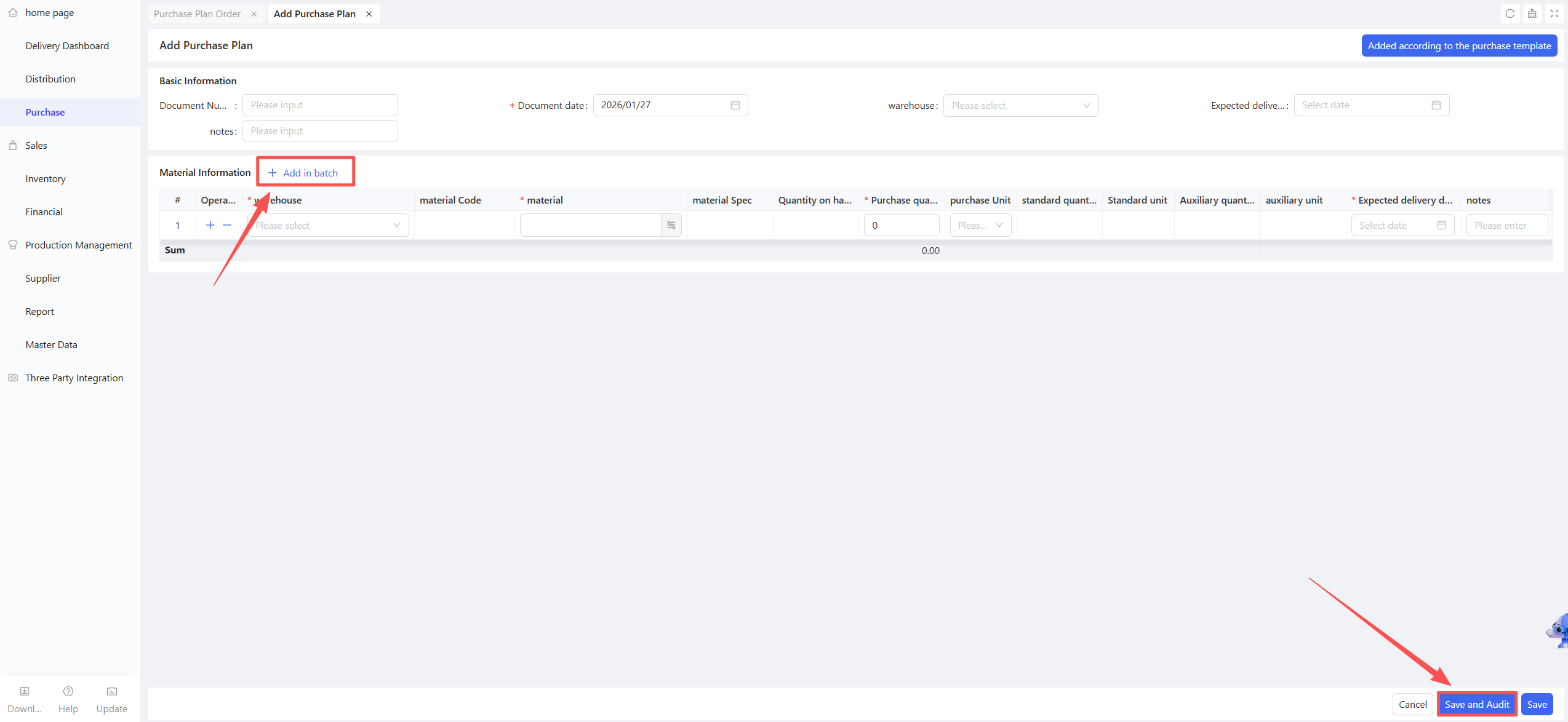 - Click Add > Manual Entry; support for creation via procurement templates or batch addition of materials.
