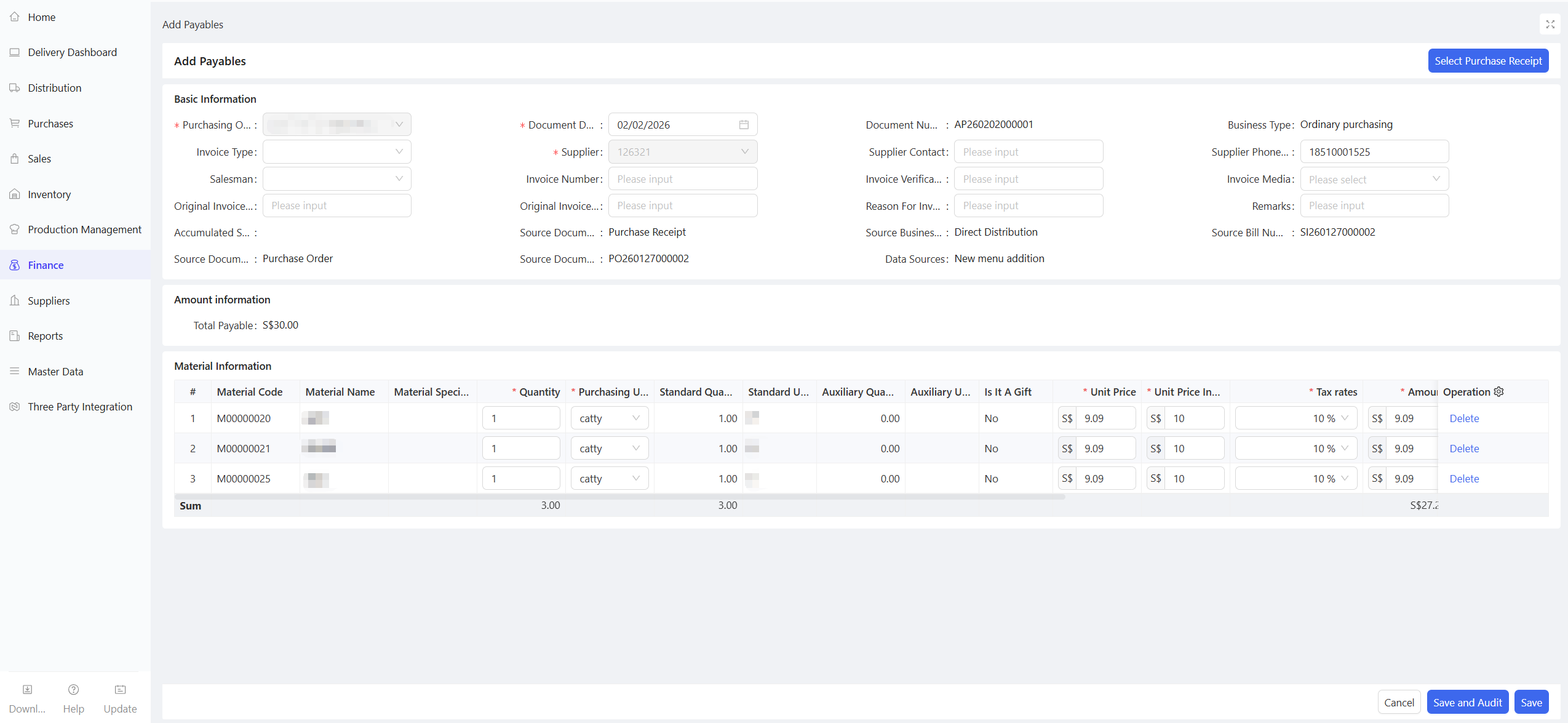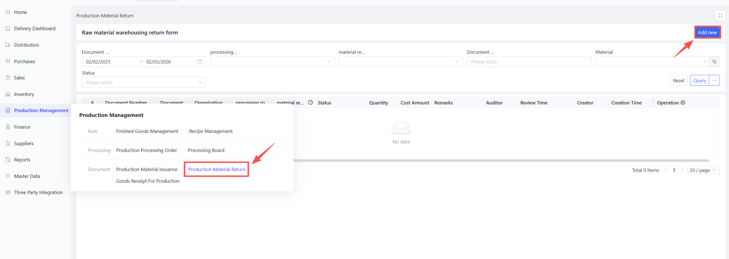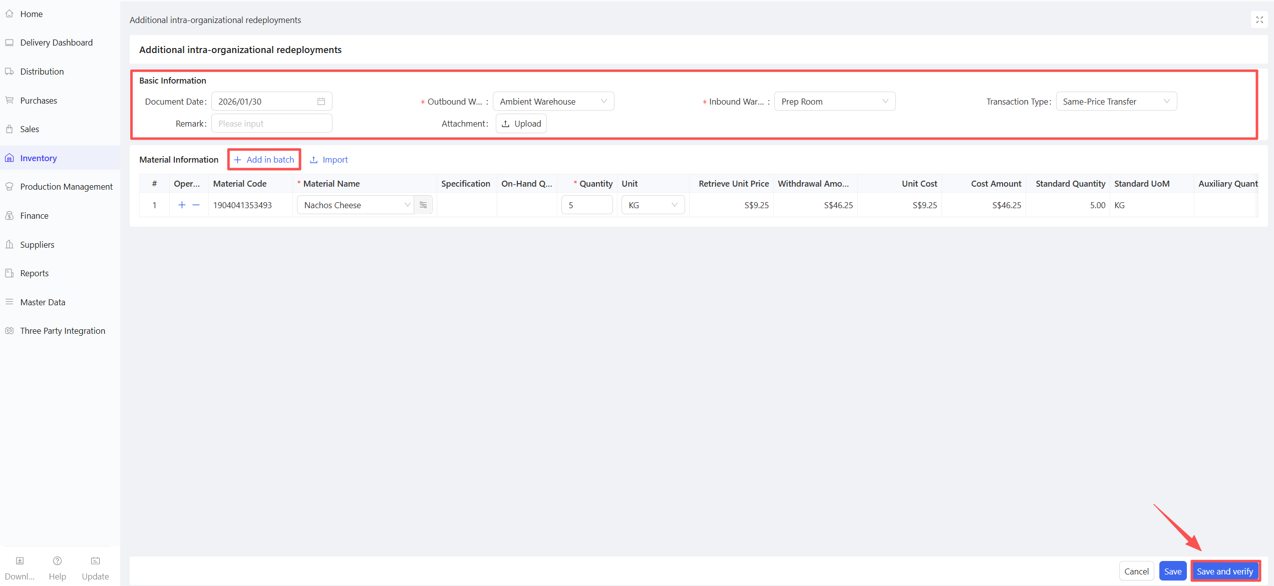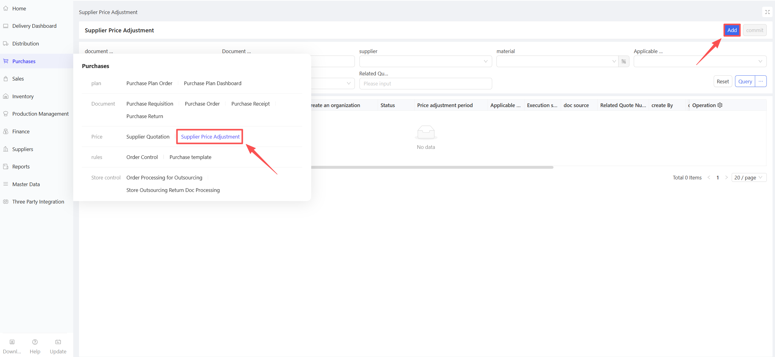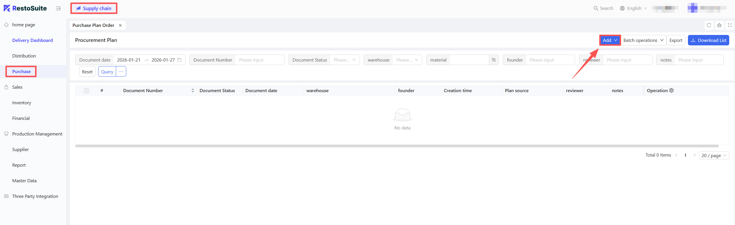 - Click Add > Manual Entry; support for creation via procurement templates or batch addition of materials.