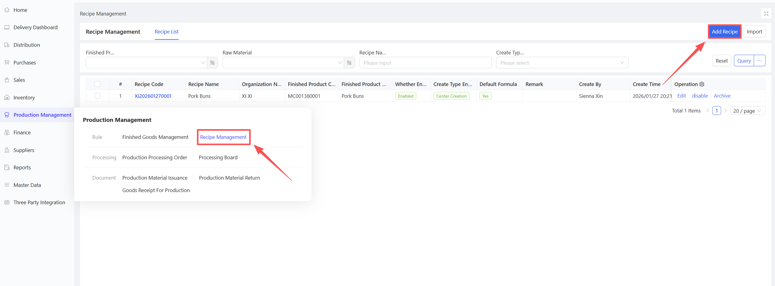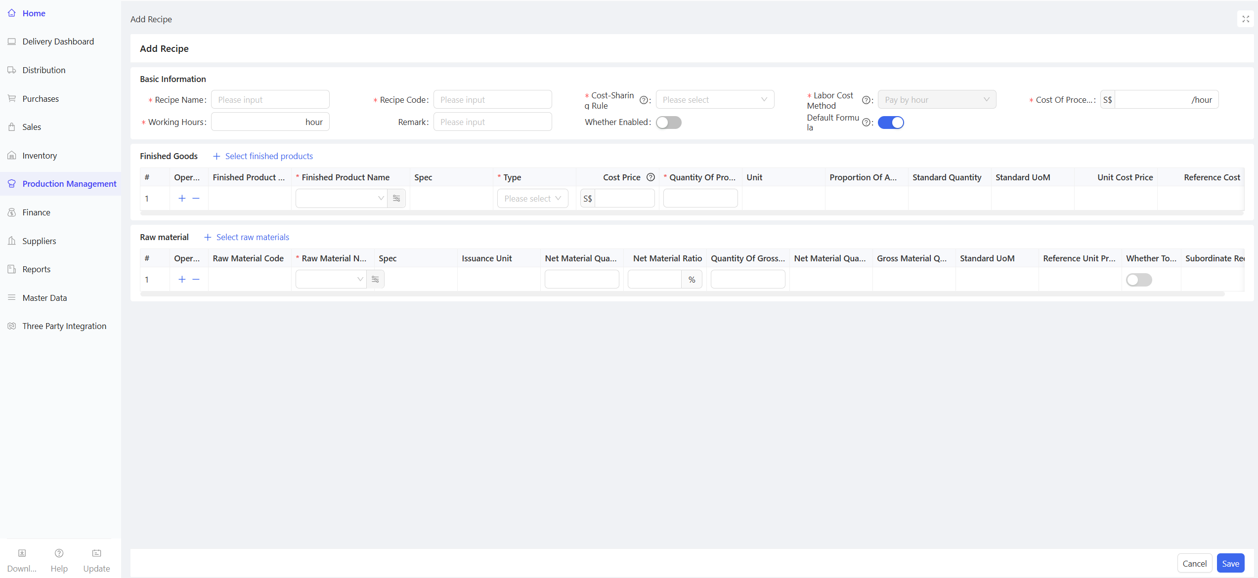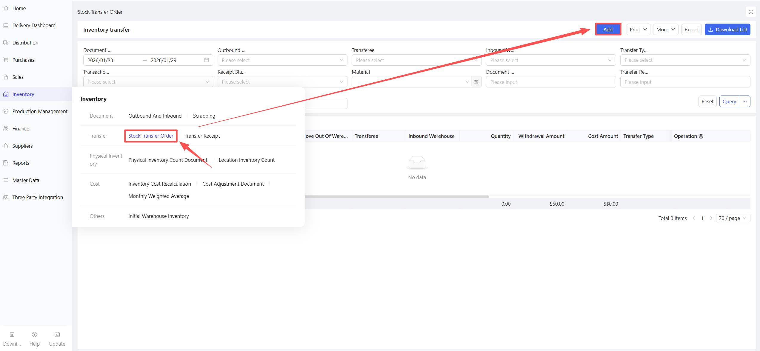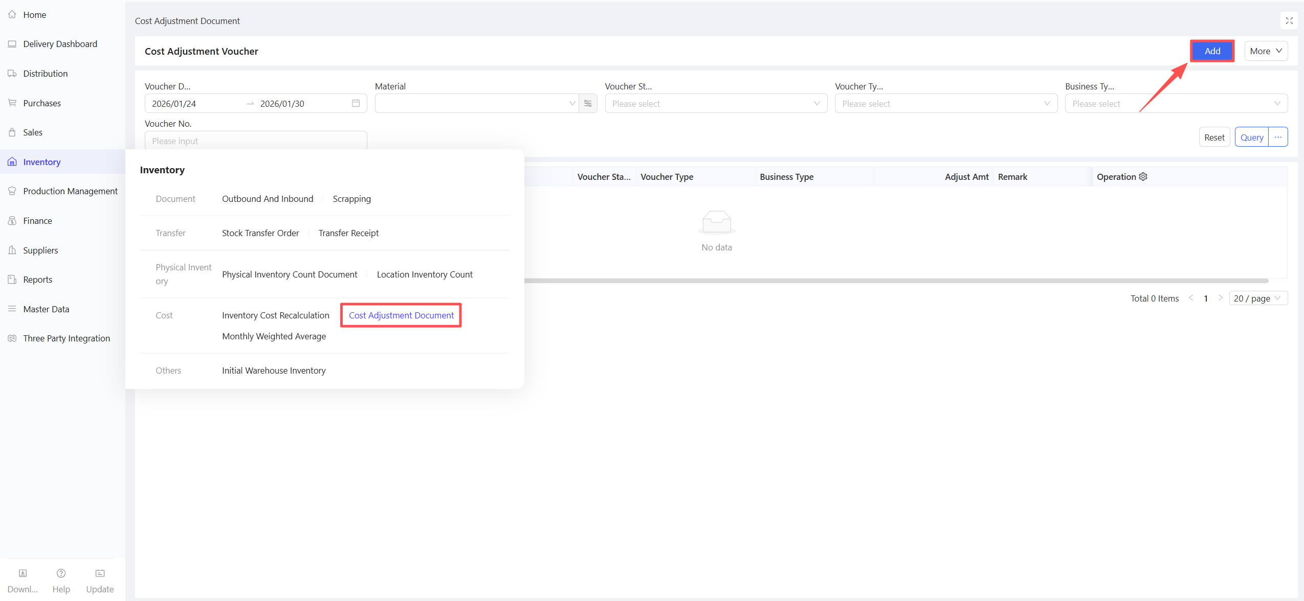 - Click Add > Manual Entry; support for creation via procurement templates or batch addition of materials.
