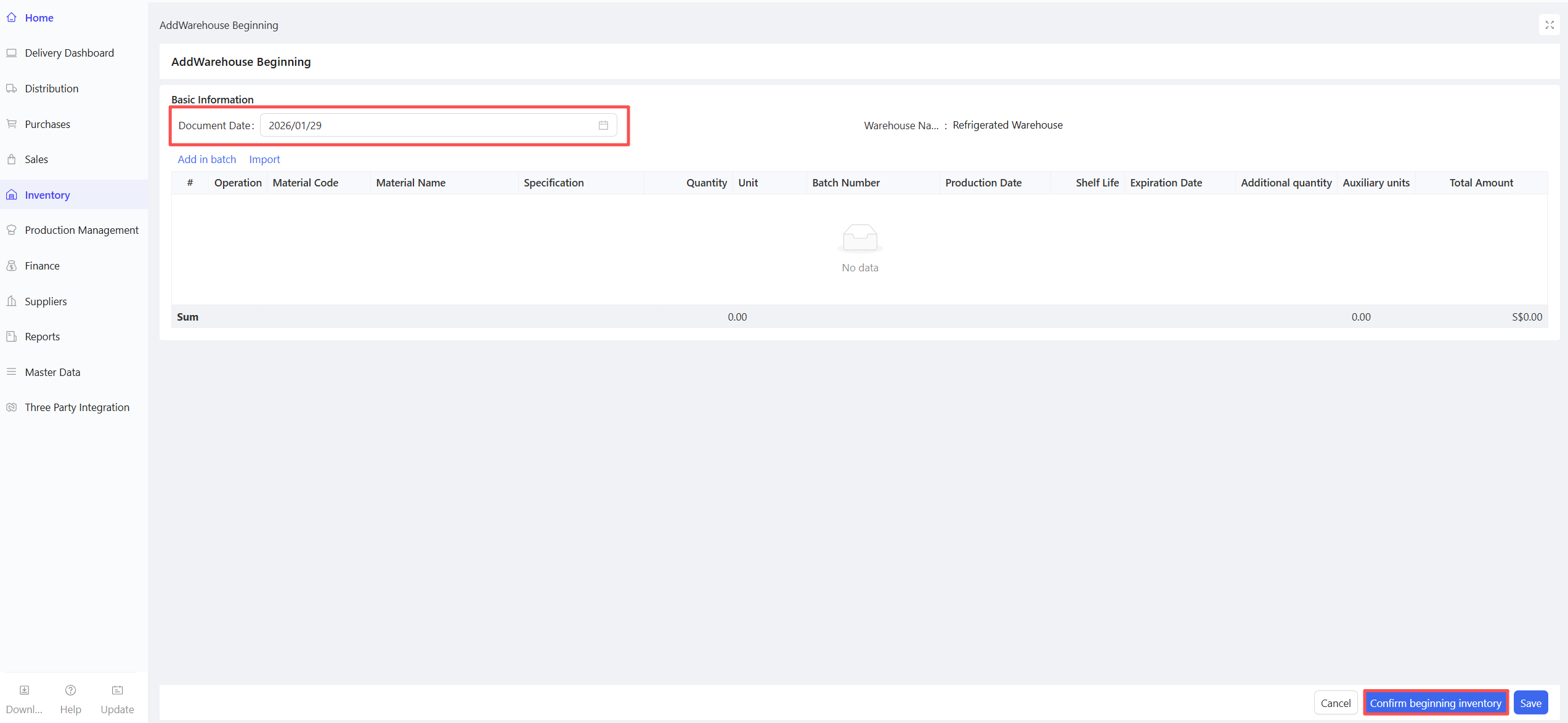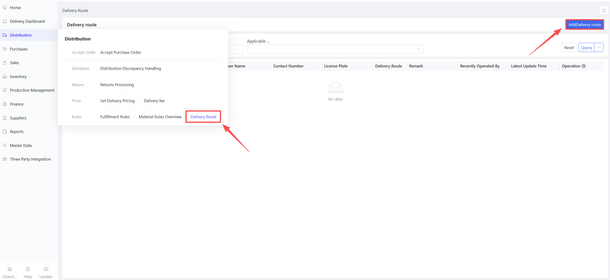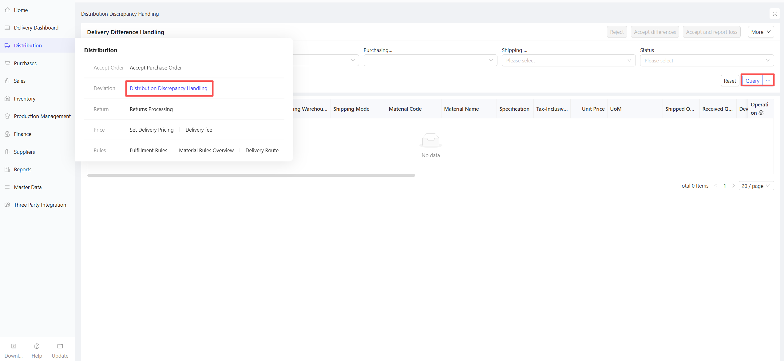 This function records the quantity and price of specific materials procured by the distribution center’s procurement staff from external suppliers, serving as a compliance basis for procurement activities.