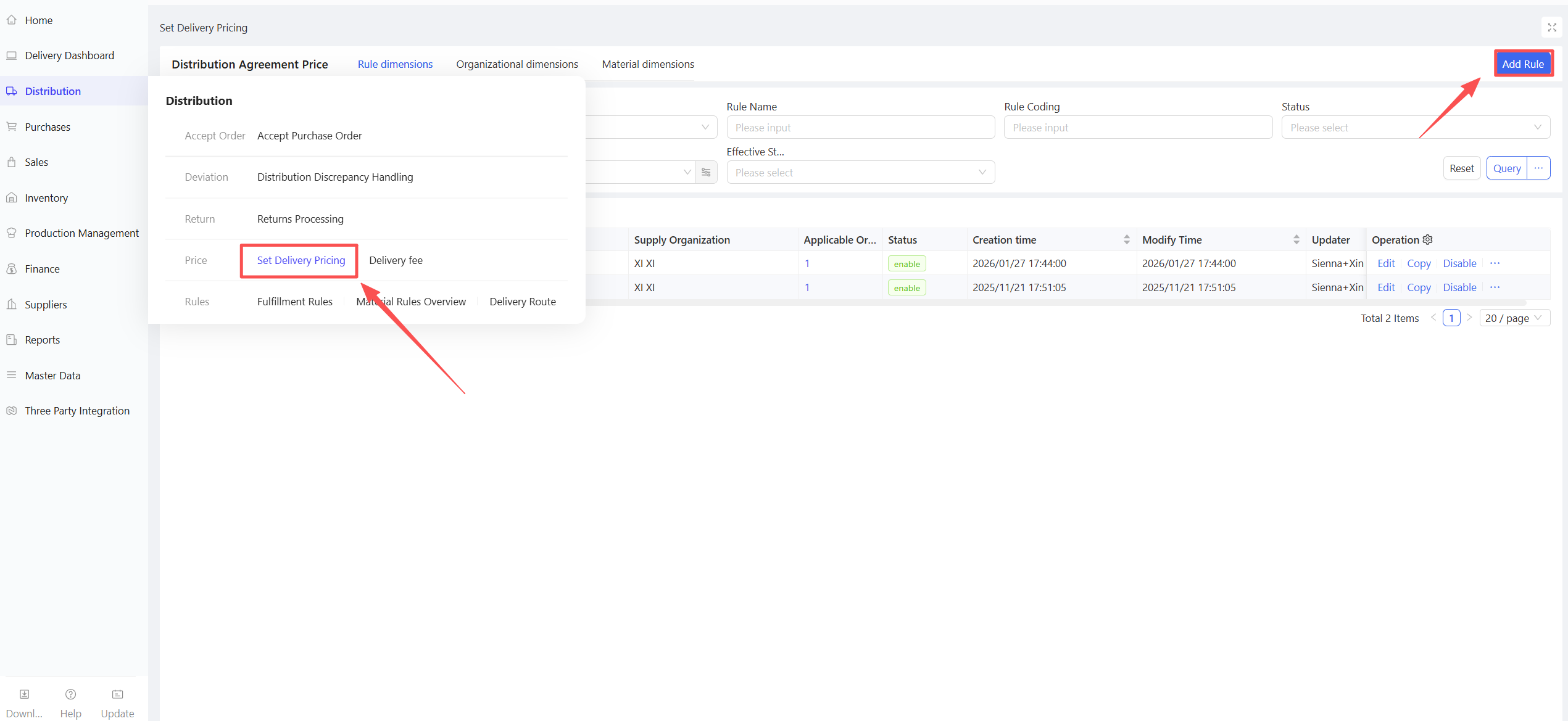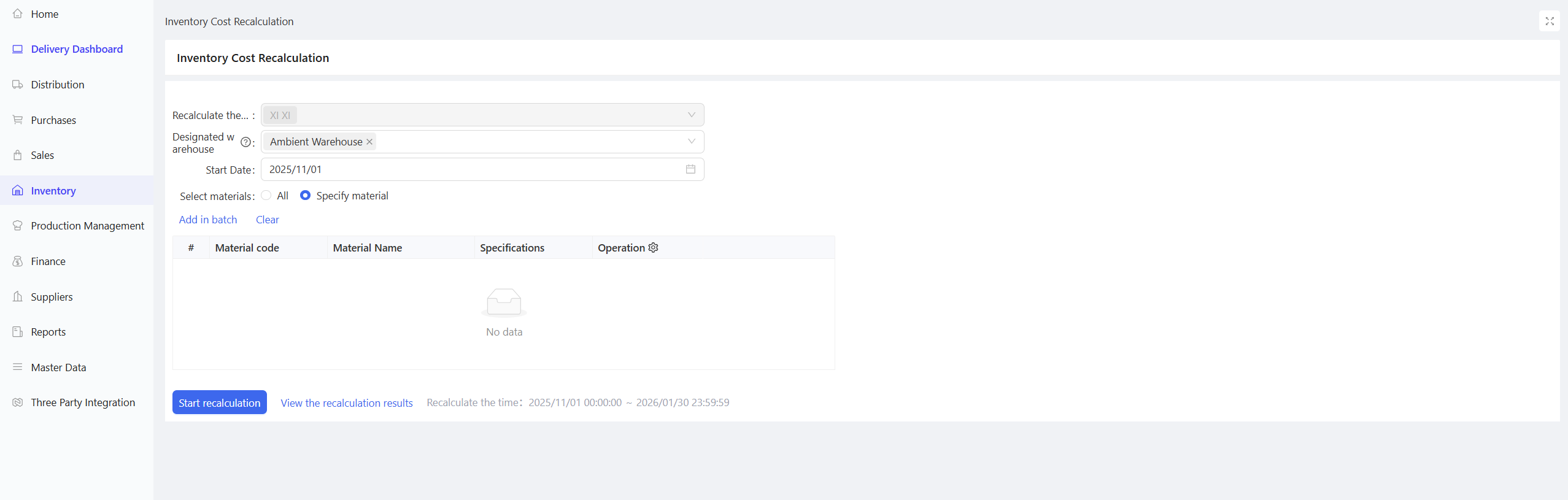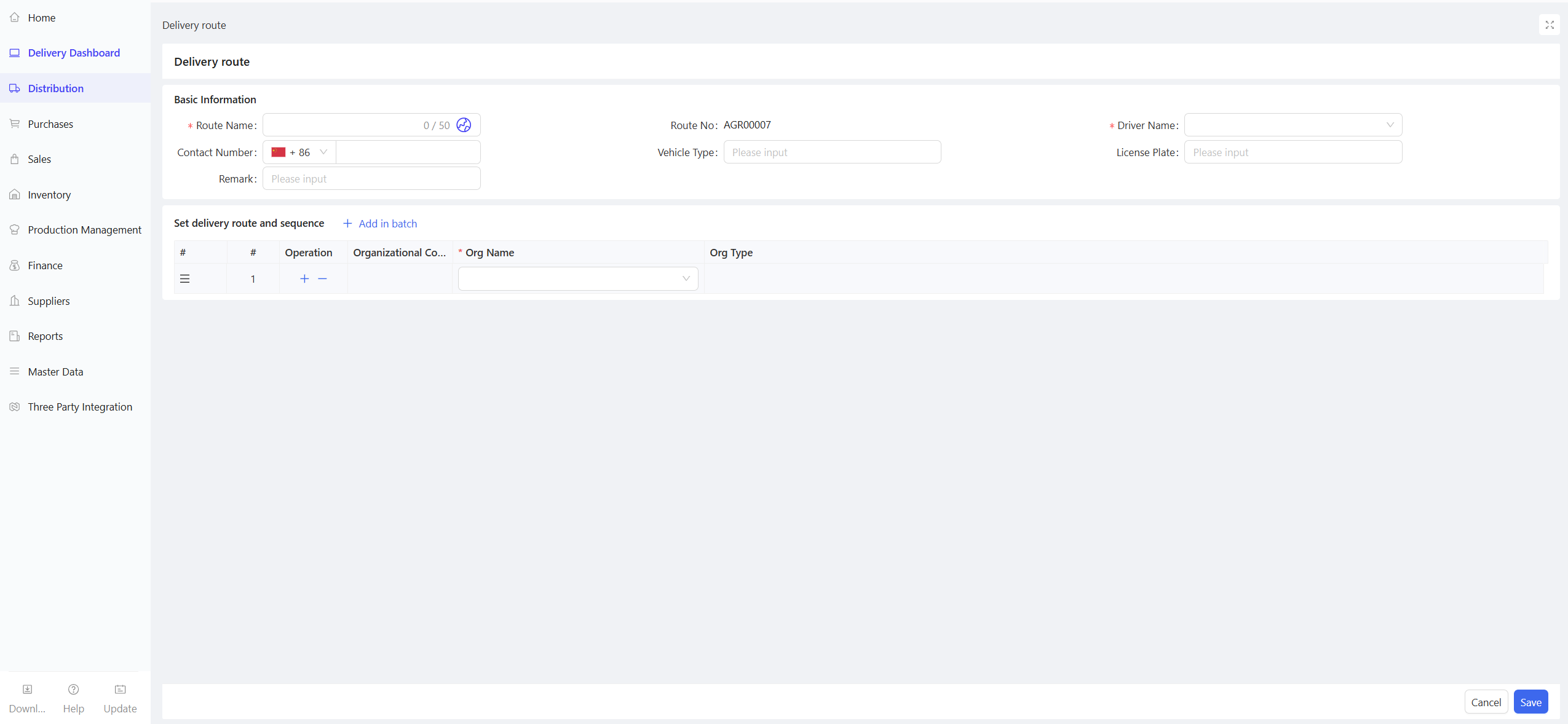 This function records the quantity and price of specific materials procured by the distribution center’s procurement staff from external suppliers, serving as a compliance basis for procurement activities.