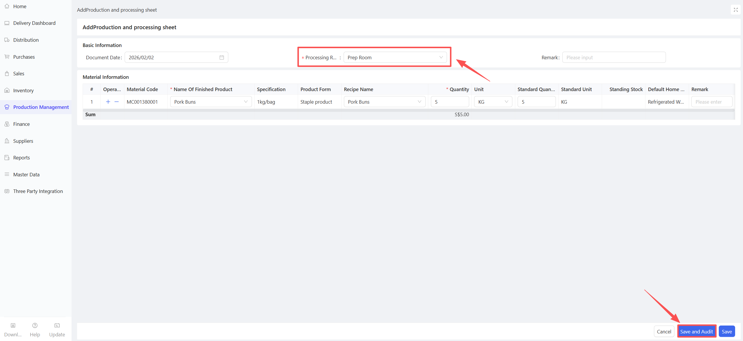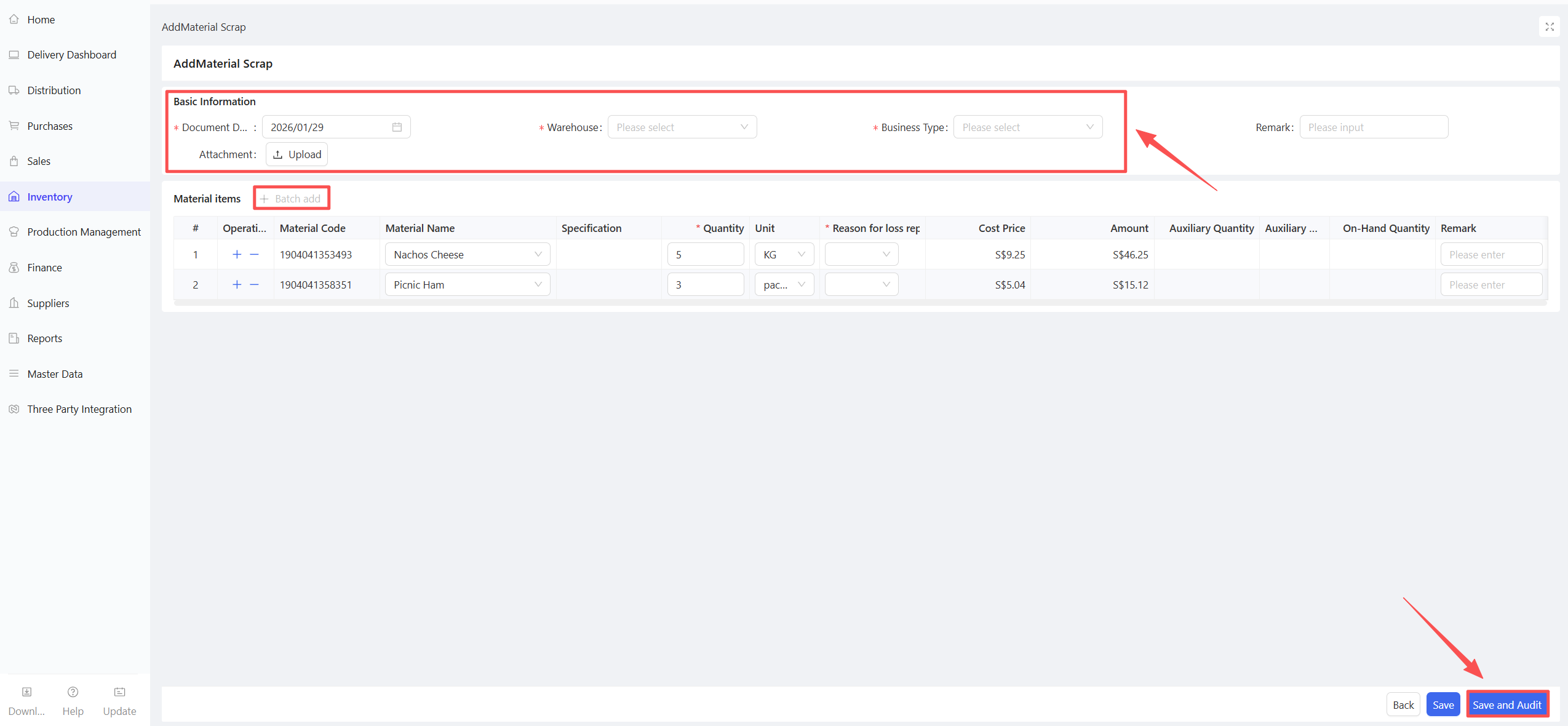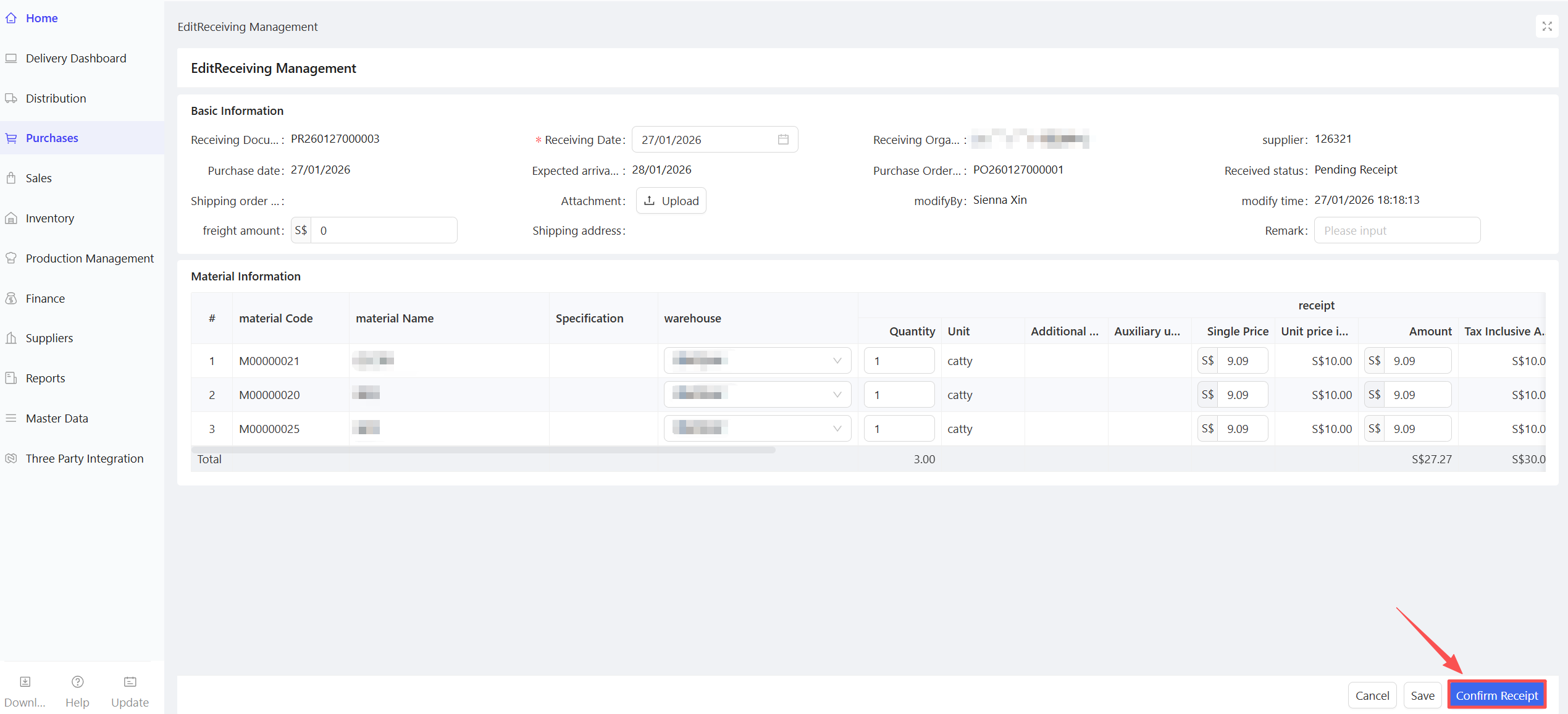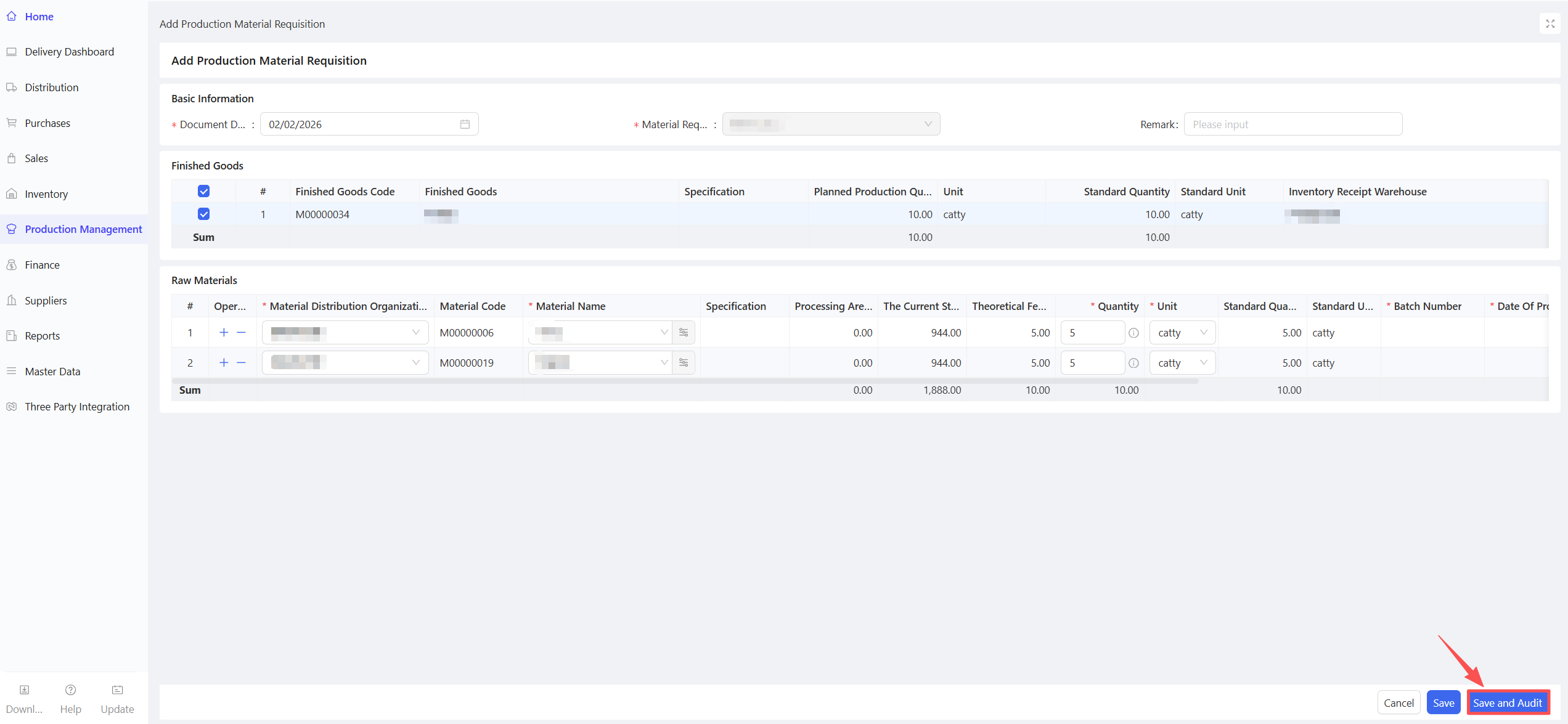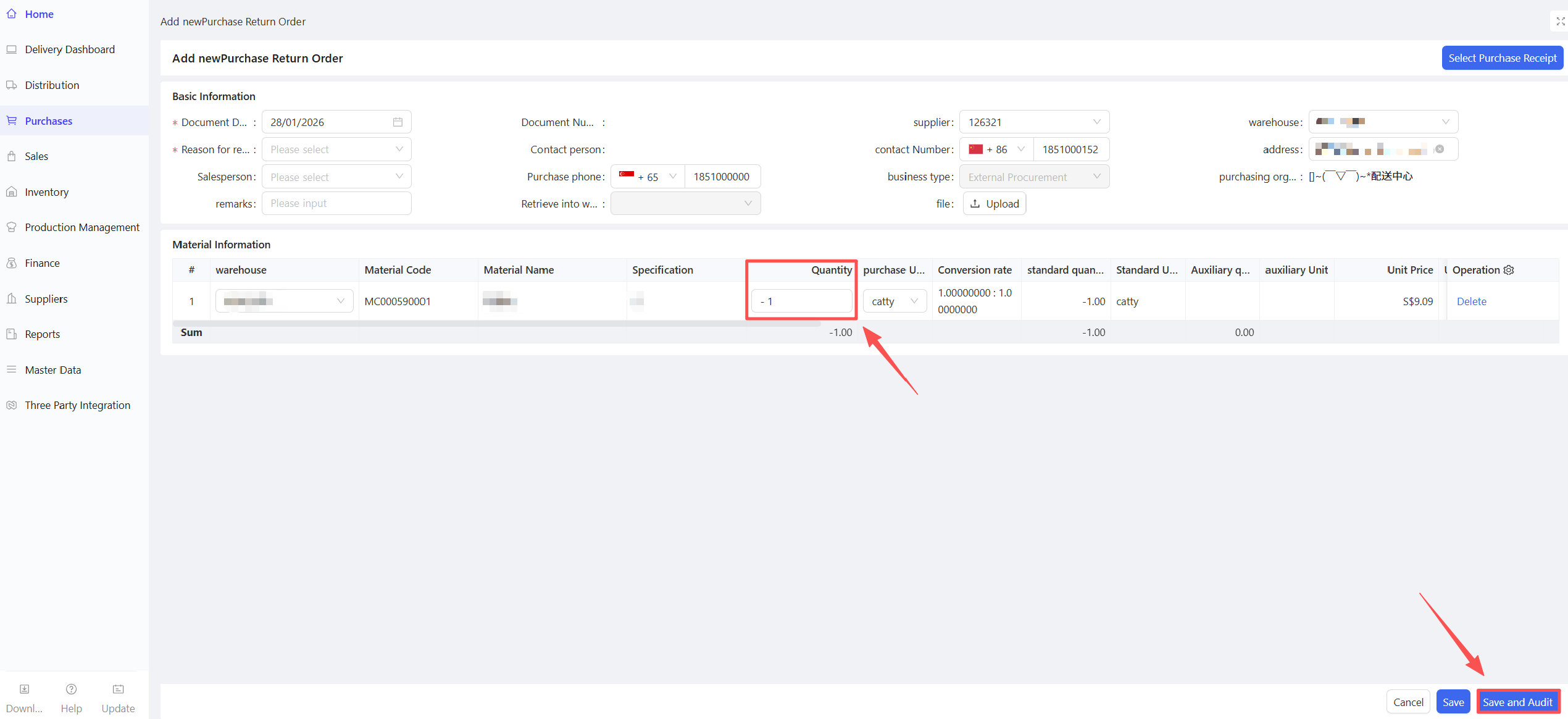 - Fill in the Material Procurement Quantity and Expected Arrival Date.