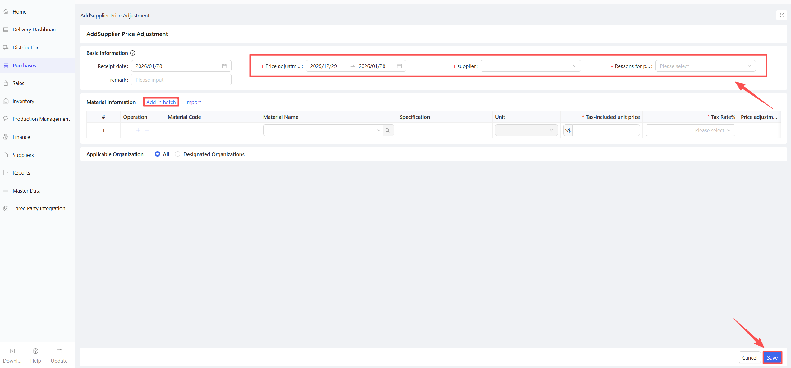 Price Adjustment During Receipt: The tax-inclusive unit price, tax-inclusive amount, and tax rate can be modified during receipt.