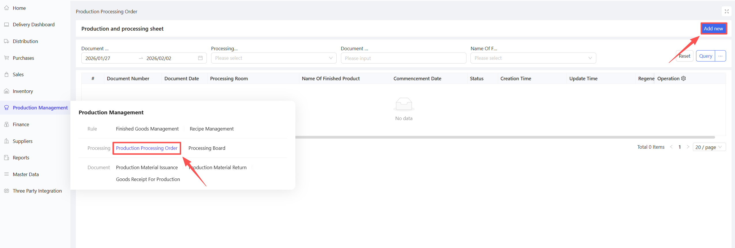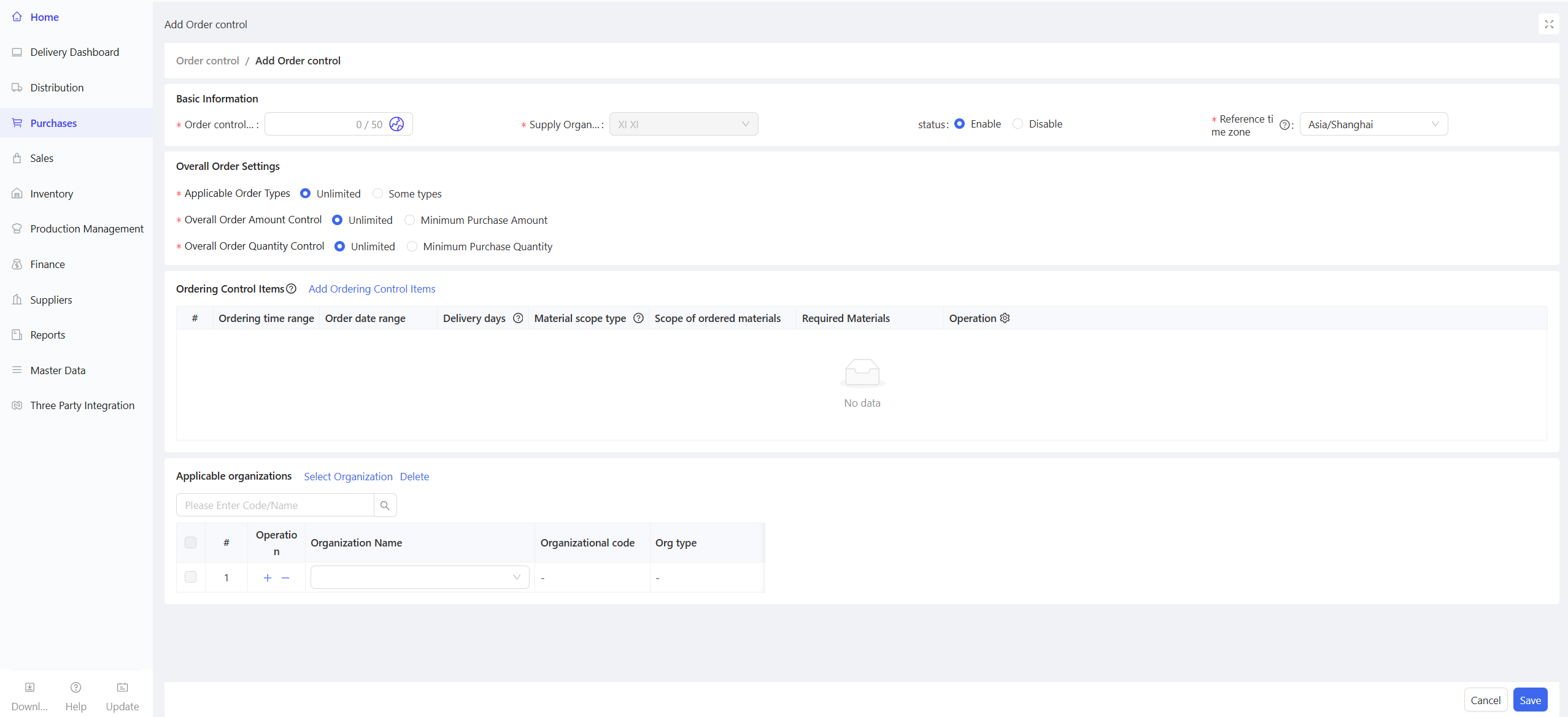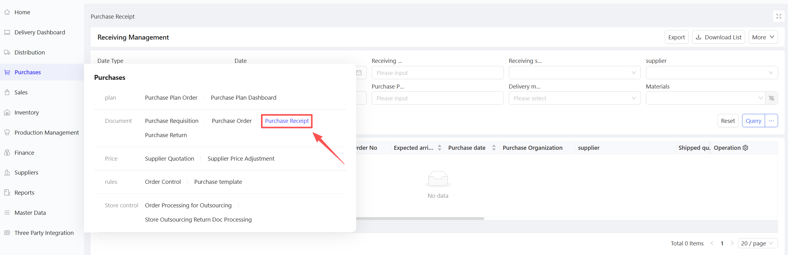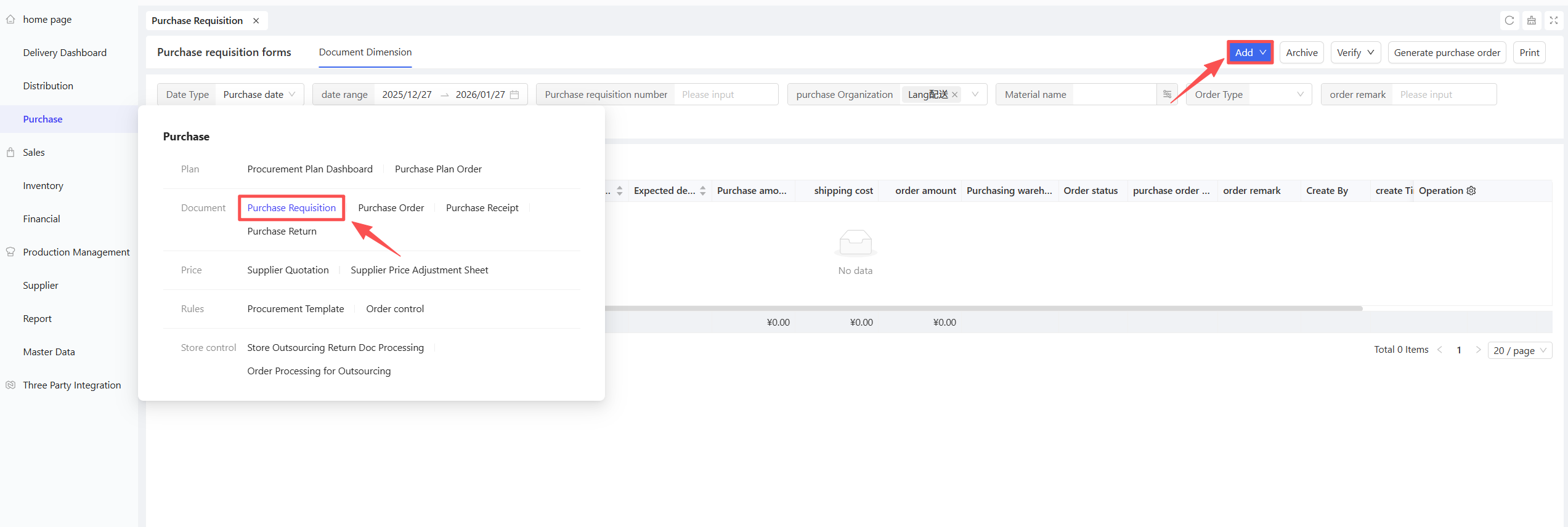 Procurement Management is a system module that tracks and manages all links and statuses of material movement during the procurement process of stores/distribution centers, with purchase orders as the core. It covers procurement planning, purchase requisitions, purchase orders, purchase receipts, purchase returns, etc. It flexibly supports three business processes:
