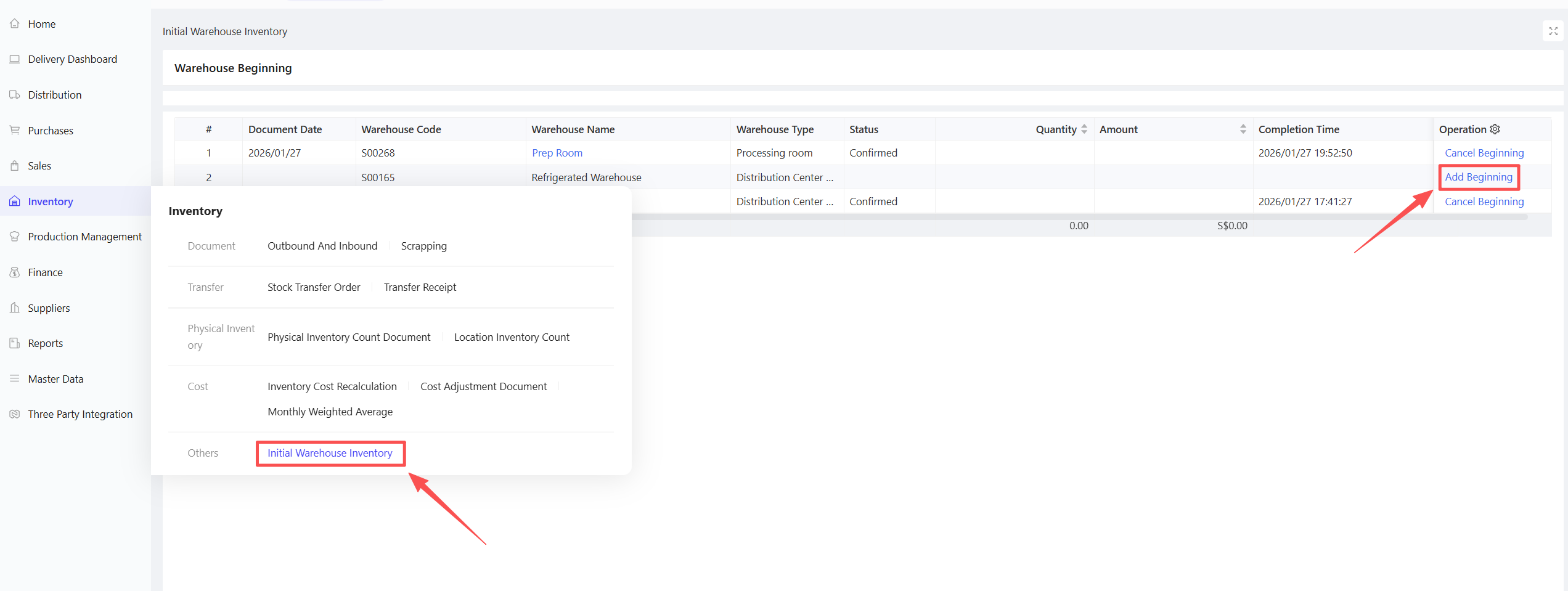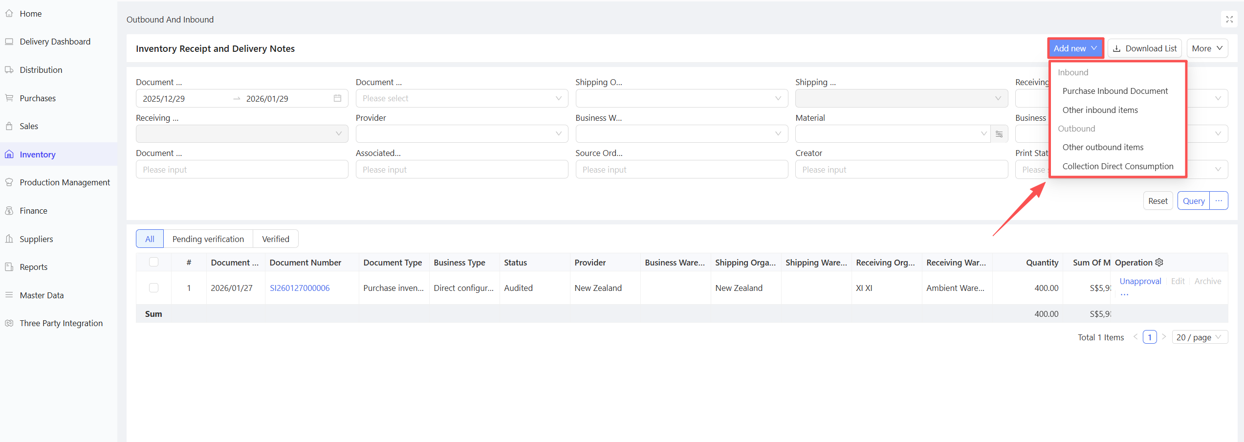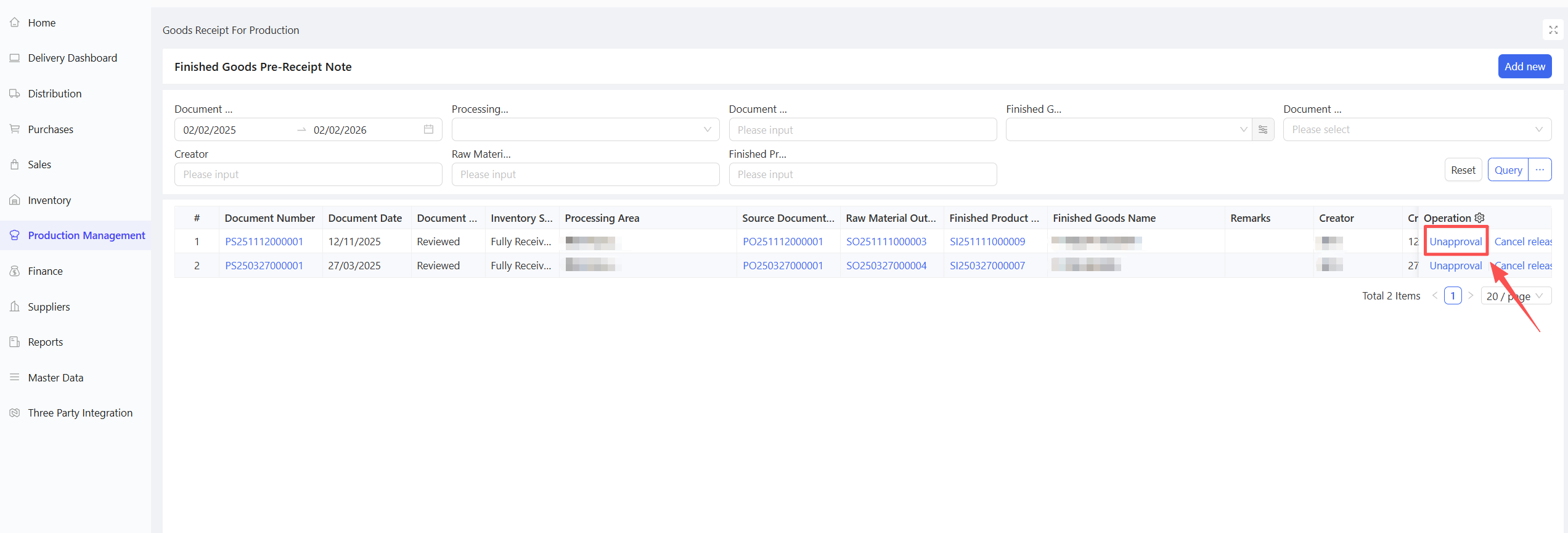 Cancel Receipt: If no downstream documents have been generated, canceling the receipt will delete the associated purchase warehousing document, allowing for re-receipt.