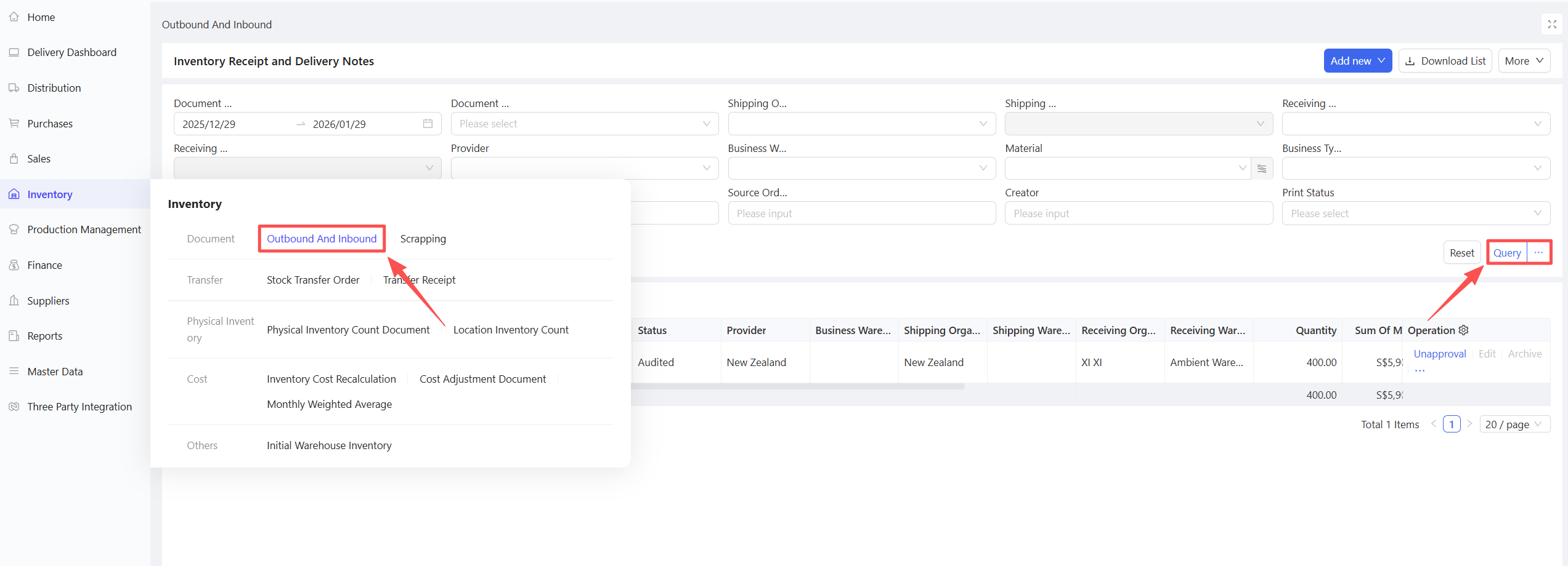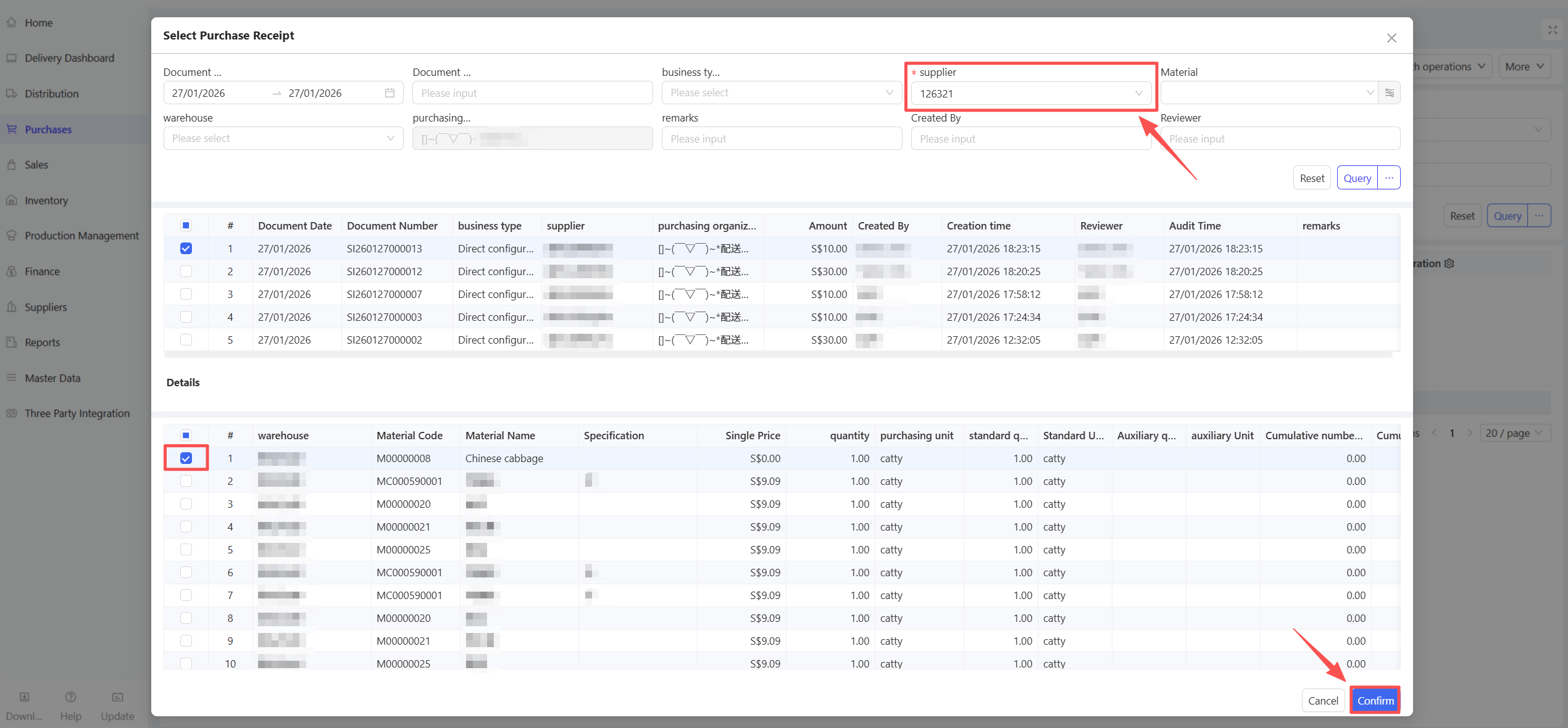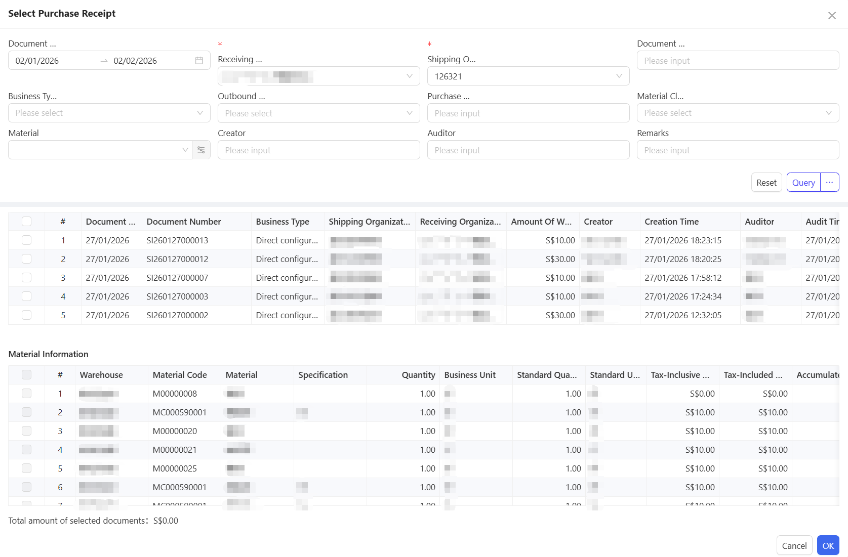 - Click Select Purchase Warehousing Document, choose Document Date and Supplier, and click Query.