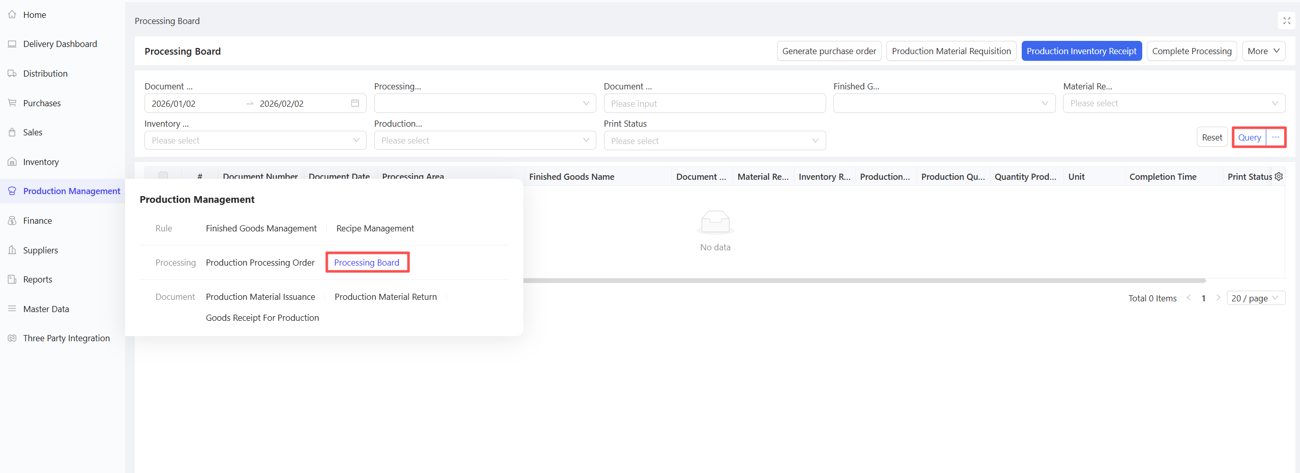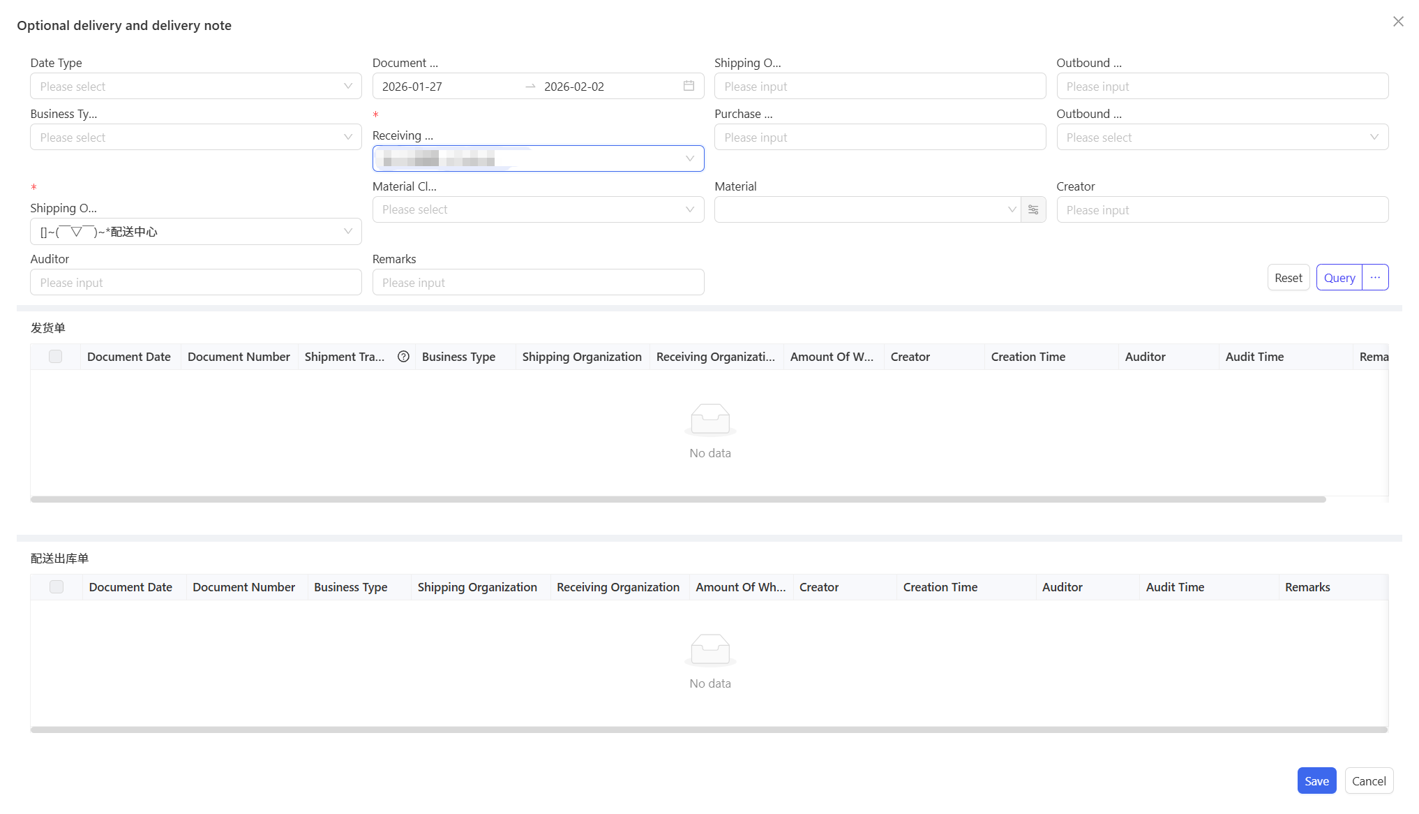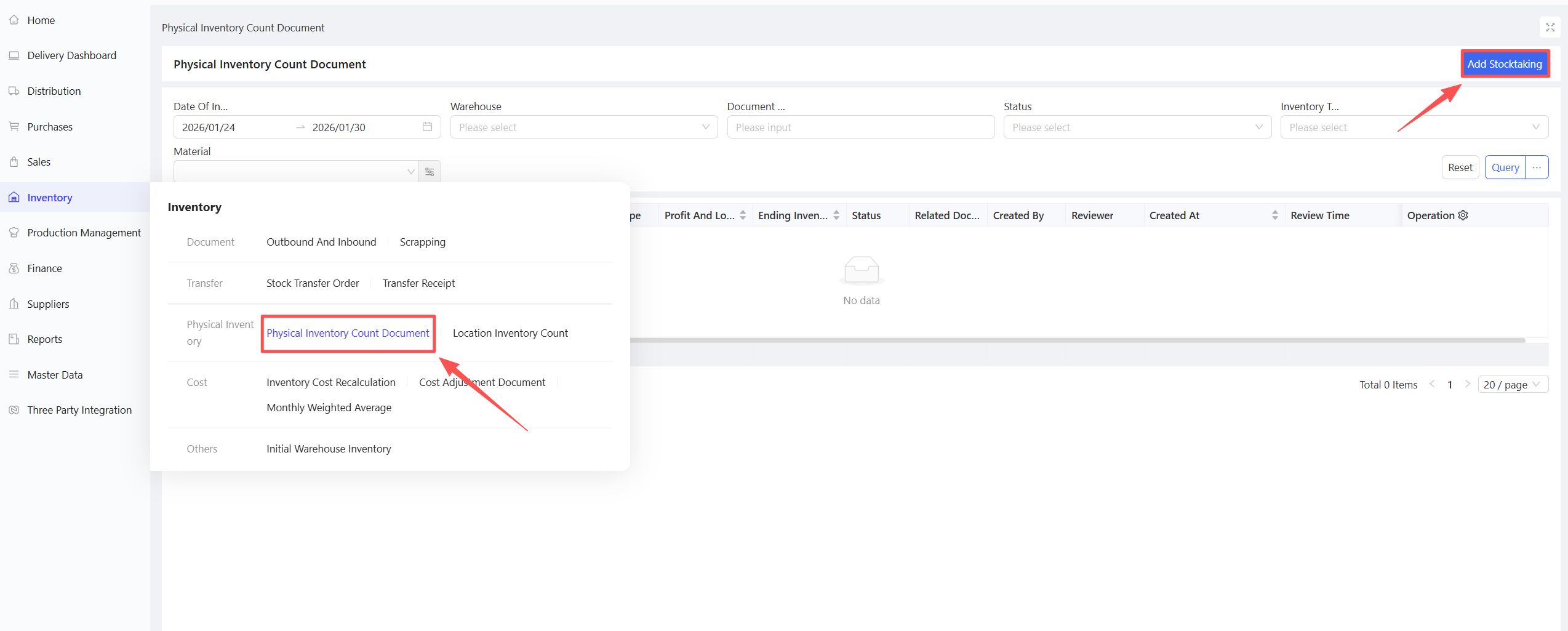 - Click Select Purchase Warehousing Document, choose Document Date and Supplier, and click Query.