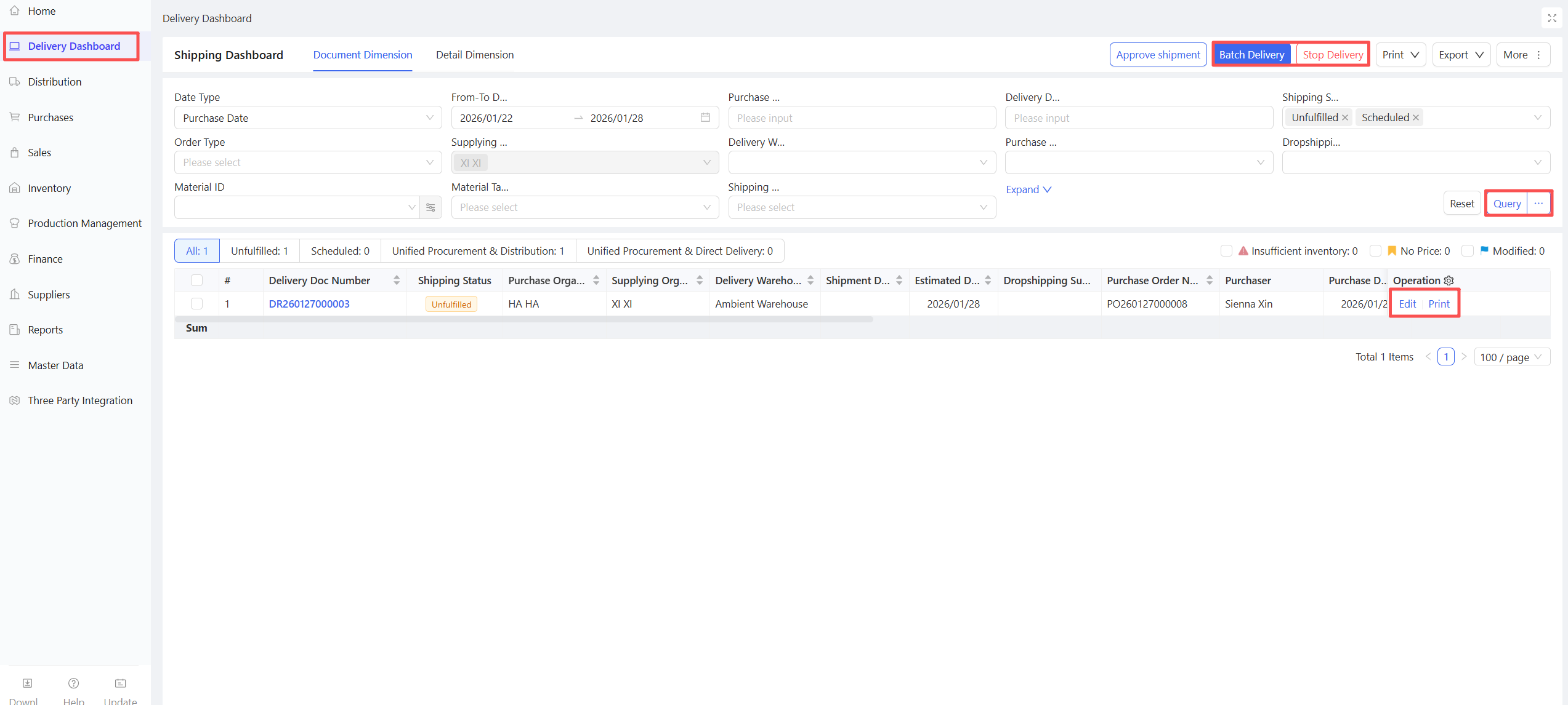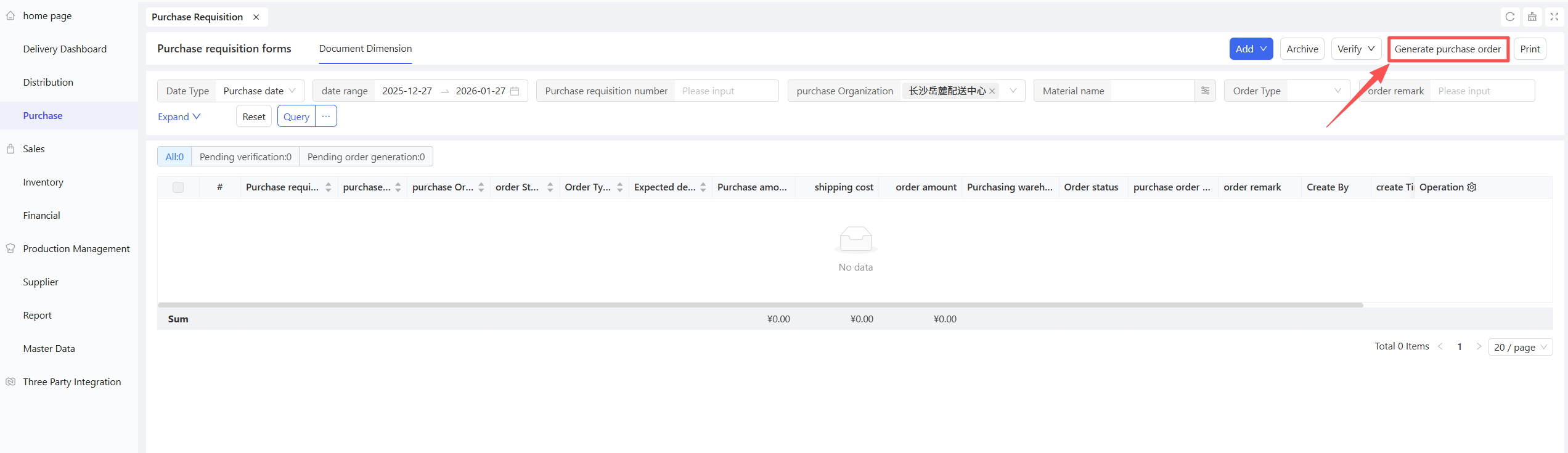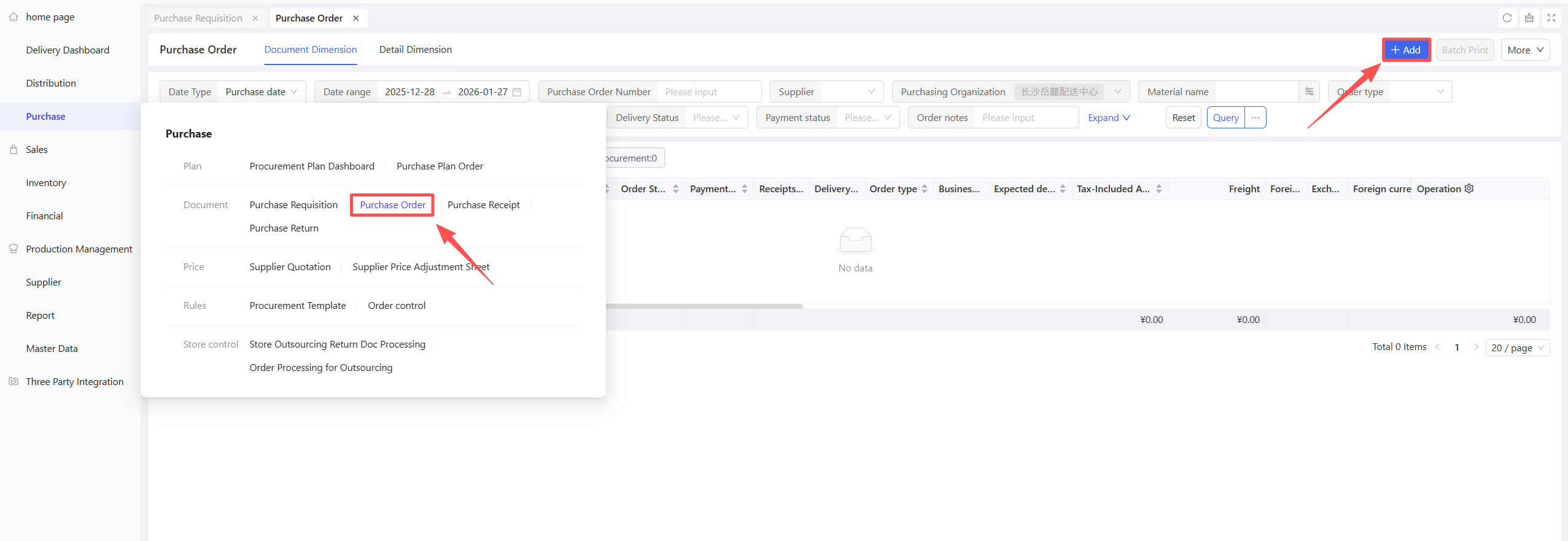 - Go to Distribution Center View > Supply Chain > Procurement Management > Purchase Order.