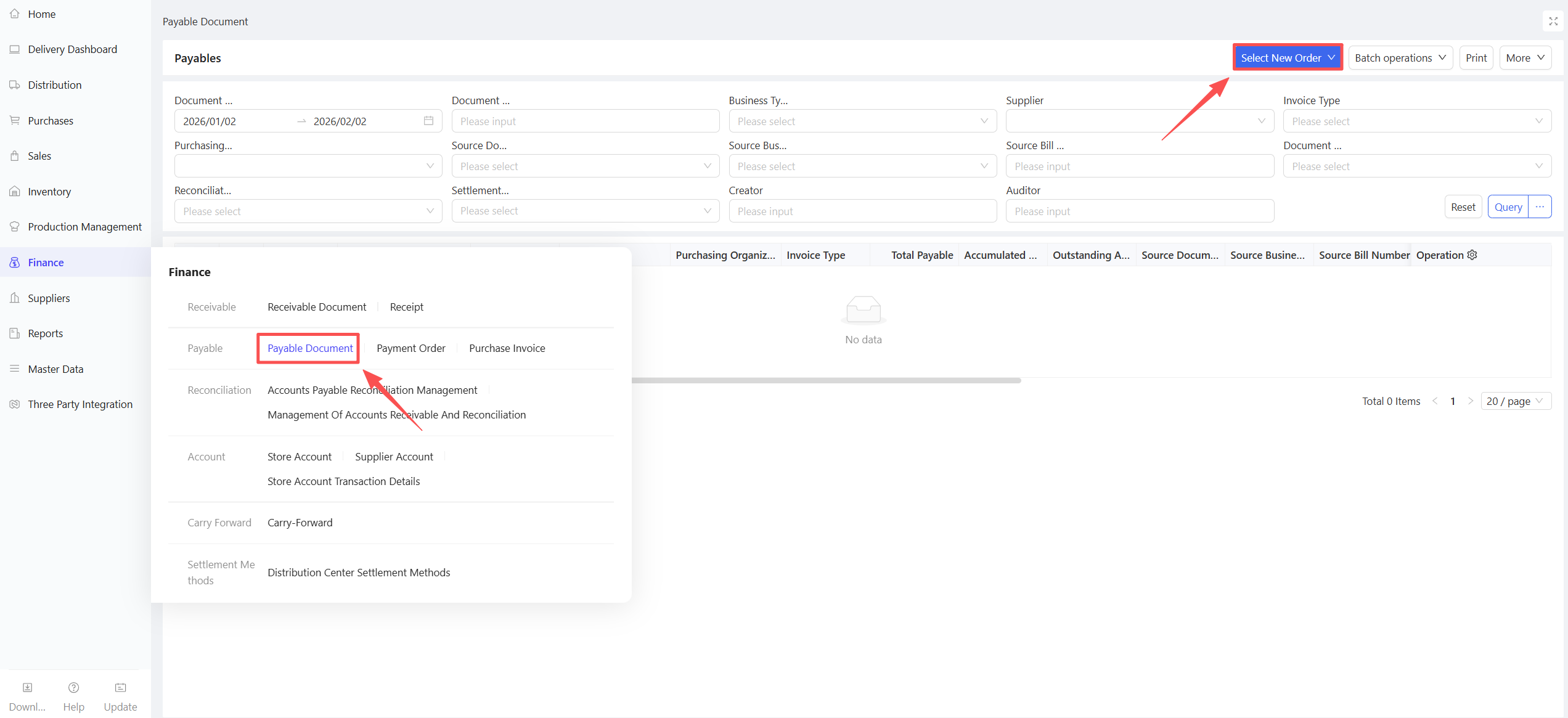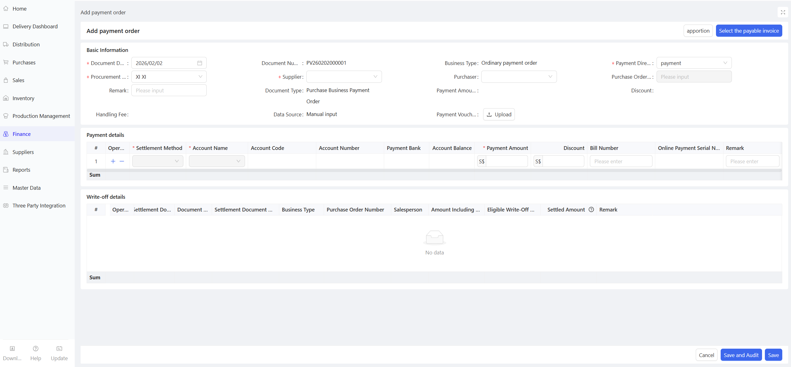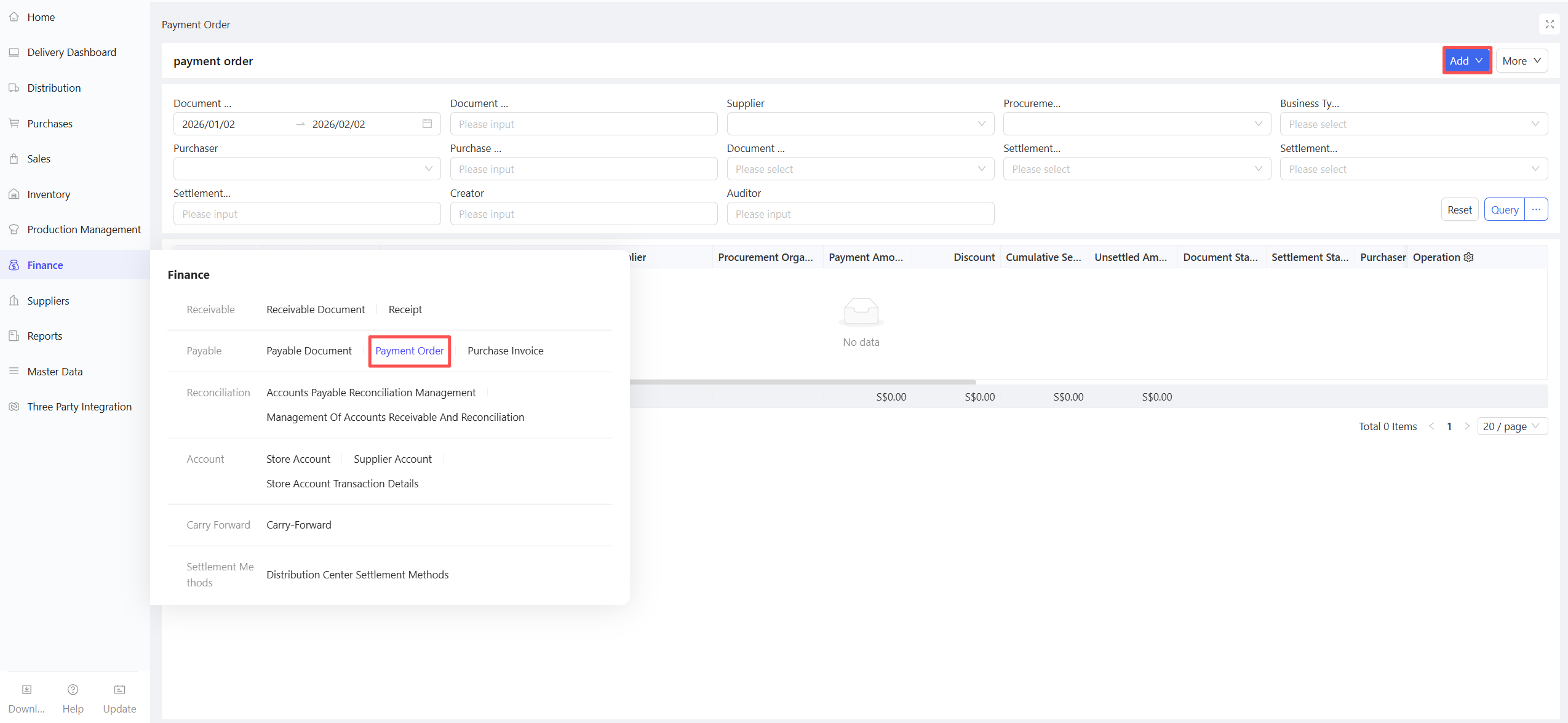 - Go to Group View/Distribution Center View/Store View > Supply Chain > Financial Management > Payment Order.