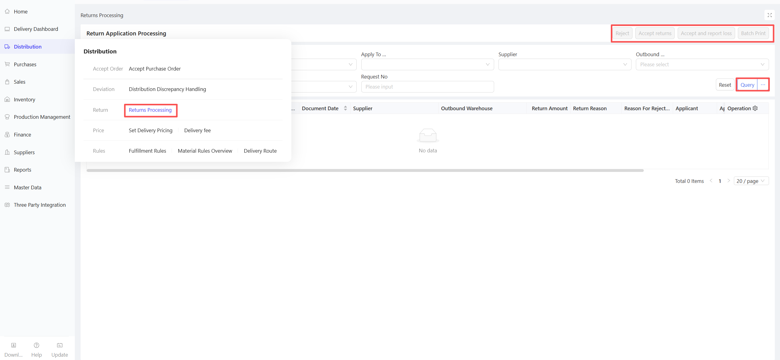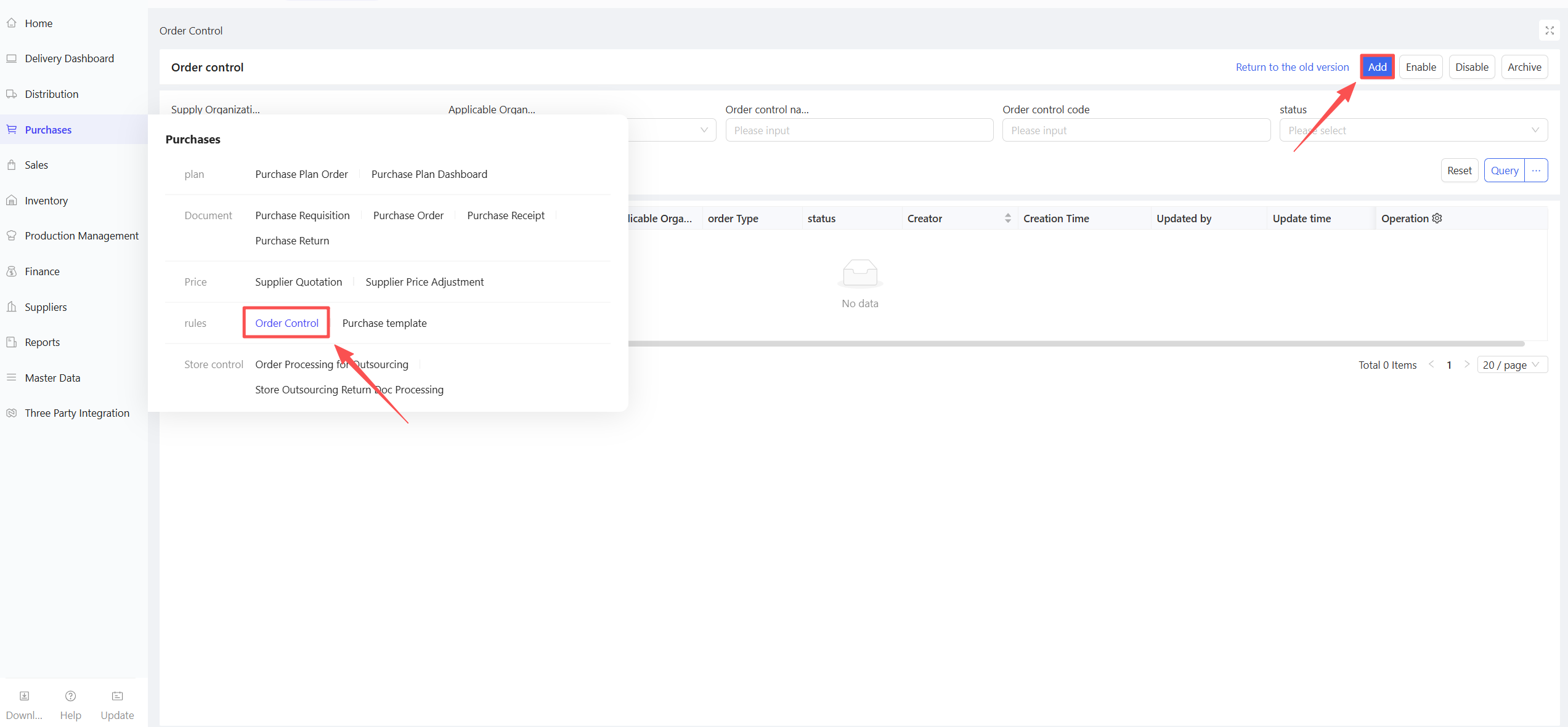 - Go to Distribution Center View > Supply Chain > Procurement Management > Purchase Return Order.