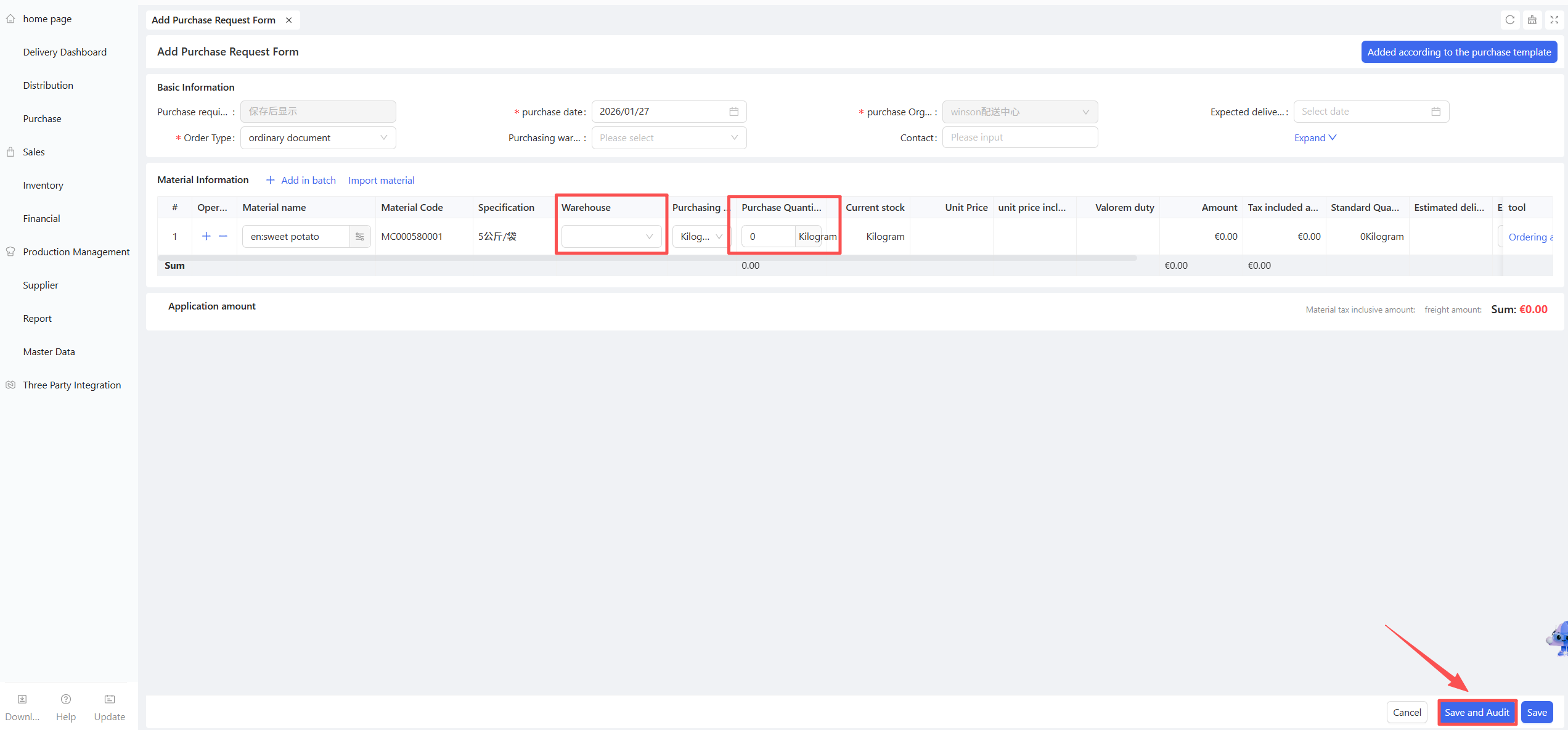 - Select Warehouse and Expected Arrival Date, then fill in the procurement quantity for each material.
