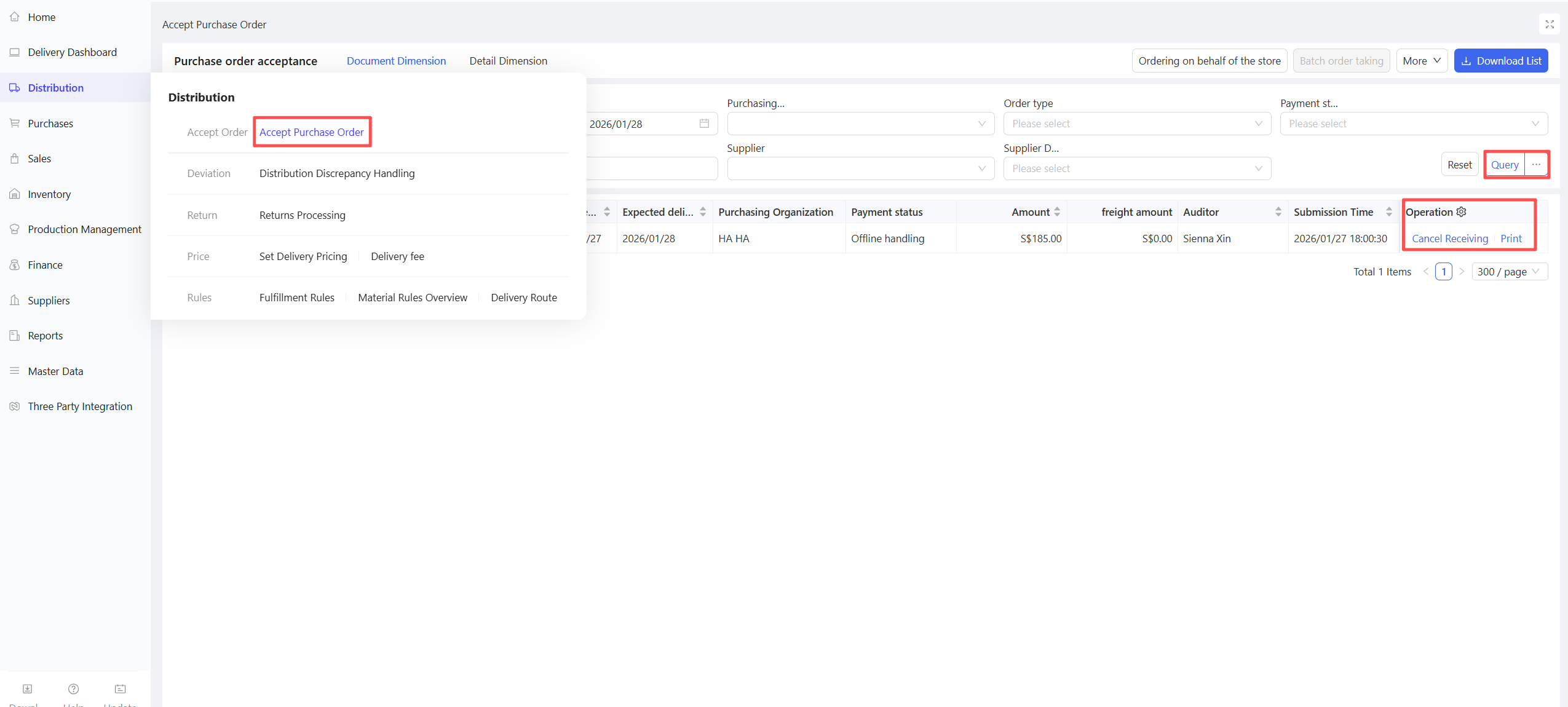 - For stores using prepayment: Payments made with orders are confirmed in Purchase Order Acceptance to complete recharge. After the store receives goods, accounts receivable and collection verification are automatically processed without manual settlement; unused amounts are deposited into the Store Account.