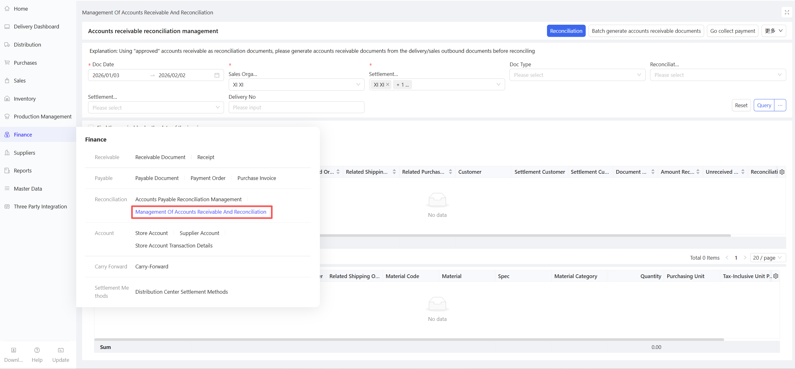This function is used for reconciliation between the distribution center and stores. Accounts receivable orders can be reconciled only after approval. It supports batch generation of accounts receivable orders, reconciliation, and collection in one integrated module.