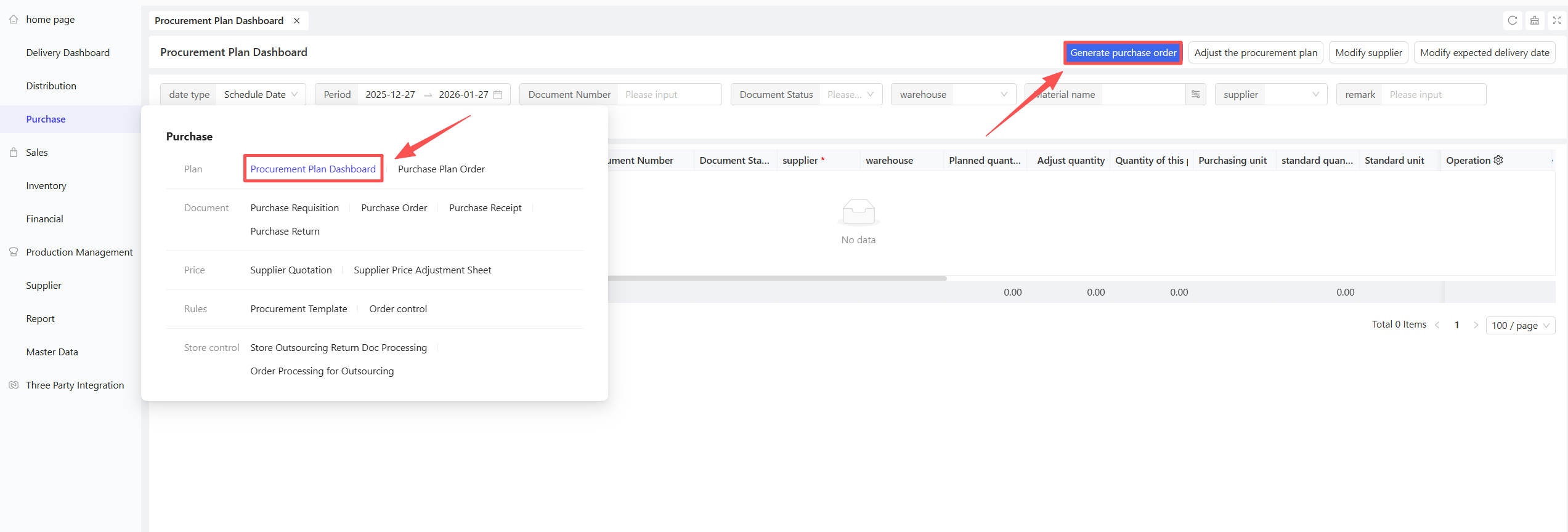 - Go to Distribution Center View > Supply Chain > Procurement Management > Procurement Planning.
