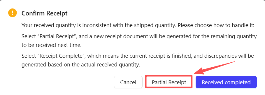 Multiple Receipts: If the received quantity does not match the shipped quantity, the system will prompt whether multiple receipts are required.
