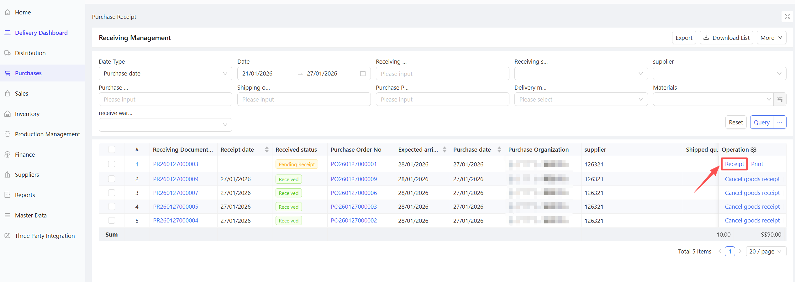 - Select the documents to be received and click Receipt.
