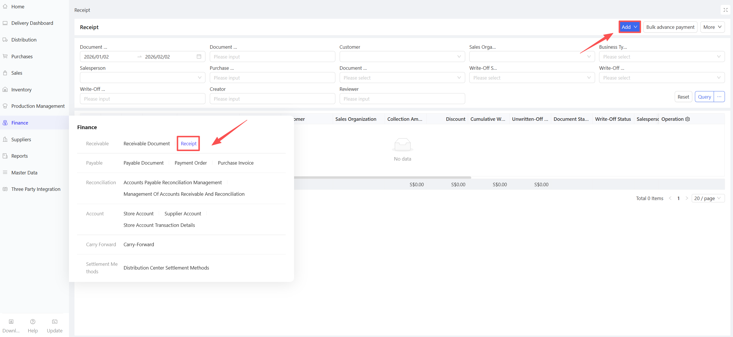 - Go to Group View/Distribution Center View > Supply Chain > Financial Management > Collection Order.