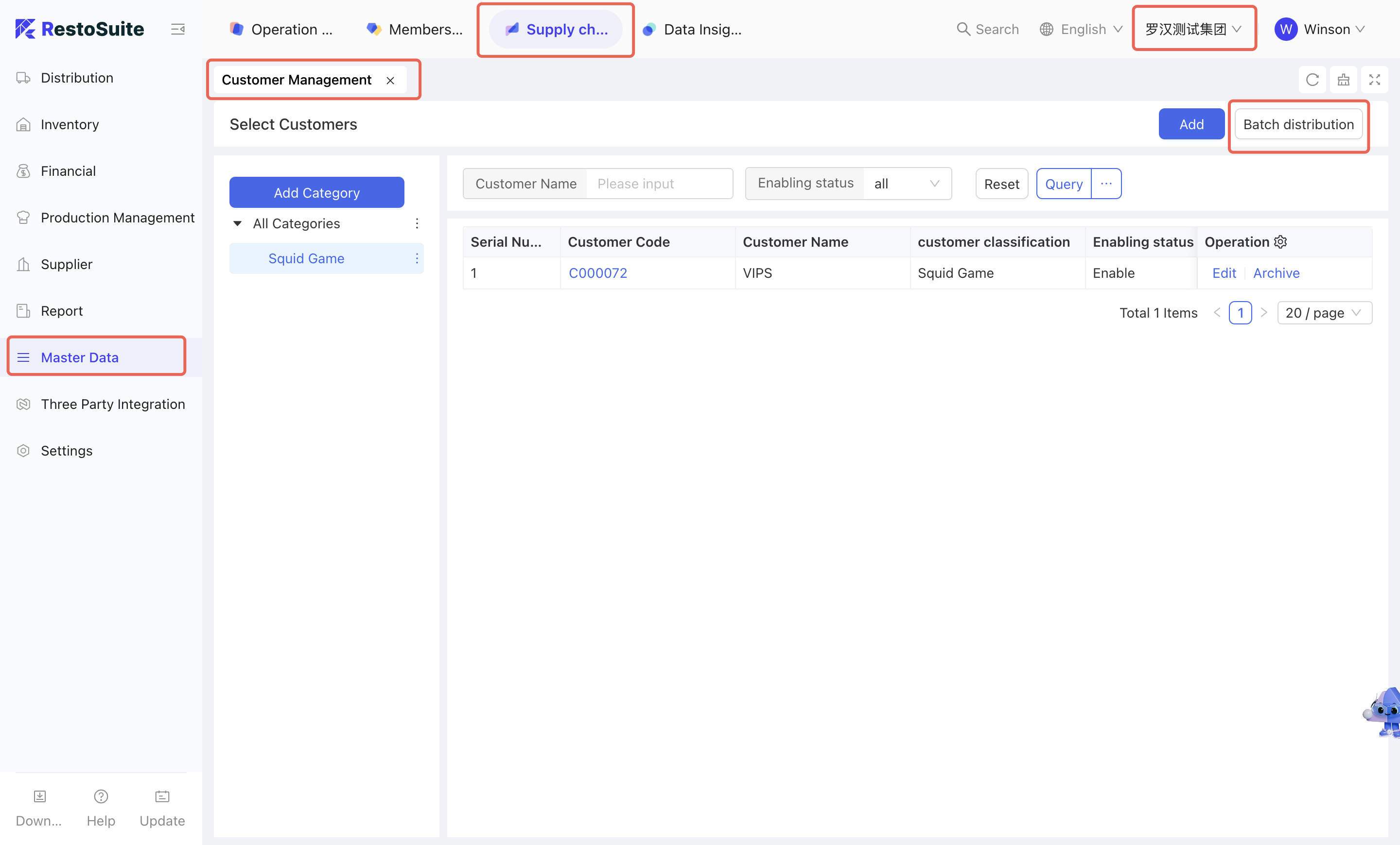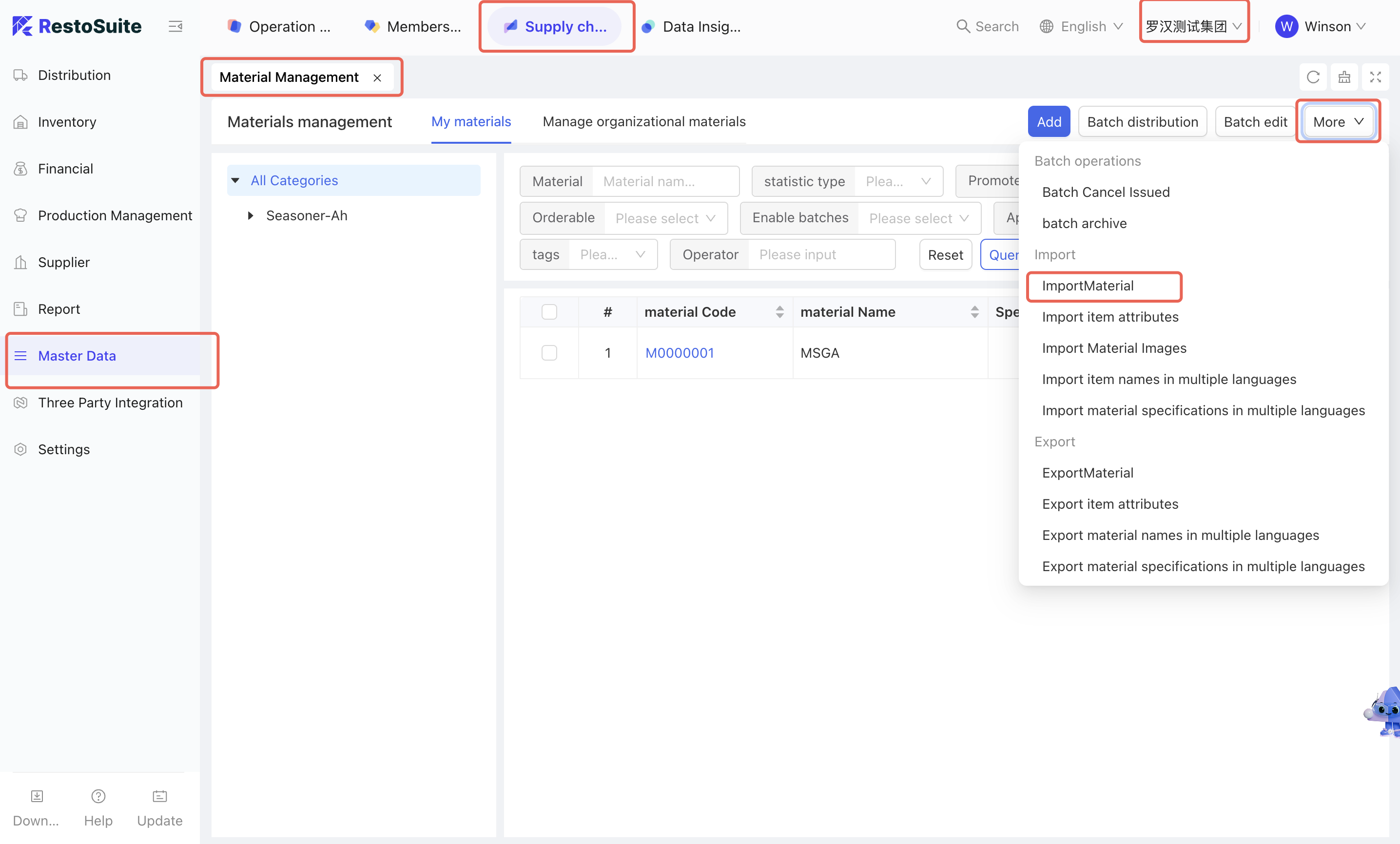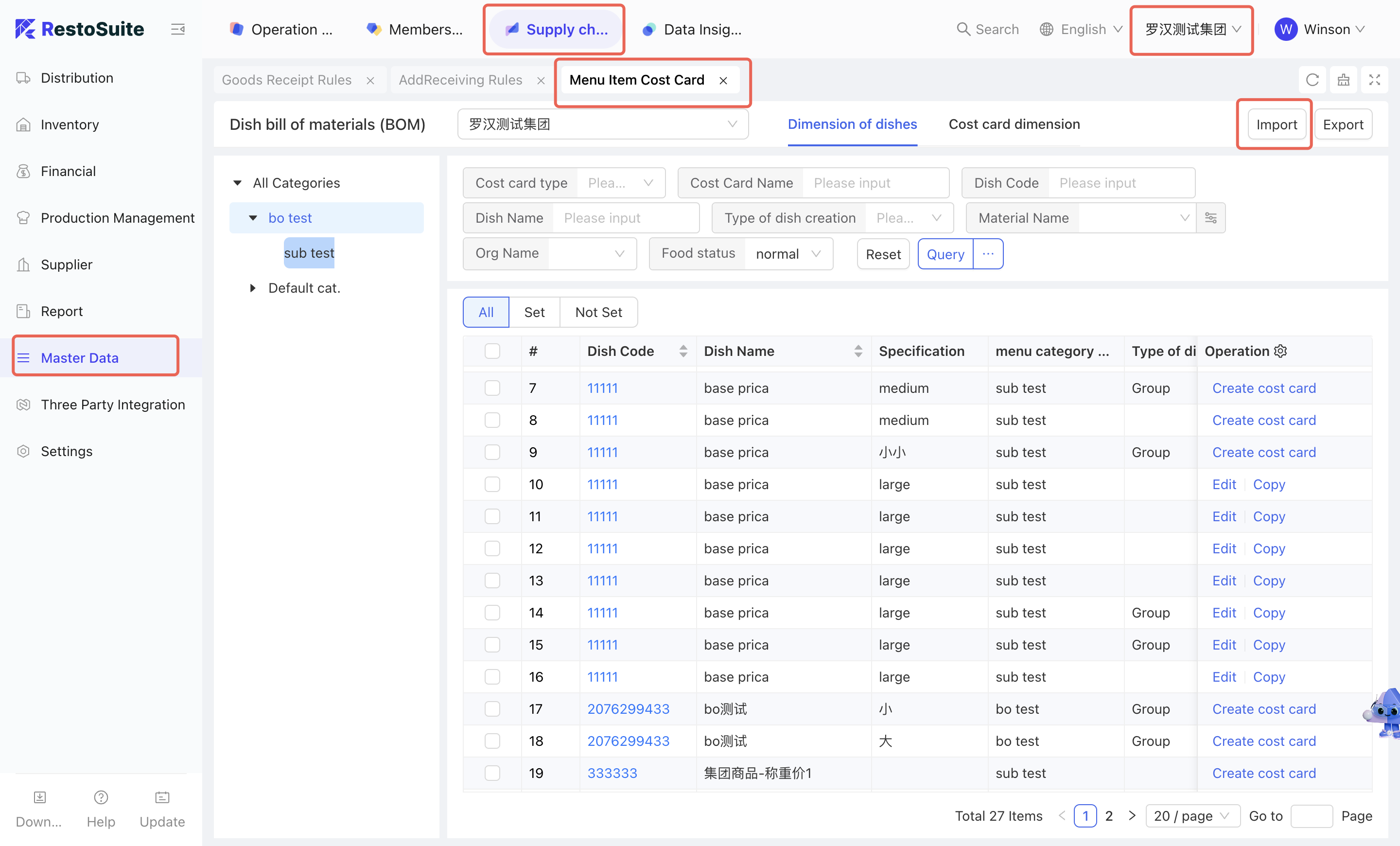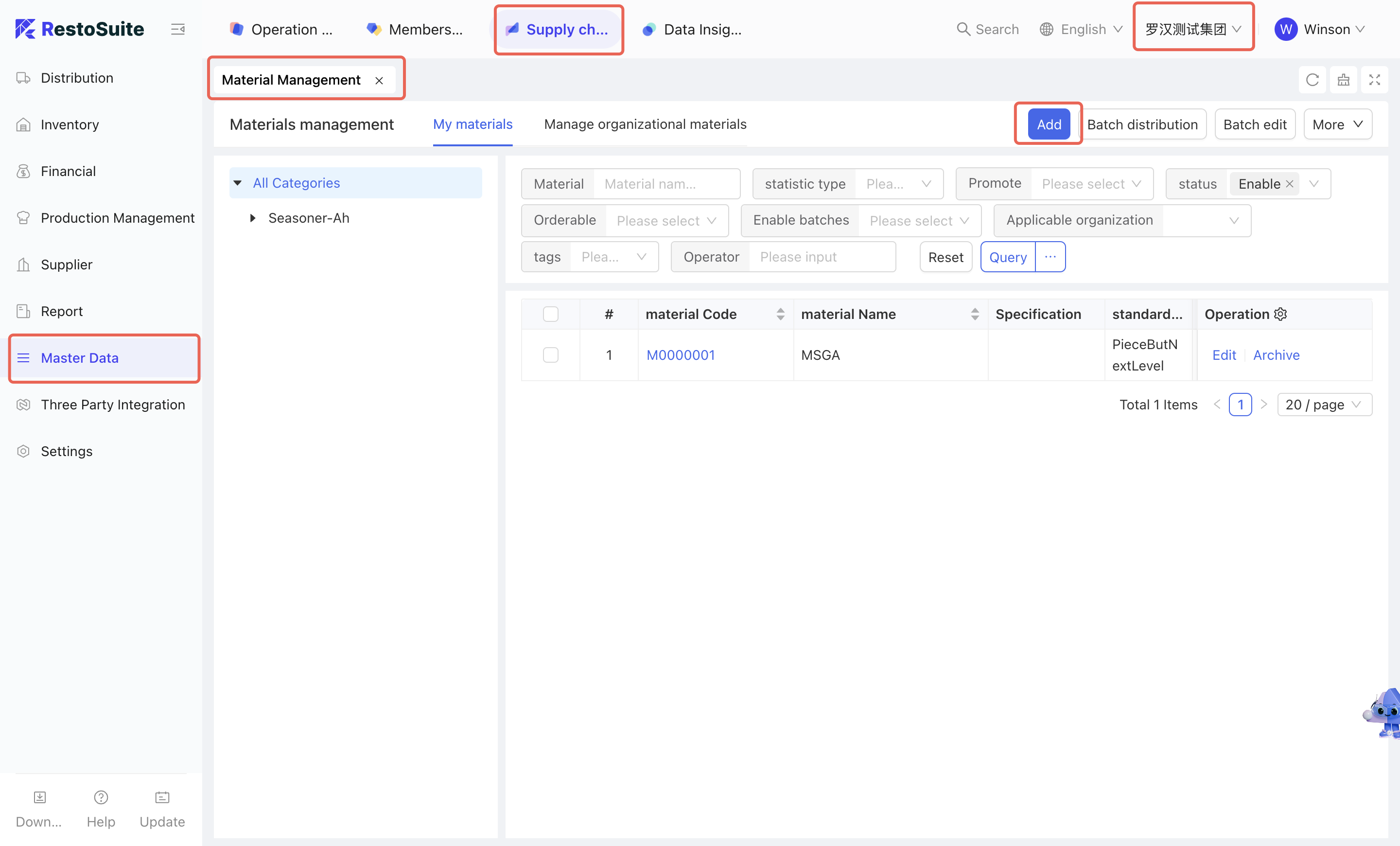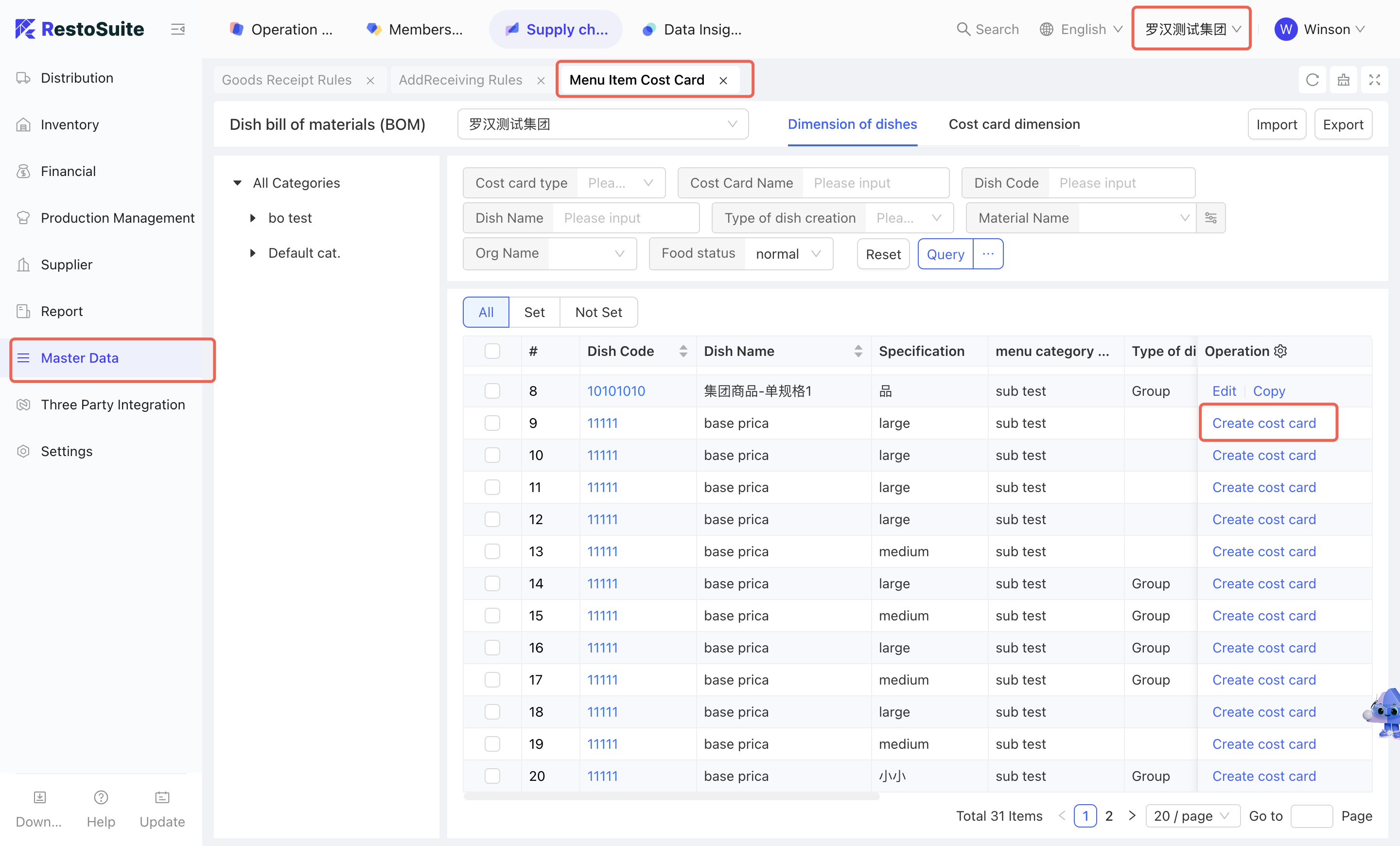 As the foundational data hub of the supply chain, Master Data Management integrates Organization Settings, Material Management, Warehouse Management, Receiving Rules, Menu Item Cost Cards, and Customer Management. By centralizing the creation and maintenance of basic data, this module empowers the group to achieve unified oversight and control across the entire supply chain system.