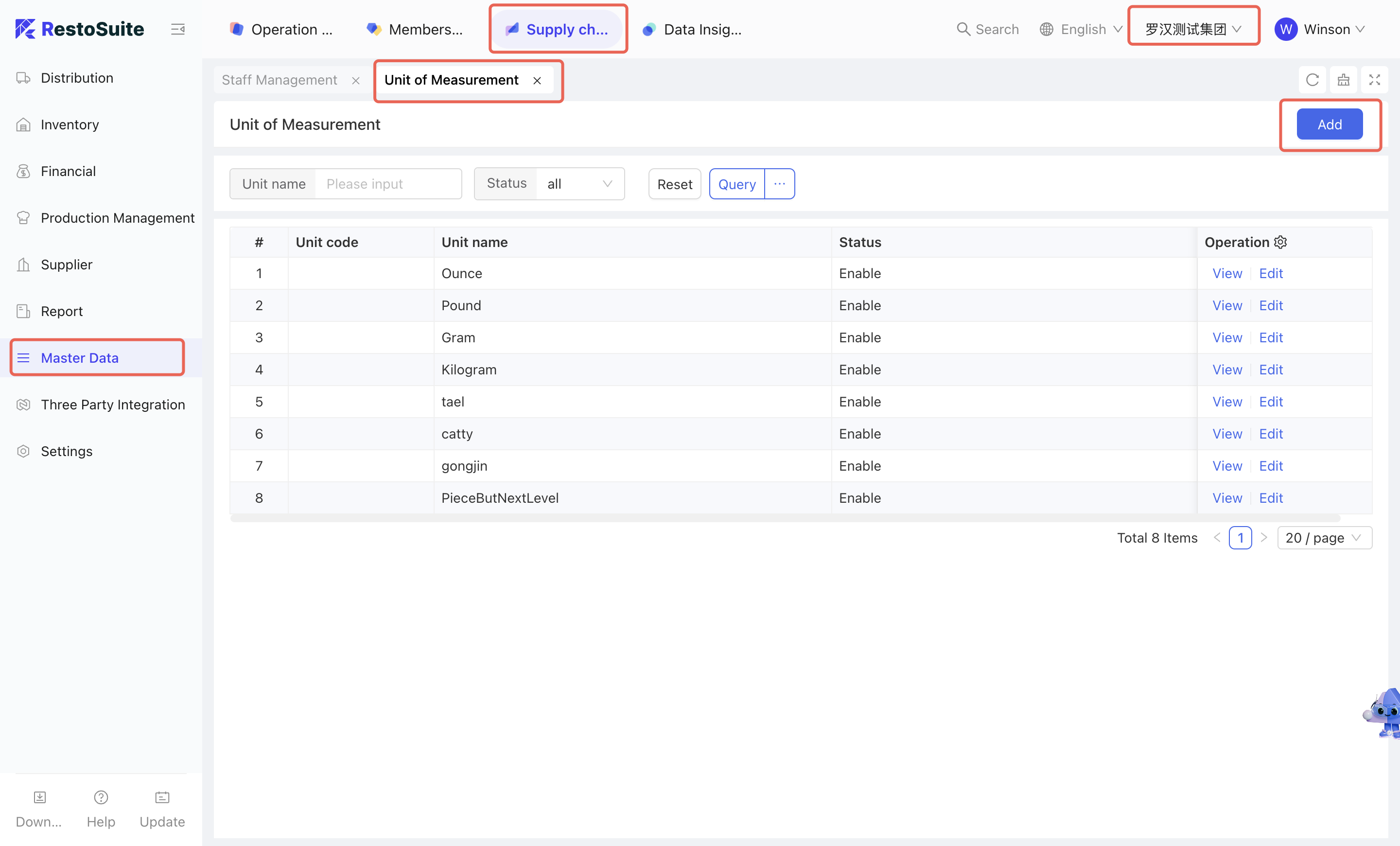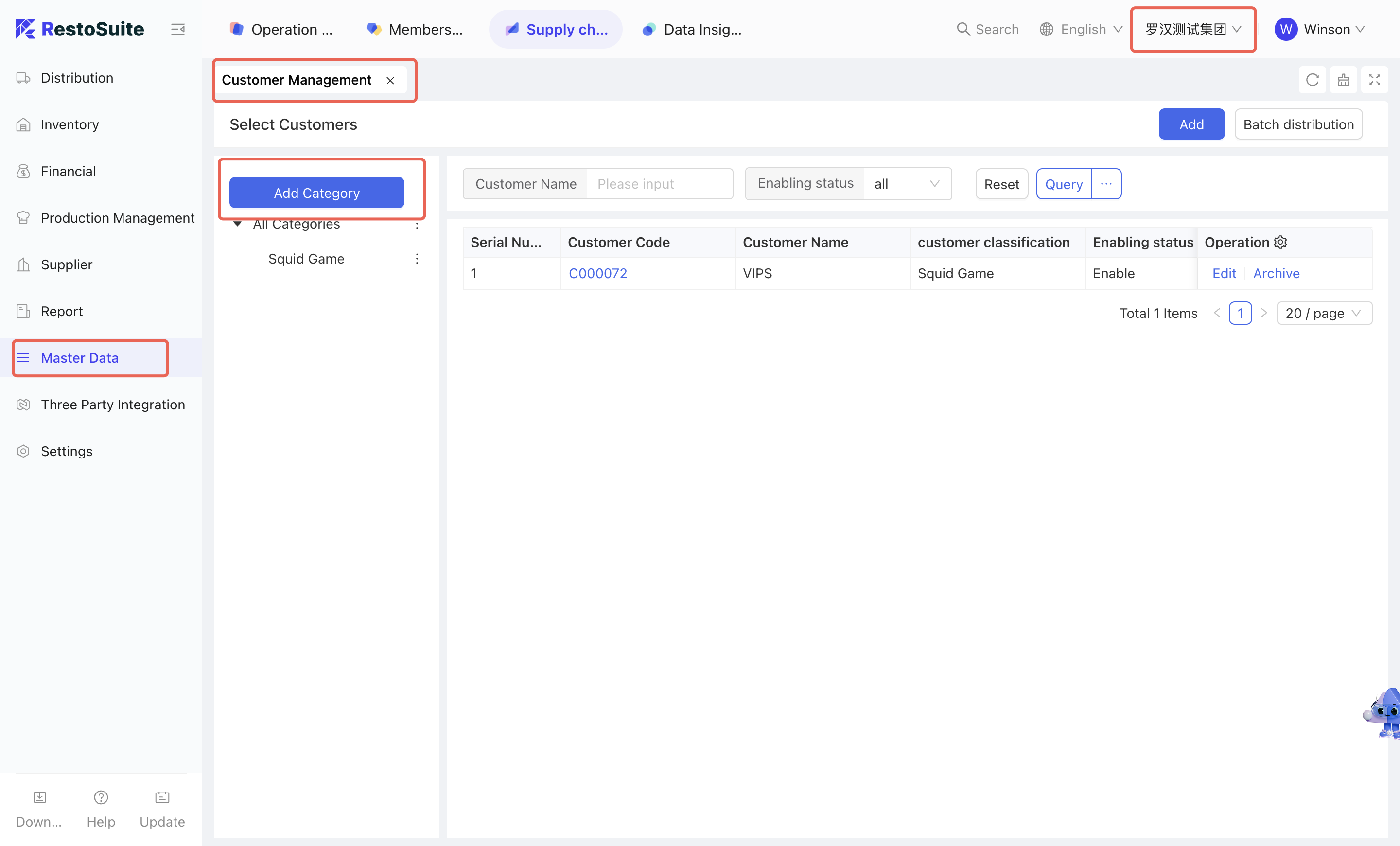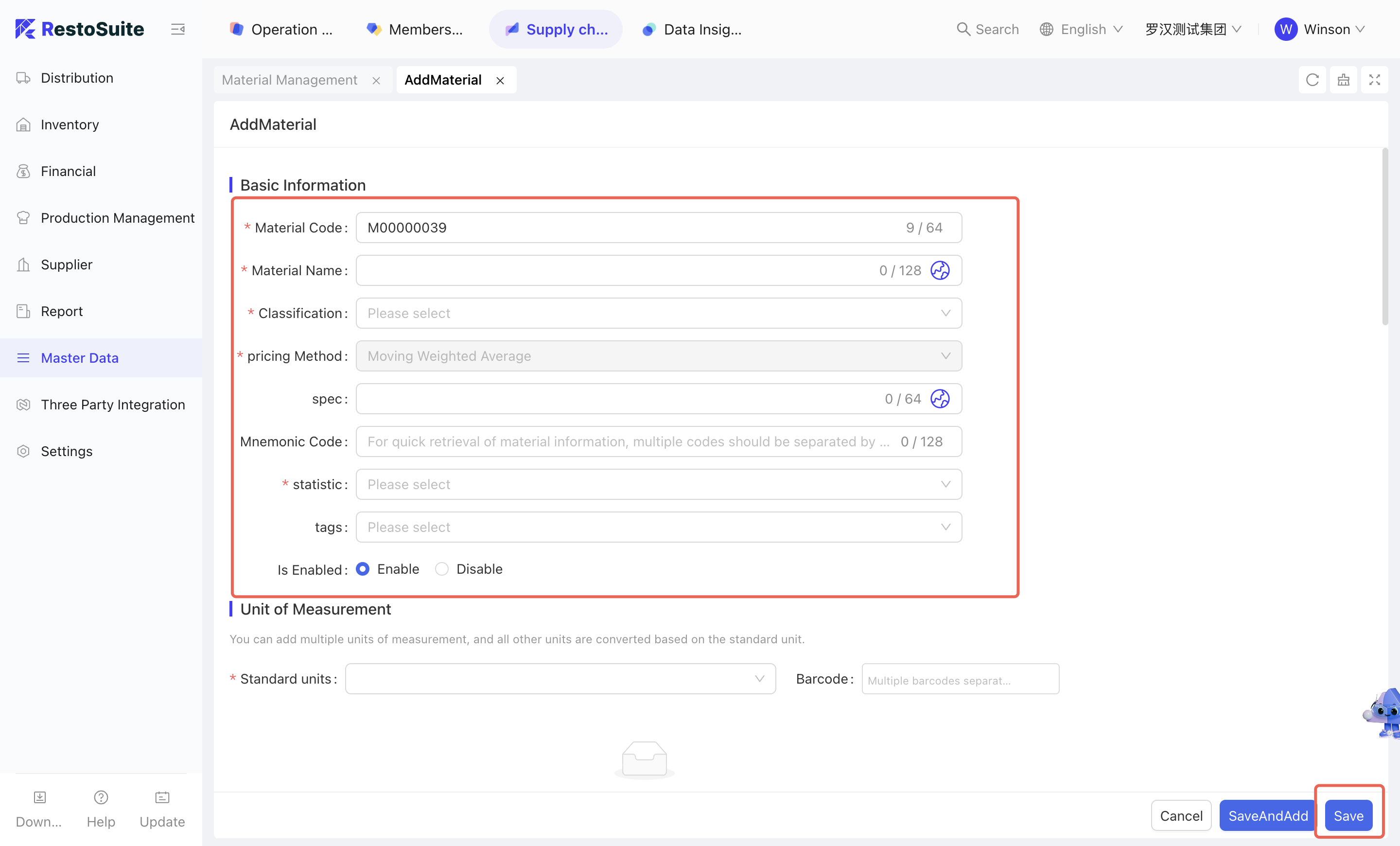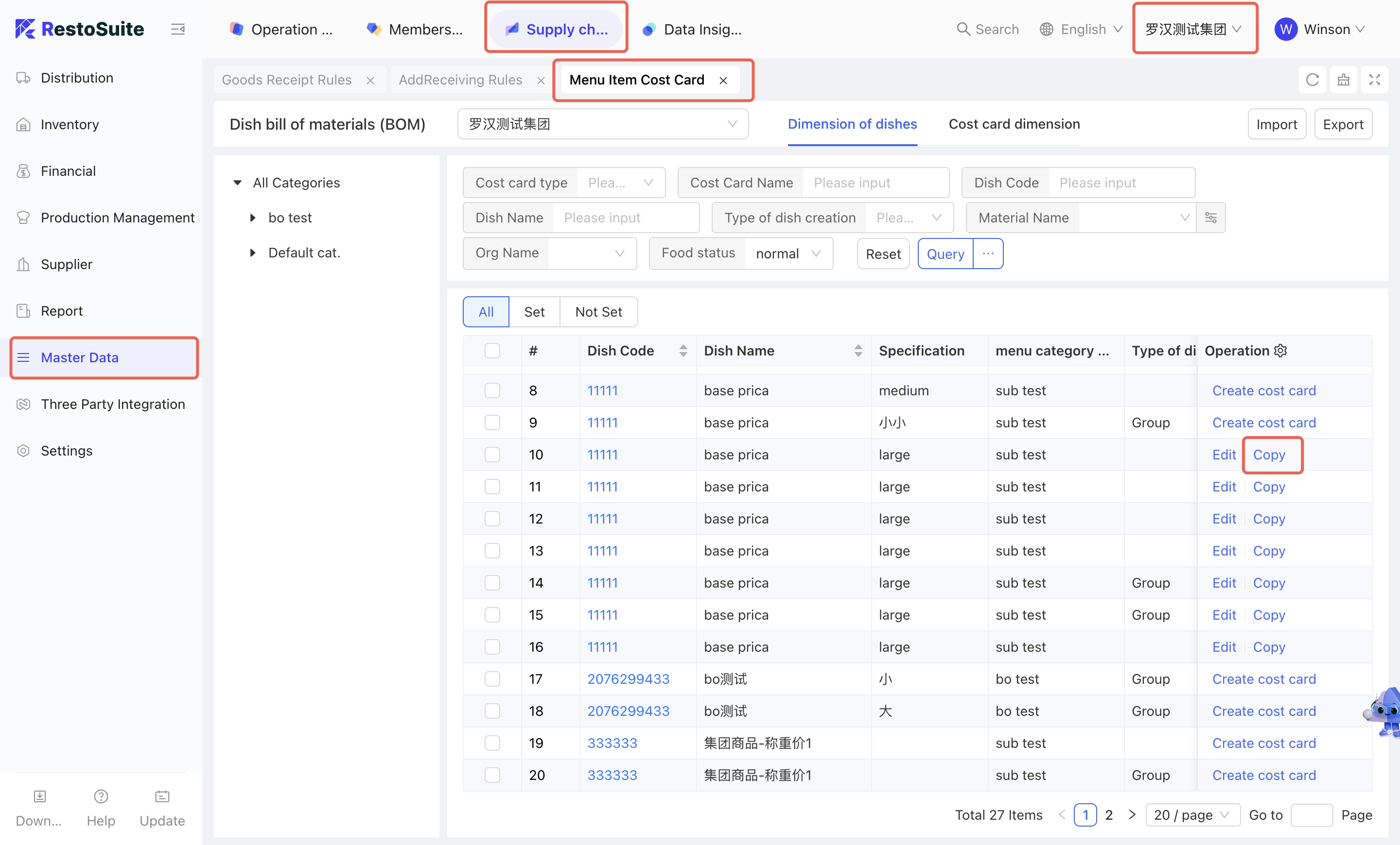 As the foundational data hub of the supply chain, Master Data Management integrates Organization Settings, Material Management, Warehouse Management, Receiving Rules, Menu Item Cost Cards, and Customer Management. By centralizing the creation and maintenance of basic data, this module empowers the group to achieve unified oversight and control across the entire supply chain system.