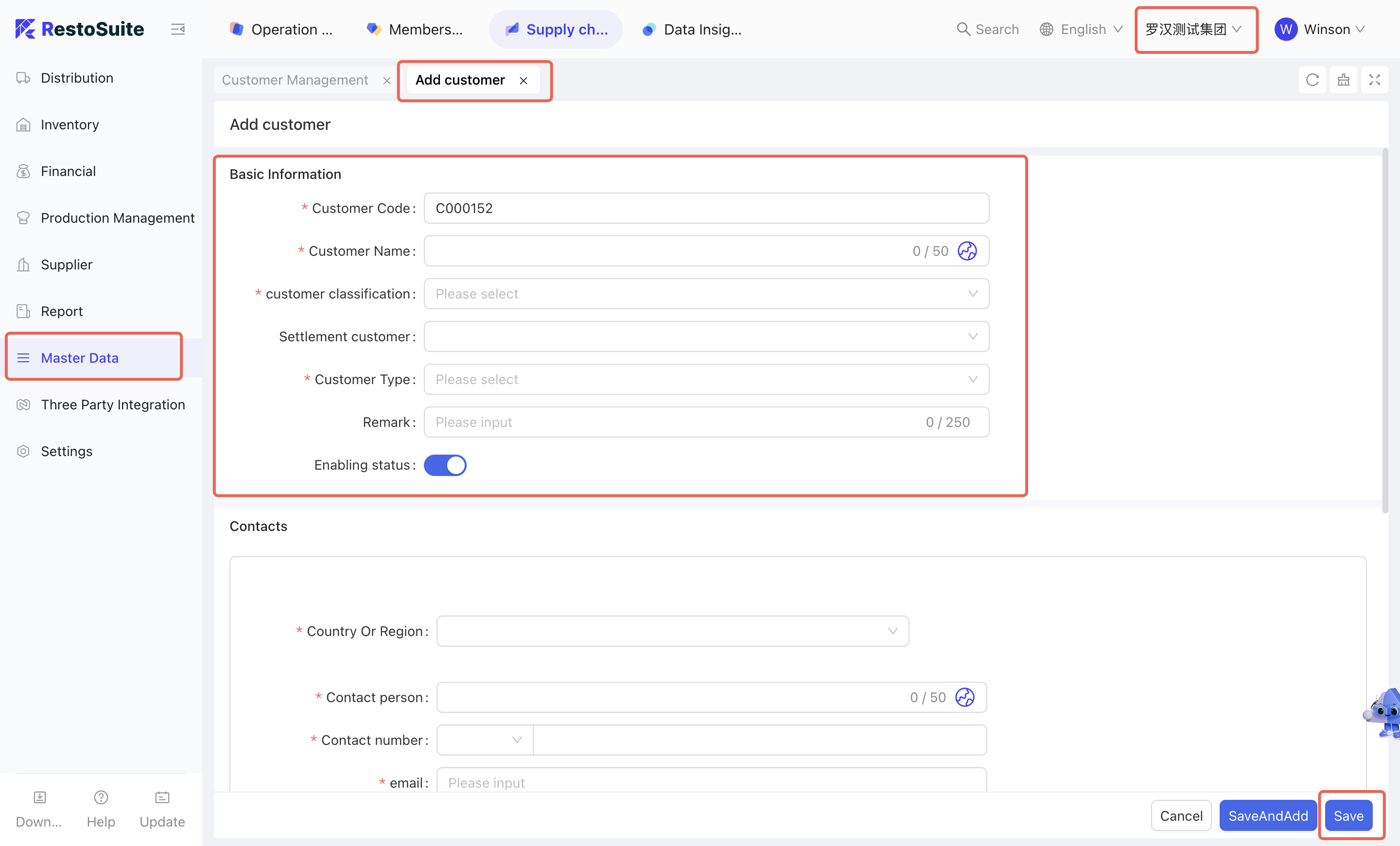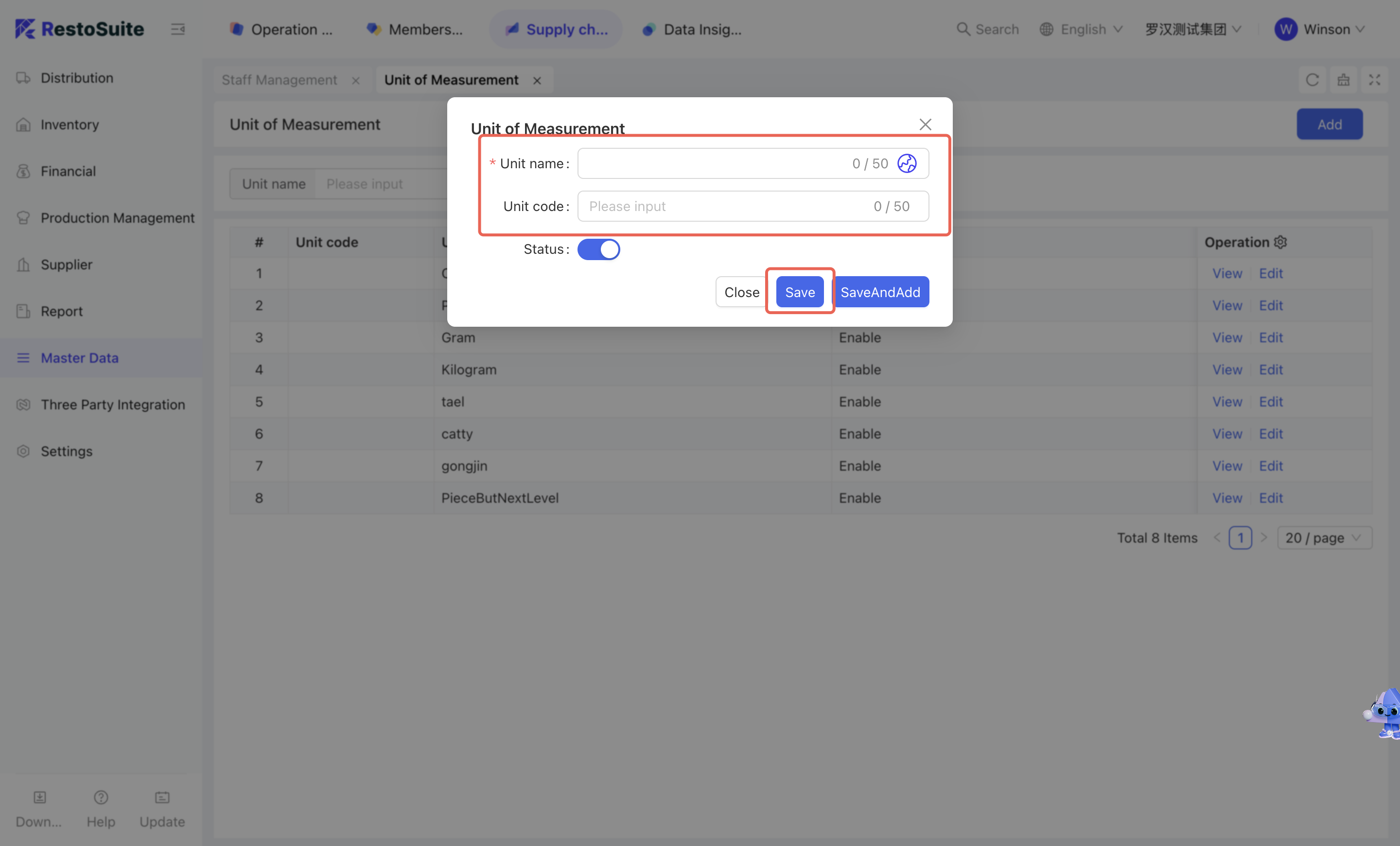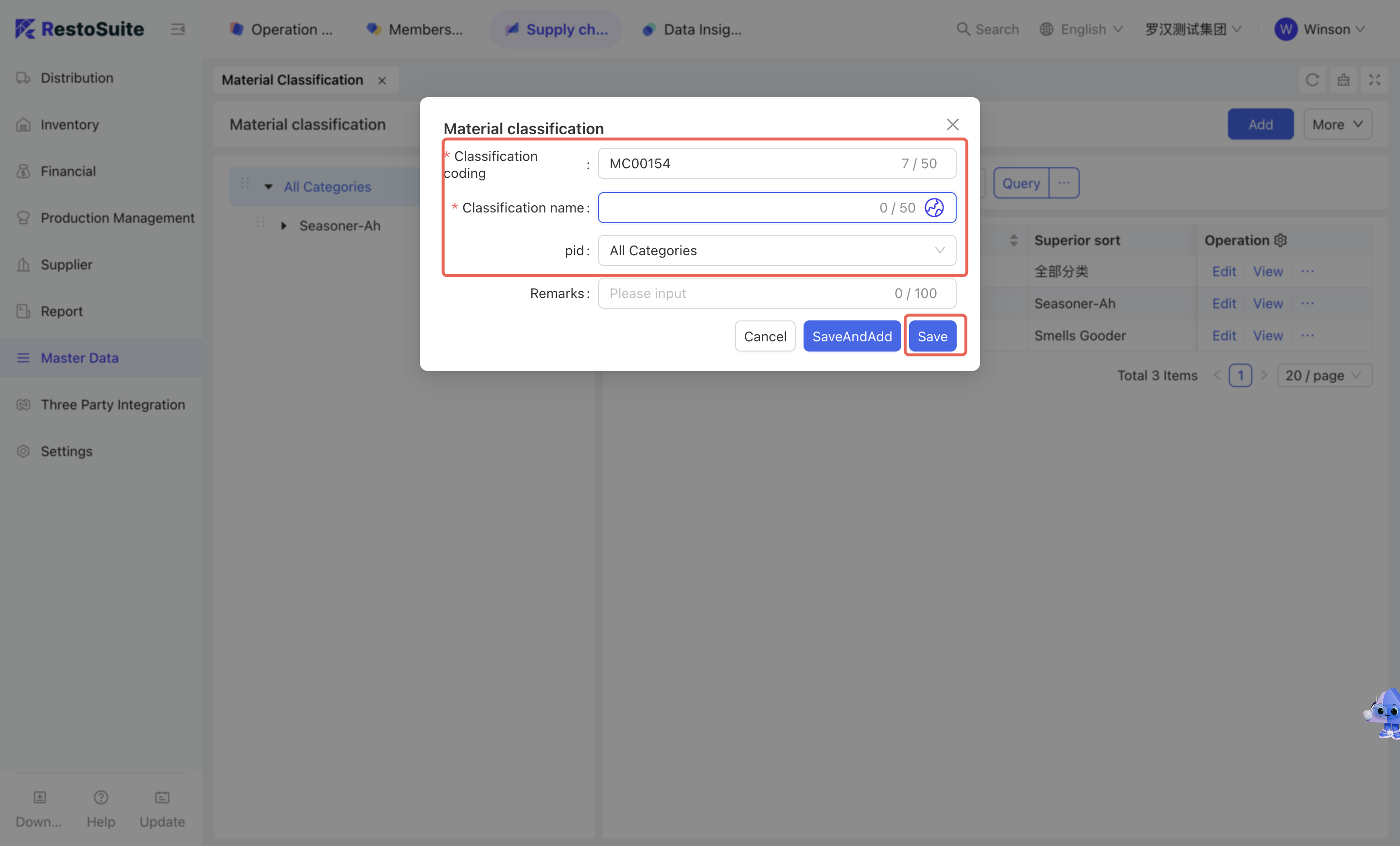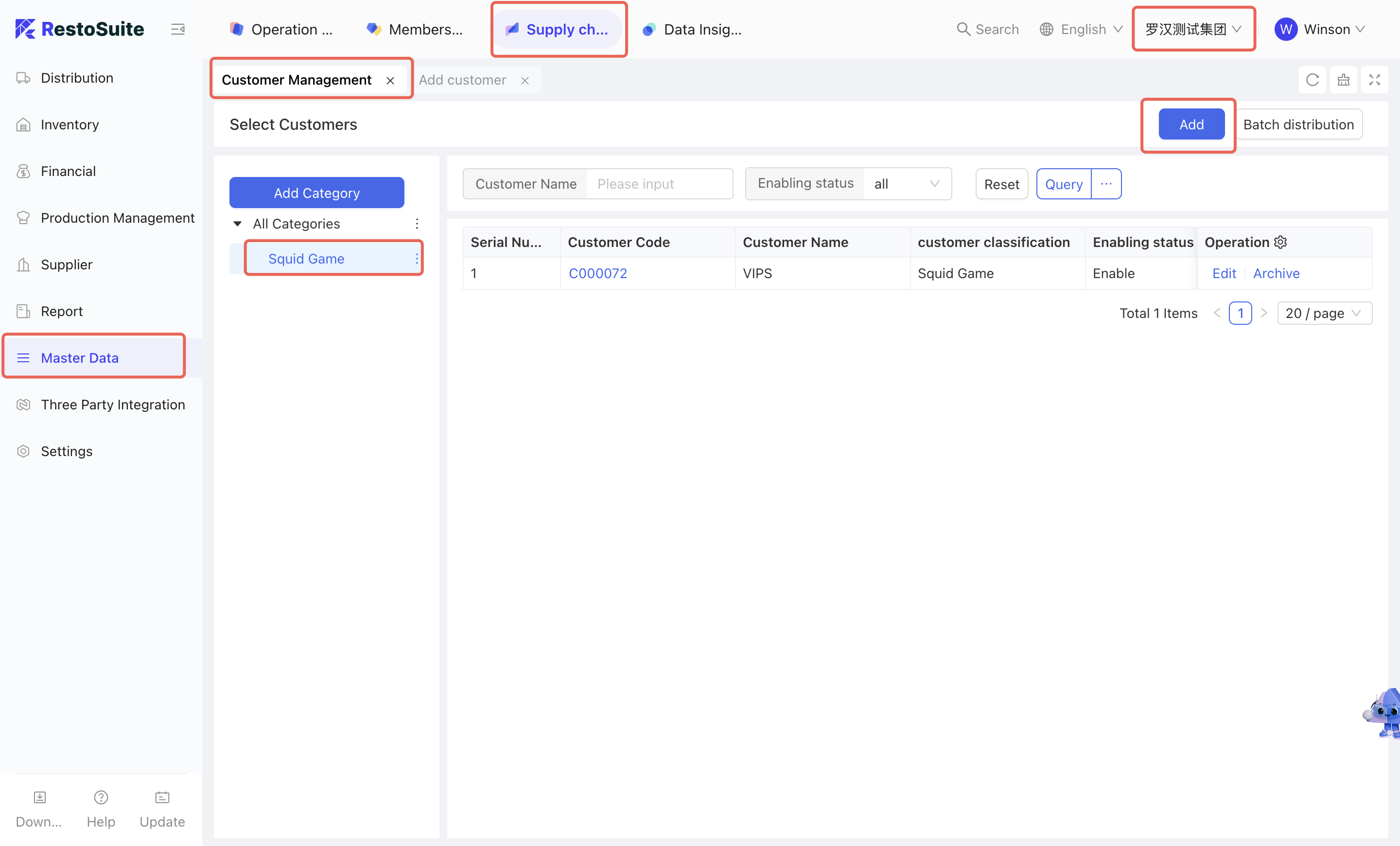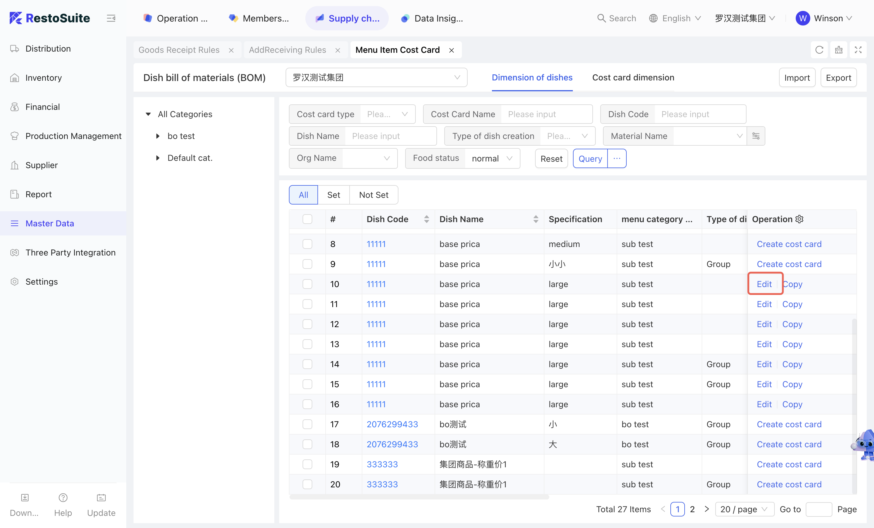 As the foundational data hub of the supply chain, Master Data Management integrates Organization Settings, Material Management, Warehouse Management, Receiving Rules, Menu Item Cost Cards, and Customer Management. By centralizing the creation and maintenance of basic data, this module empowers the group to achieve unified oversight and control across the entire supply chain system.