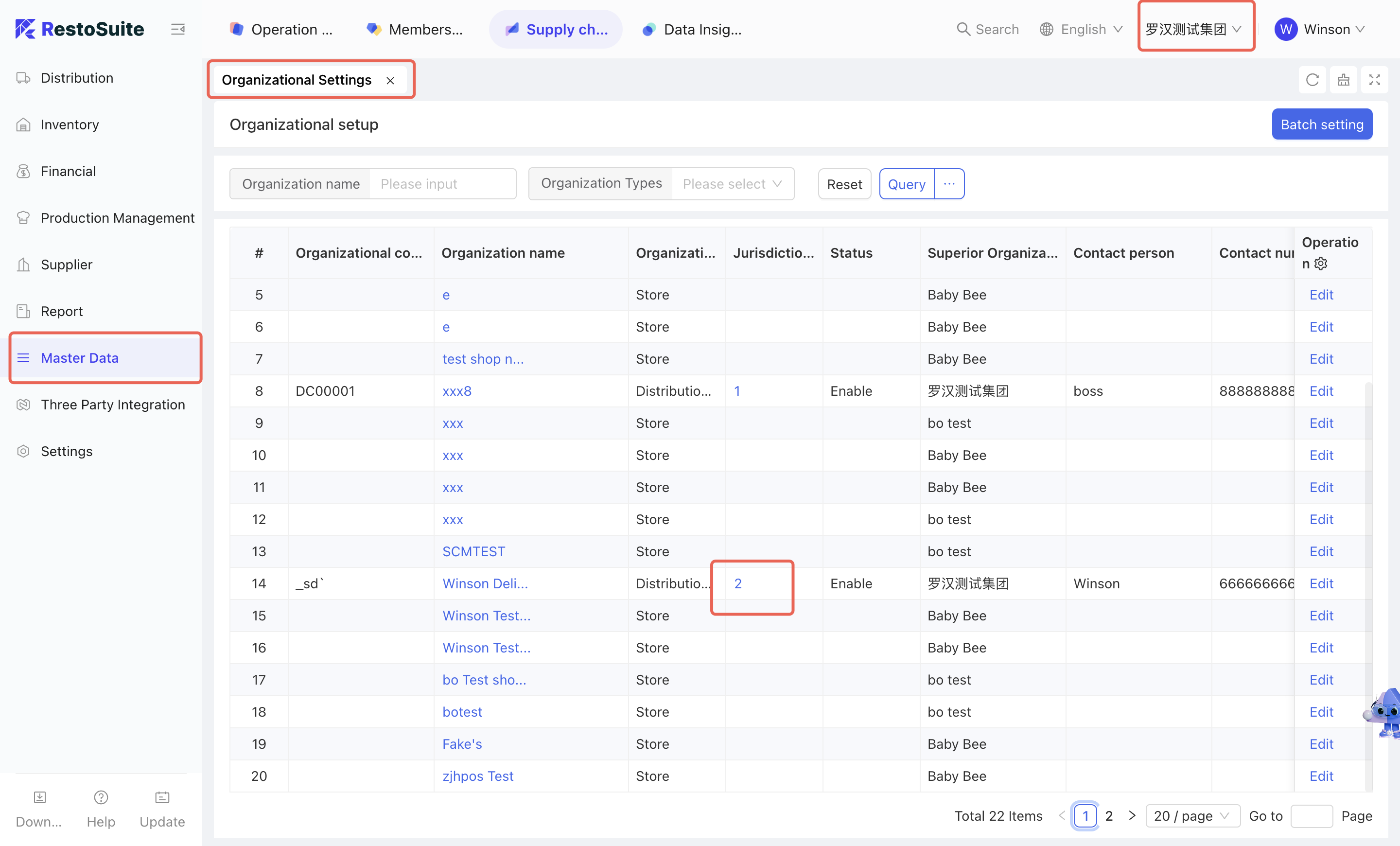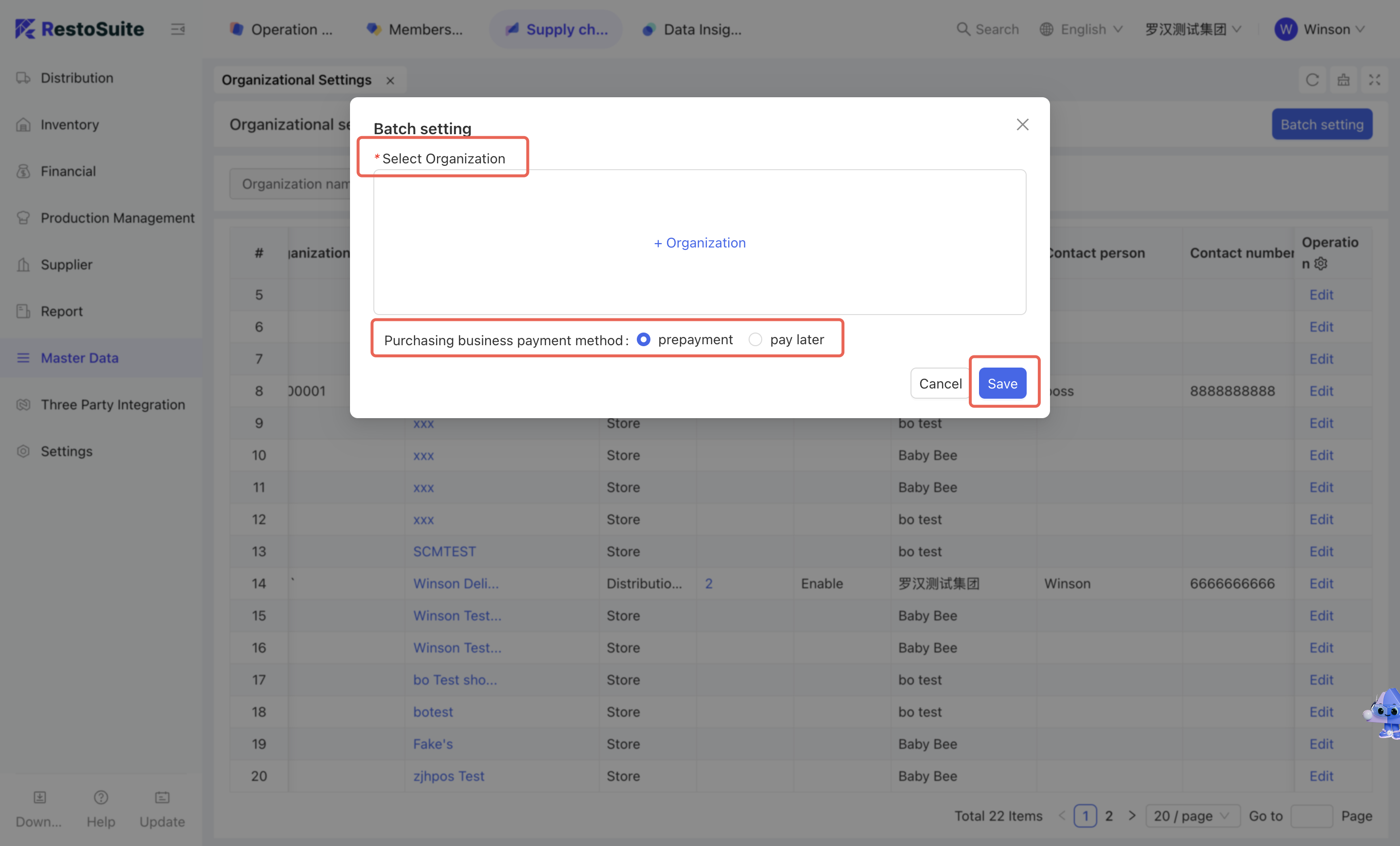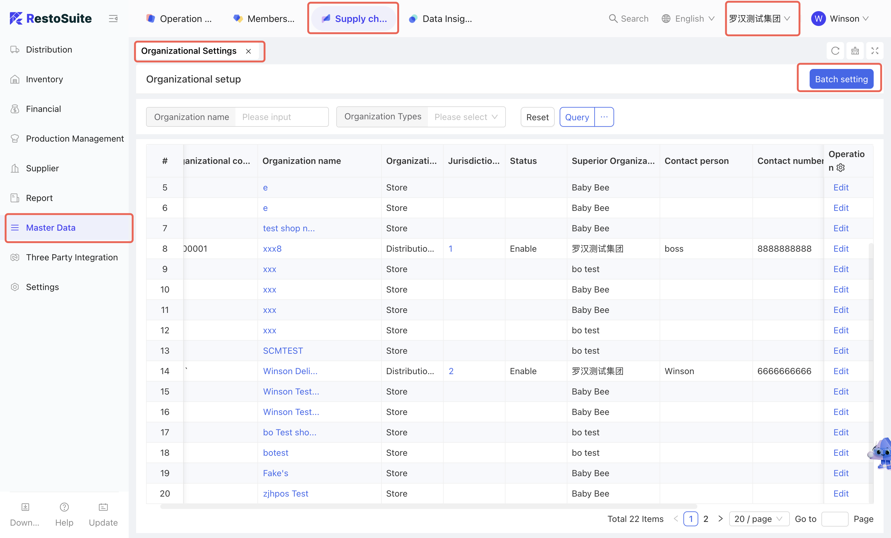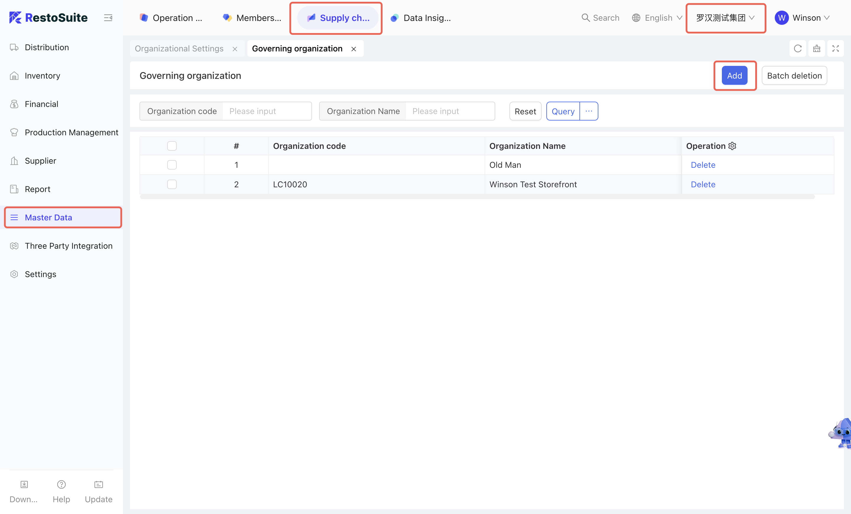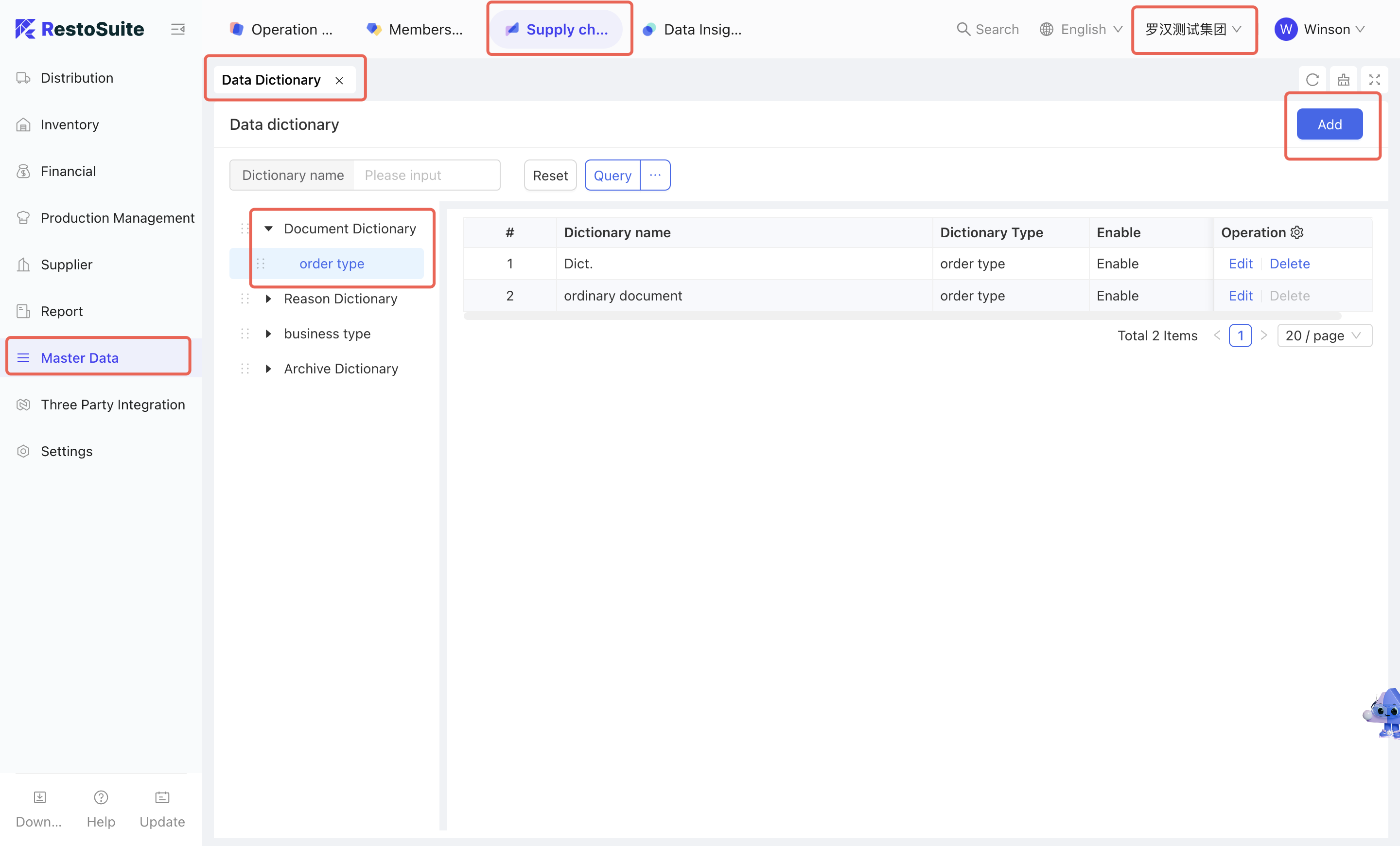 As the foundational data hub of the supply chain, Master Data Management integrates Organization Settings, Material Management, Warehouse Management, Receiving Rules, Menu Item Cost Cards, and Customer Management. By centralizing the creation and maintenance of basic data, this module empowers the group to achieve unified oversight and control across the entire supply chain system.