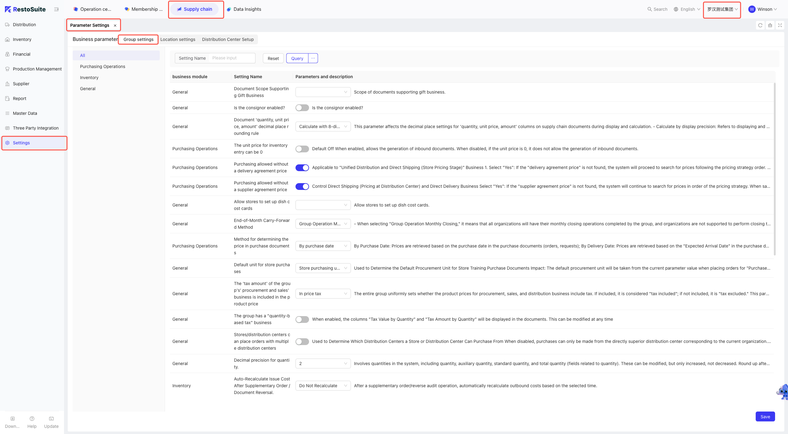 - [Group Perspective - Supply Chain Module - System Settings - Parameter Settings]