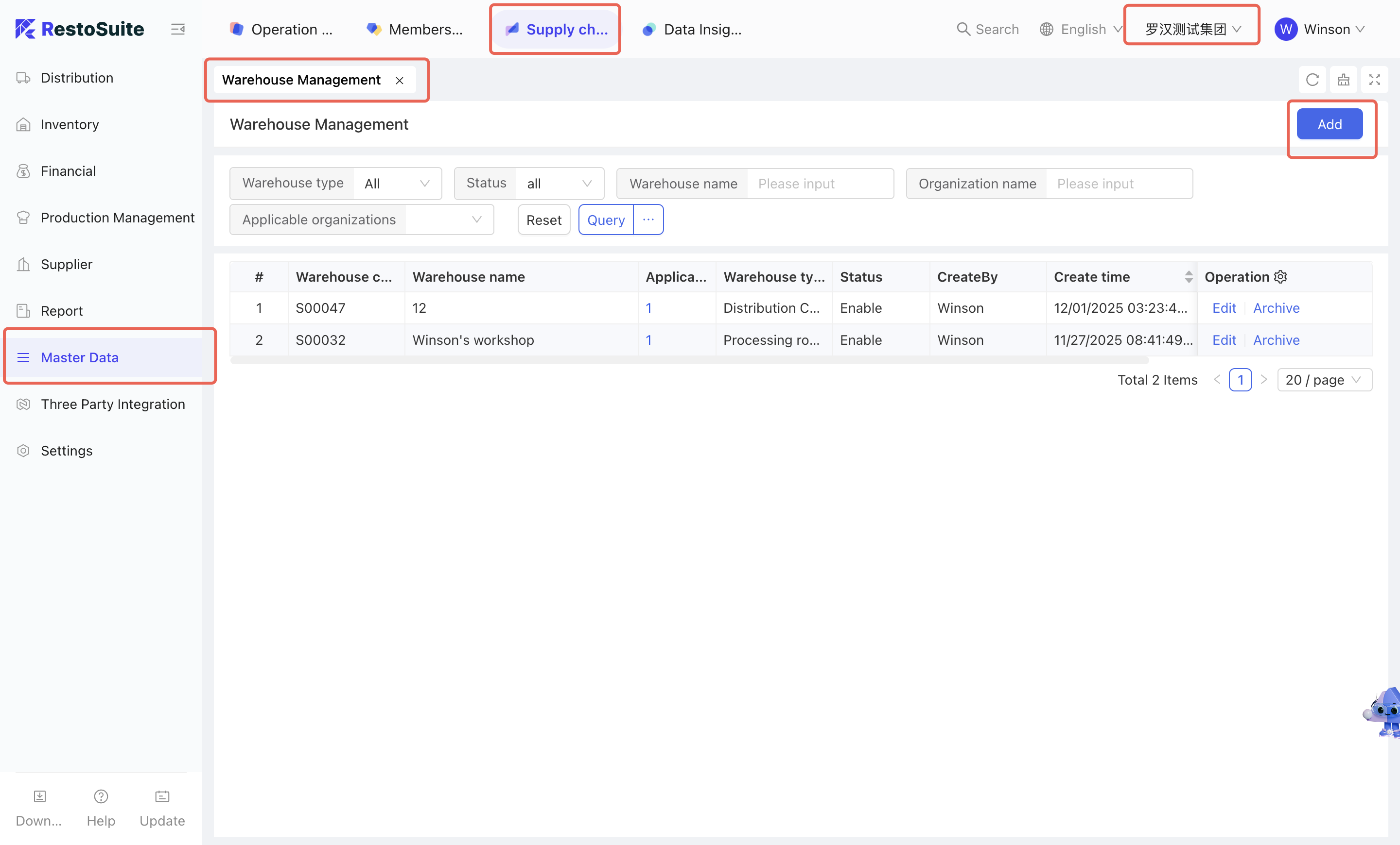 The warehouse management function supports the creation, deletion, and modification of distribution center warehouses, store warehouses, and processing workshops, meeting the inventory organization management needs of distribution centers and stores.