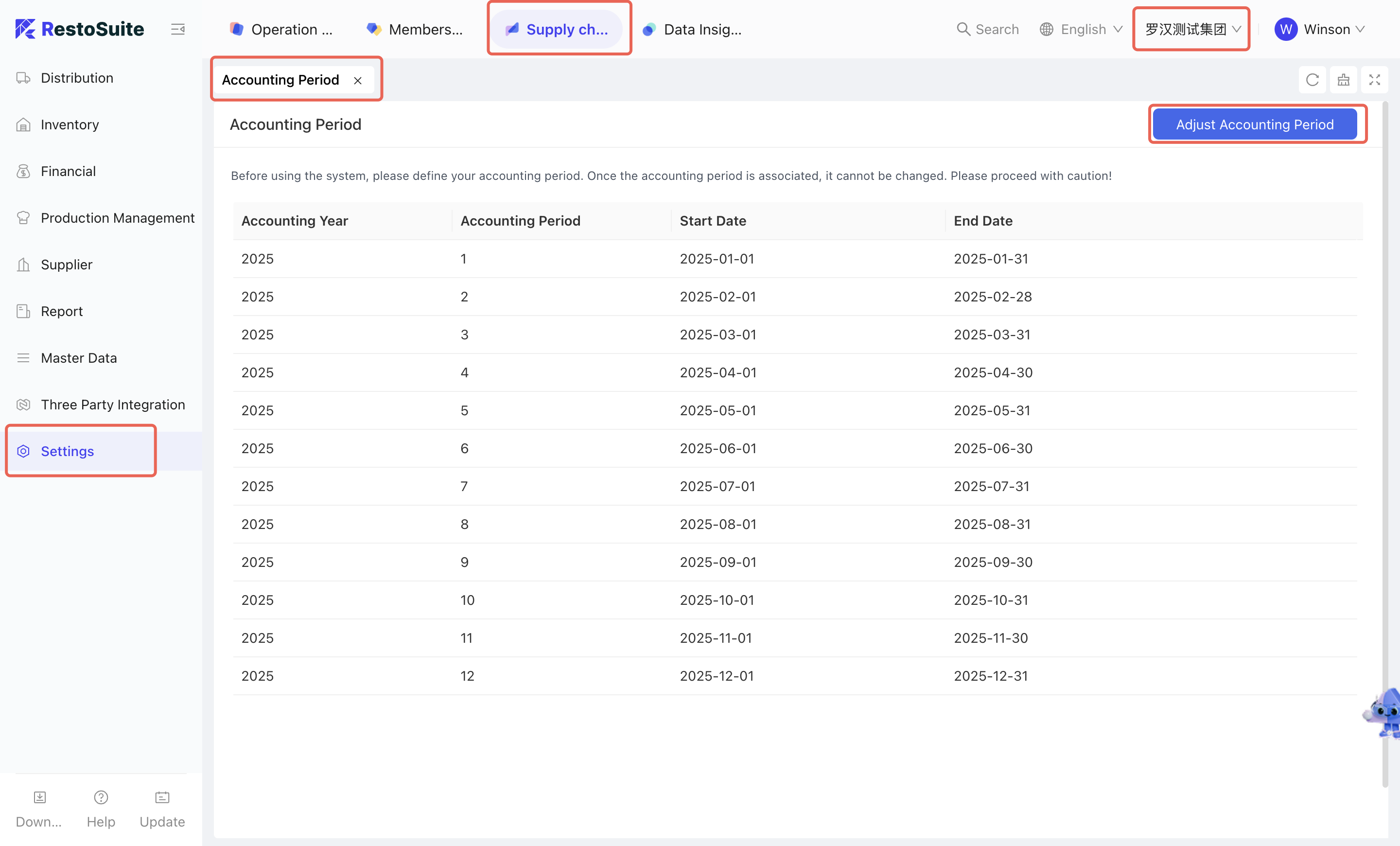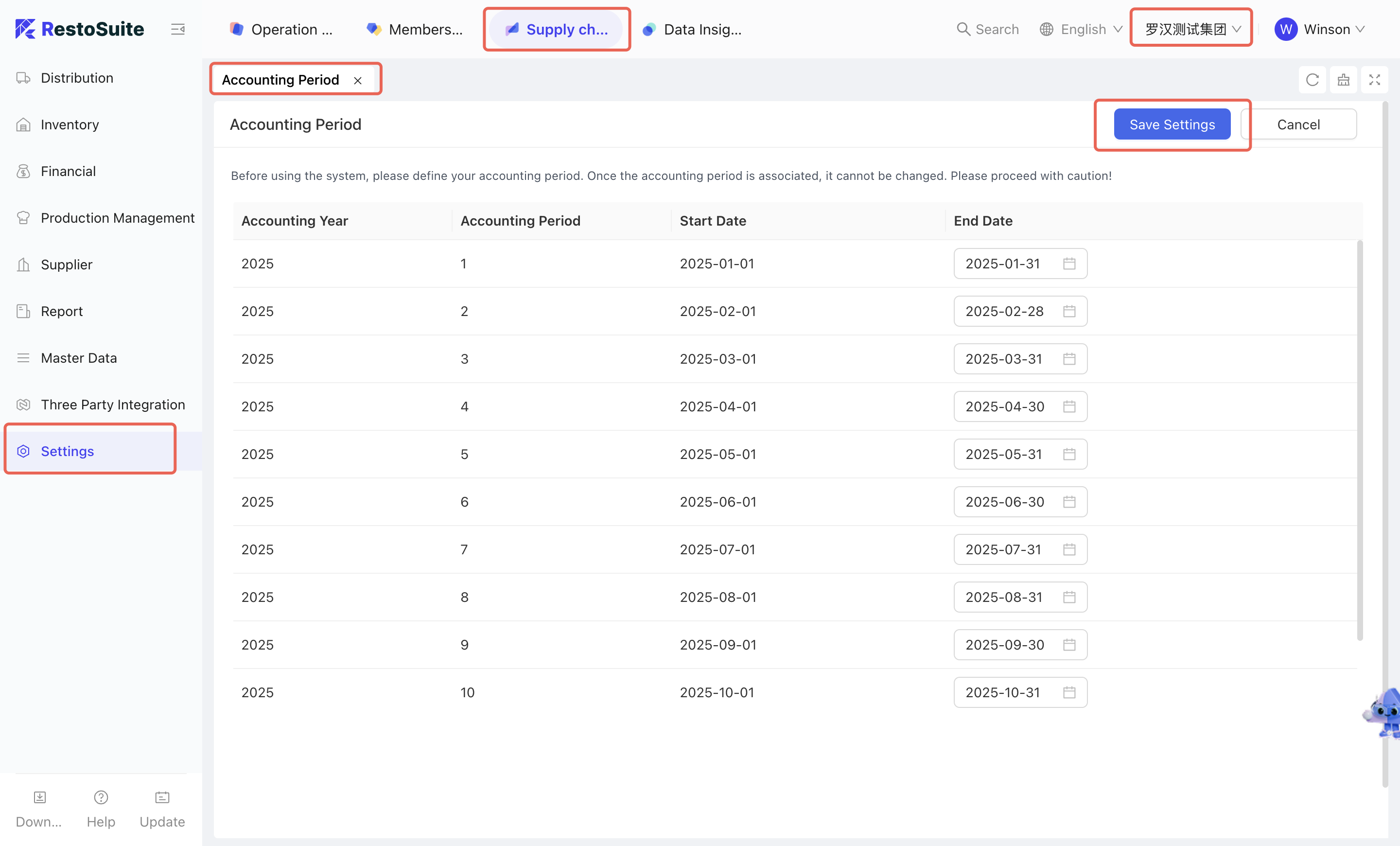 - [Group Perspective - Supply Chain Module - System Settings - Accounting Period]