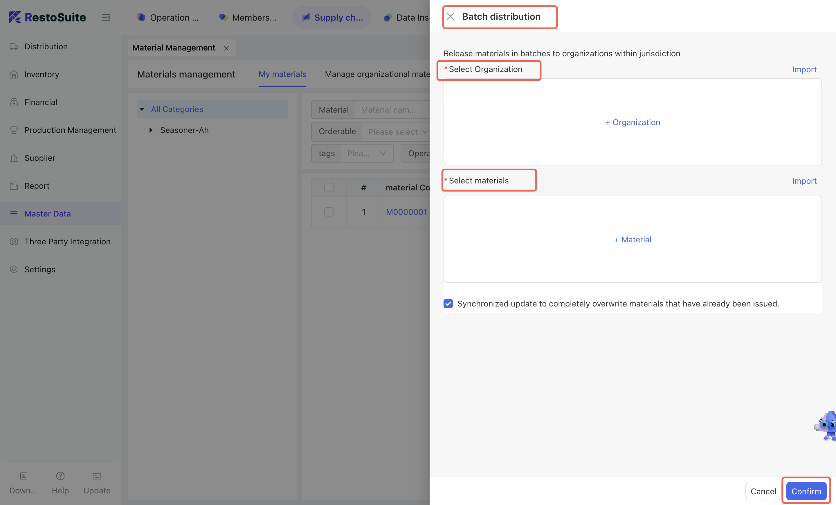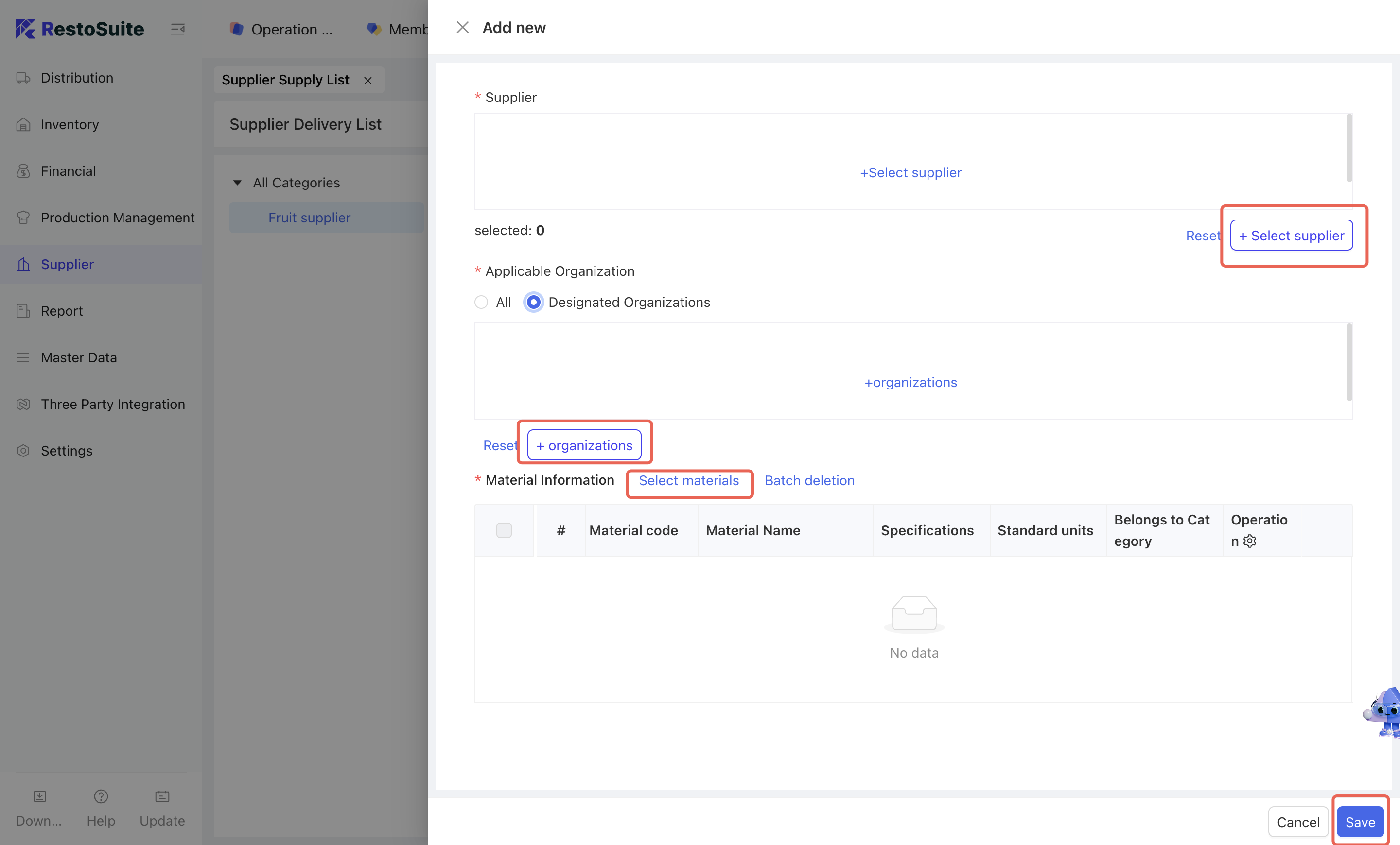 - Click [Add New] → Select the supplier to be maintained → Select the involved organization → Select the materials to be allocated → Click [Confirm].