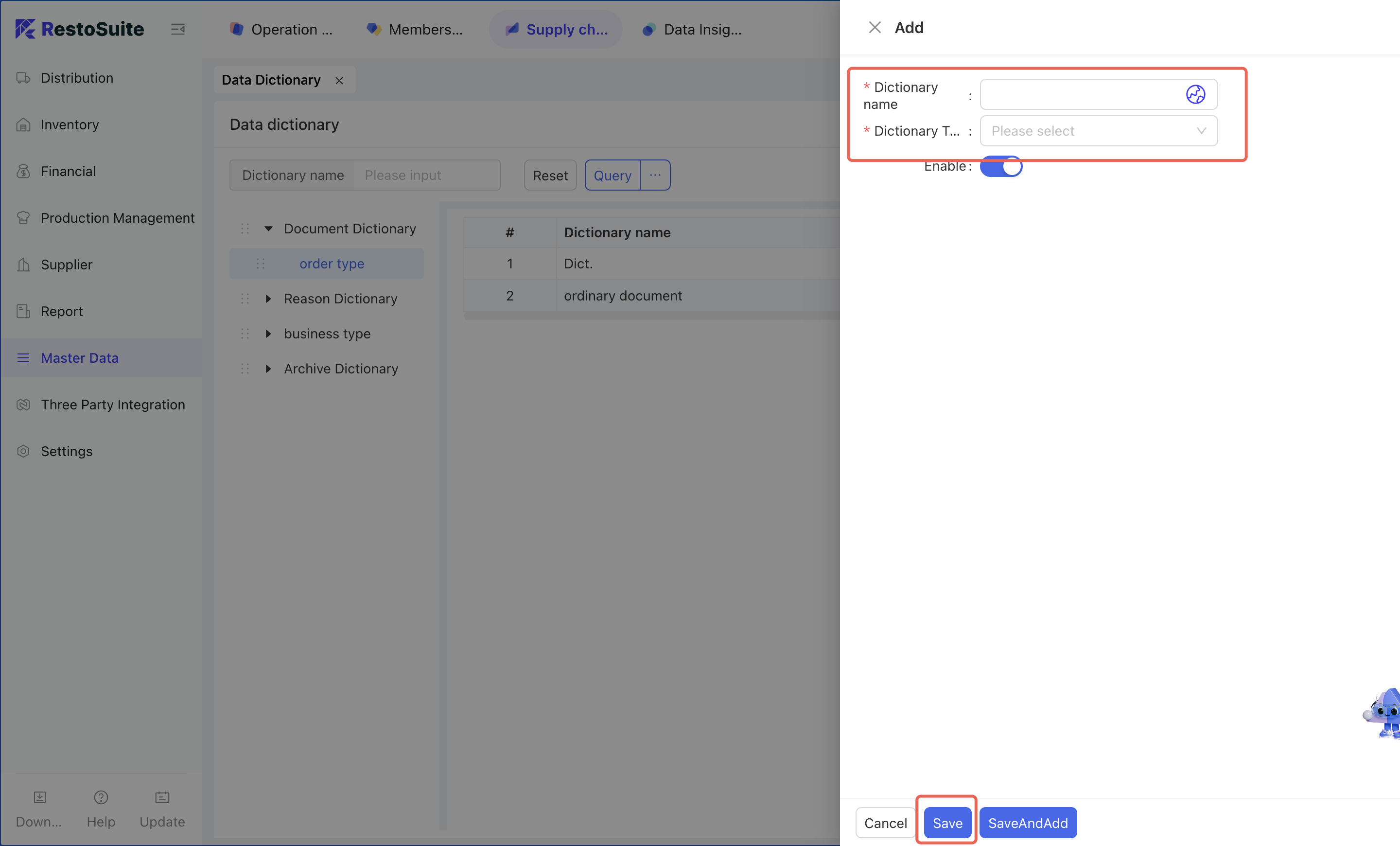 - Select the dictionary type to be added → Click [Add] → Enter the dictionary name and select the dictionary type → Click [Save].