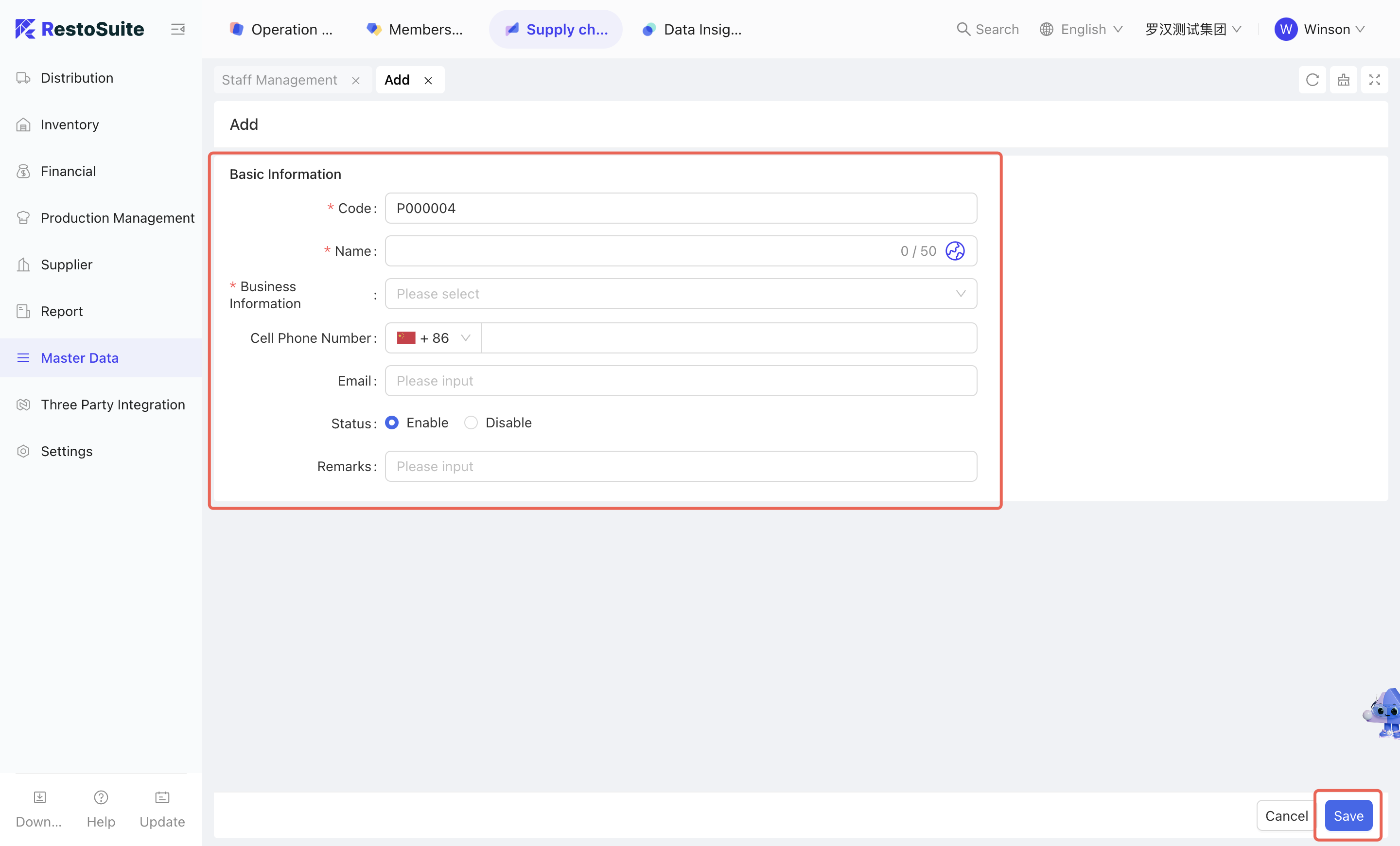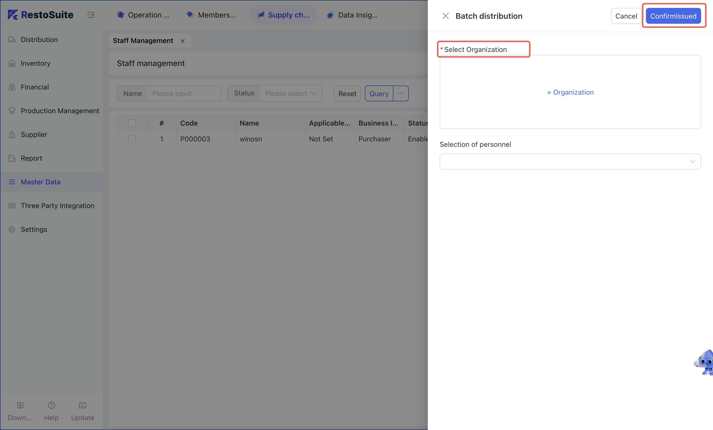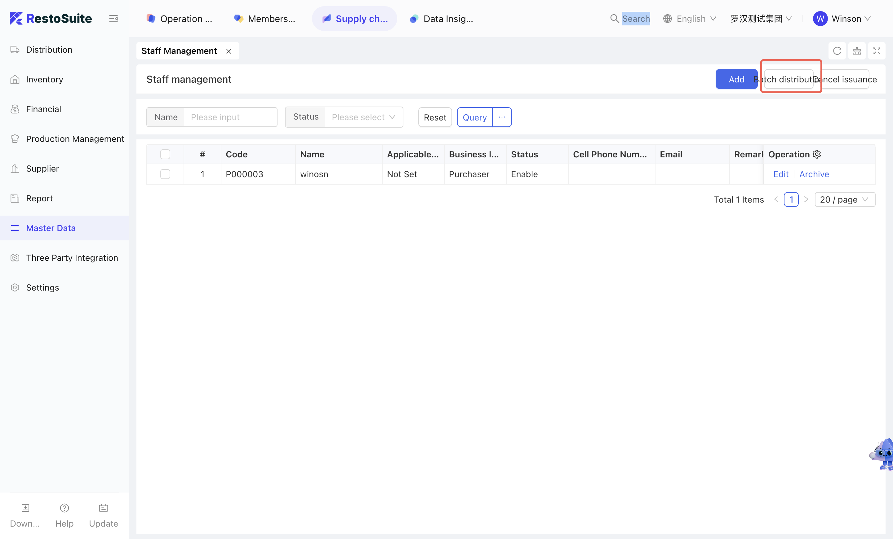 - Click [Create] → Fill in basic information → Click [Save] → Check the corresponding Staff information → Click [Batch Distribution] to distribute to the organizations that need to use the Staff.