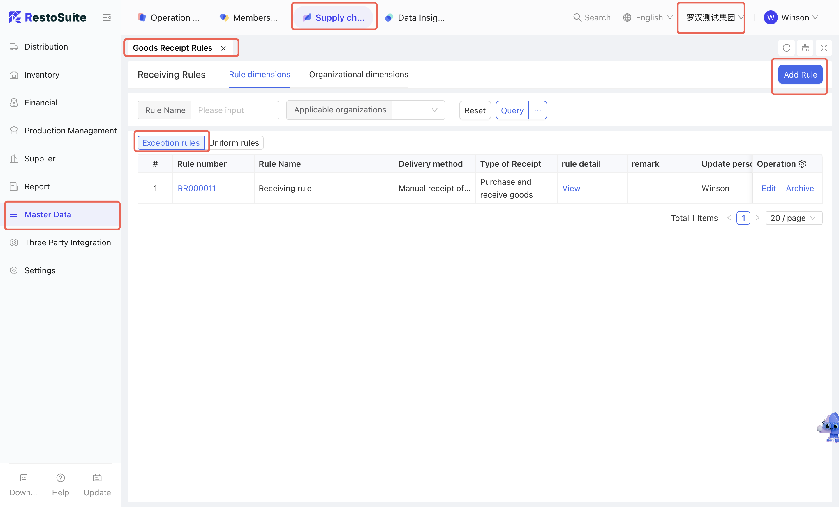 - Select [Group Perspective - Supply Chain Module - Master Data Management - Receiving Rules]