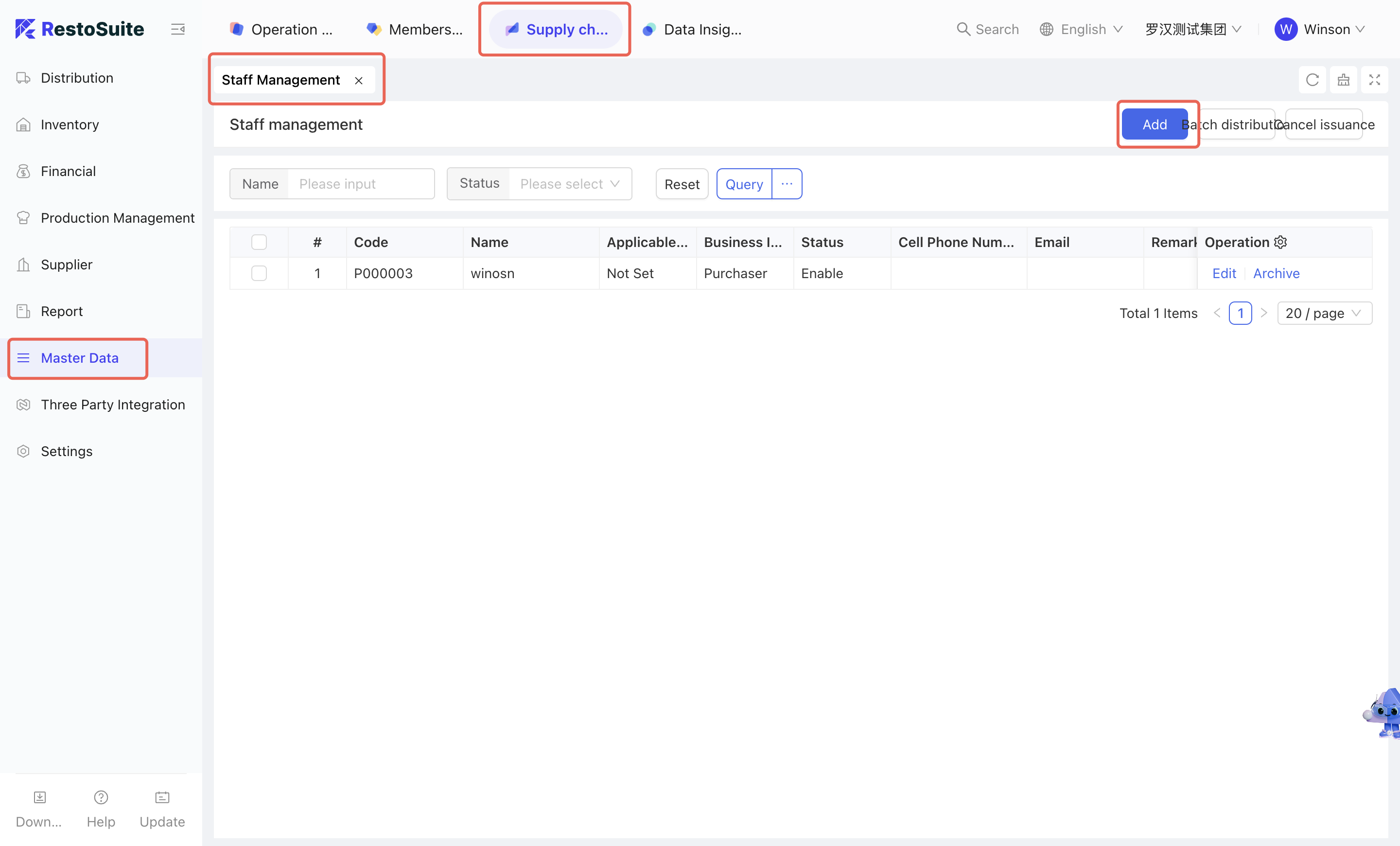 - Select [Group Perspective - Supply Chain Module - Master Data Management - Staff Management]